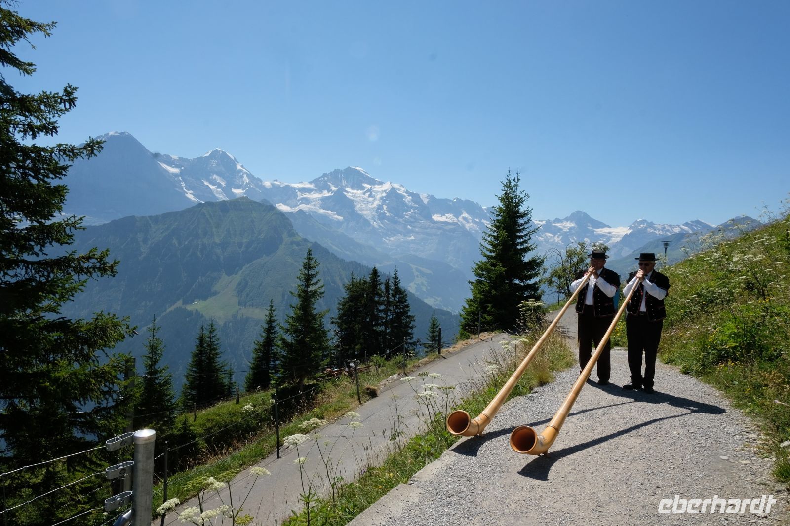 Heute erwartet uns ein weiteres Bahnerlebnis, welches uns ins Berner Oberland nach Wilderswil führte. Hier bestiegen wir die liebevoll gepflegte, nostalgische, elektrische Zahnradbahn und fuhren auf die Schynige Platte auf 1960 Meter. Sonnenschein begleitete die Auffahrt und auf der Bergstation angekommen, hatten wir eine herrliche Sicht auf das Dreigestirn mit Eiger, Mönch und Jungfrau. Die Fotoapparate und die Filmkameras liefen heiß. Viele Gäste unternahmen einen ausgiebigen Spaziergang durch den sehr schön angelegten Alpengarten. Über 650 verschiedene Pflanzen sind hier zu bewundern. Traumhafte Aussichten begleiteten diesen Rundgang. Am Nachmittag kehrten wir wieder nach Wilderswil zurück und fuhren in den nahegelegenen Ort Interlaken. Interlaken ist mittlerweile ein international anerkannter Ferienort und wichtiger Ausgangspunkt für das Jungfraujoch. Jeder von uns unternahm einen kleinen Spaziergang durch den mondänen Ferienort. Wir bemerkten allerdings, dass Interlaken noch ein wenig unter Corona leidet. Es sind viele Geschäfte geschlossen und nur einige Touristen aus dem arabischen Raum waren auf der Straße zu sehen. Am späten Nachmittag kehrten wir zurück zum Hotel und genossen das anschließende Abendmenü.