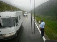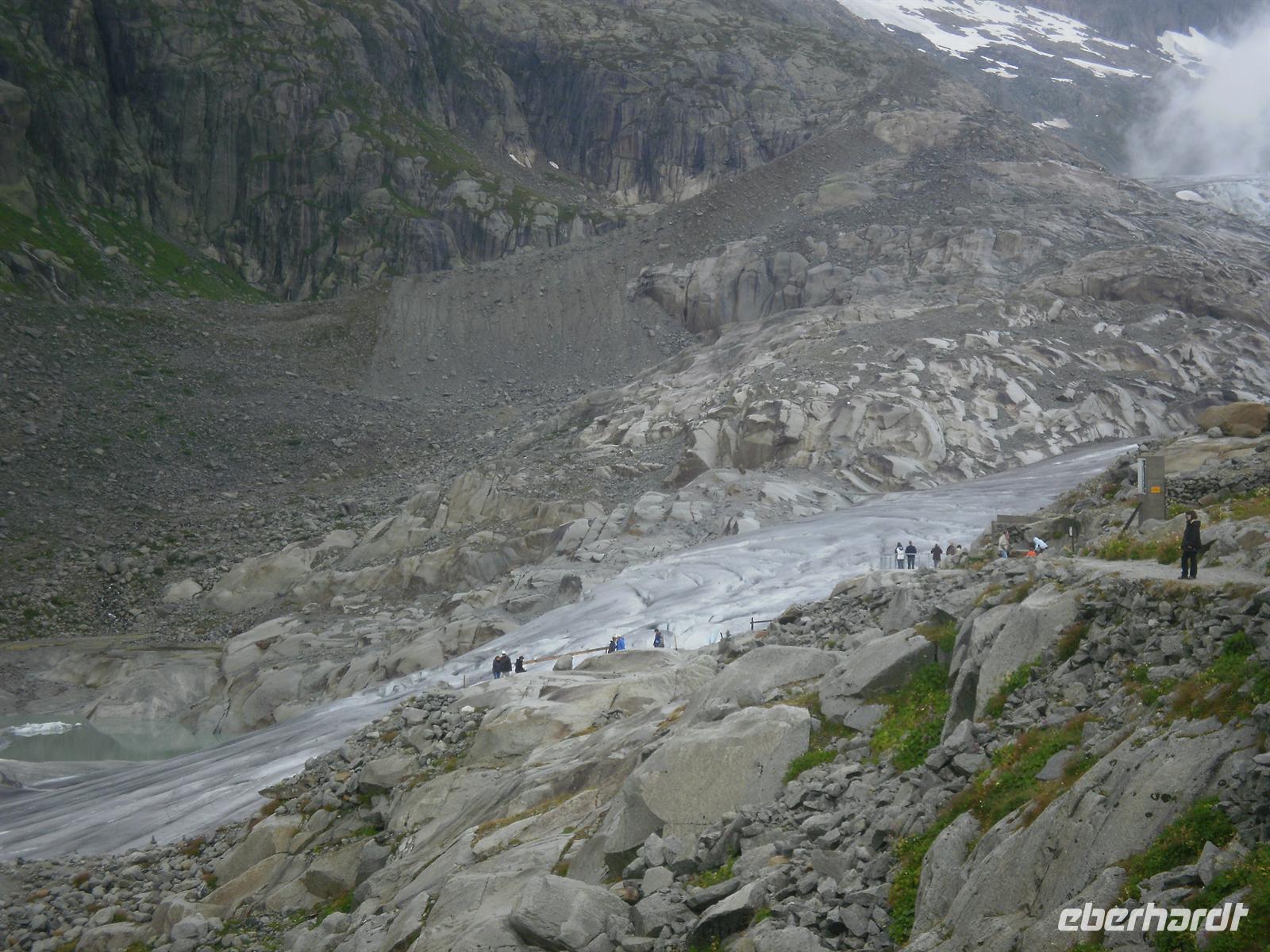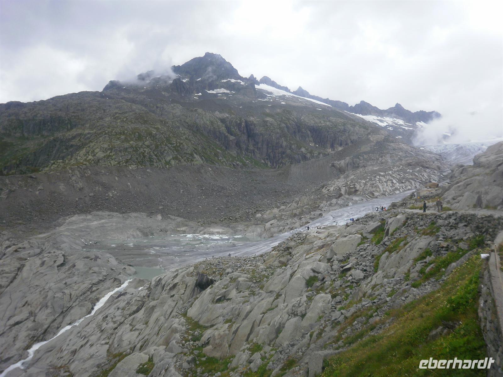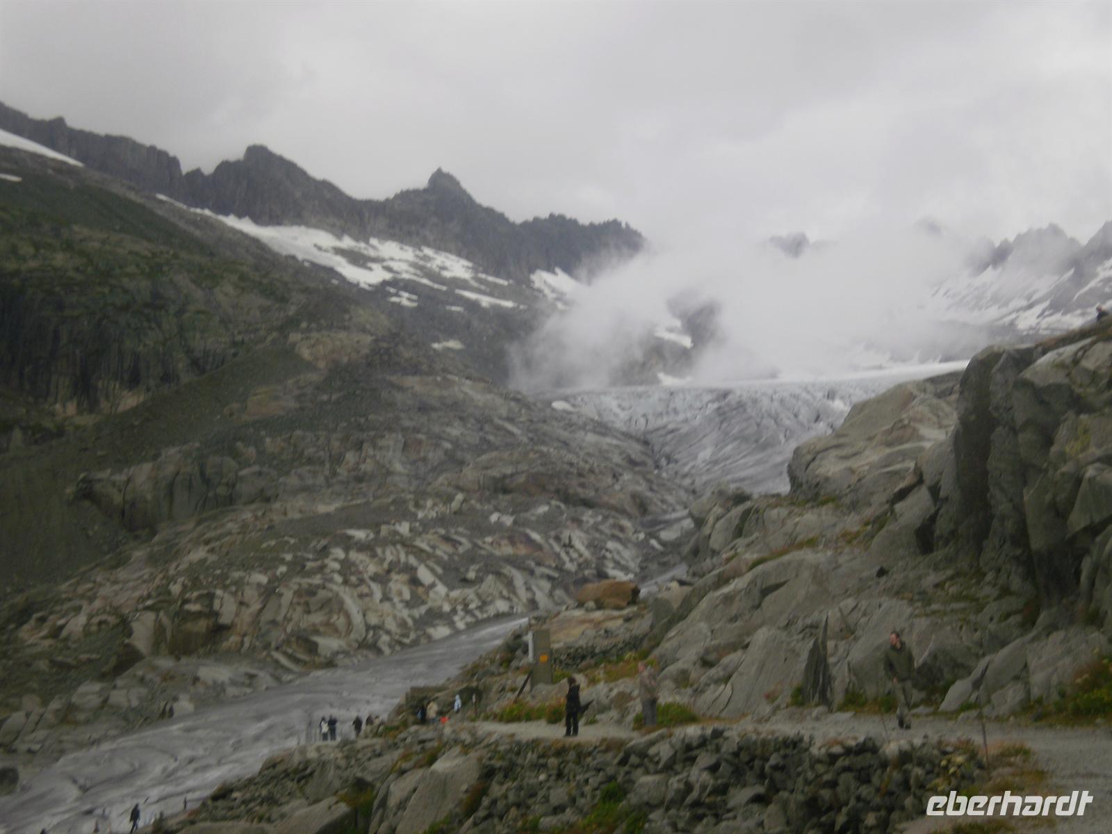 Aus Vietnam wurden alte Damplokomotiven der Furka-Oberalp-Bahn in die Schweiz zurückgeholt. Sie waren bereits 1947 in den Fernen Osten verkauft worden. Schrittweise gelang die Wiederherstellung der Strecke bis Gletsch. 1992 konnte die Strecke von Realp nach Tiefenbach neu eröffnet werden und bereits ein Jahr später dampften die Züge wieder bis zur Station Furka. Und im Jahr 2000 war es dann endlich so weit - durch den 1,8 Kilometer langen Furka-Scheiteltunnel fuhren die Züge weiter ins Wallis bis nach Gletsch. Und an diesem Wochenende, also nochmals 10 Jahre später, war es erneut soweit - der letzte Streckenabschnitt hinunter nach Oberwald wurde feierlich eröffnet. Was für ein Zufall - denn ausgerechnet wir waren bei den Feierlichkeiten vor Ort und selbstverständlich war auch unsere Dampflok festlich geschmückt. Die Stimmung wurde einzig allein durch das Wetter getrübt, denn ausgerechnet bei unserer Ankunft in Gletsch regnete es wieder mal und somit hatte keiner von uns wirklich Ambitionen, an den Festlichkeiten teilzunehmen. Unser Bus erwartete uns und wir fuhren erst einmal auf den 2165 Meter hohen Grimselpass hinauf. Auf der Passhöhe schauten sich die meisten von uns im Murmeltierpark um - wie niedlich! Auf dem Weg zur Furka-Passhöhe planten wir einen längeren Aufenthalt am Rhonegletscher ein.