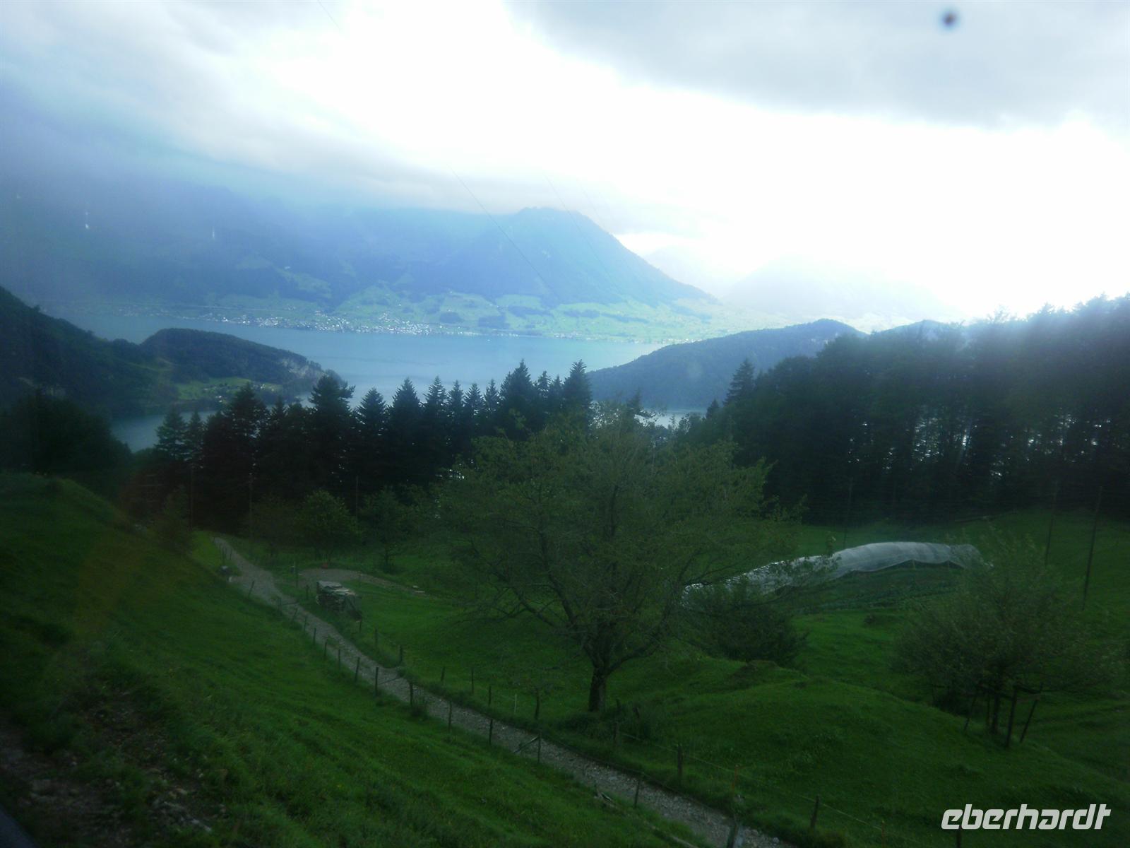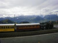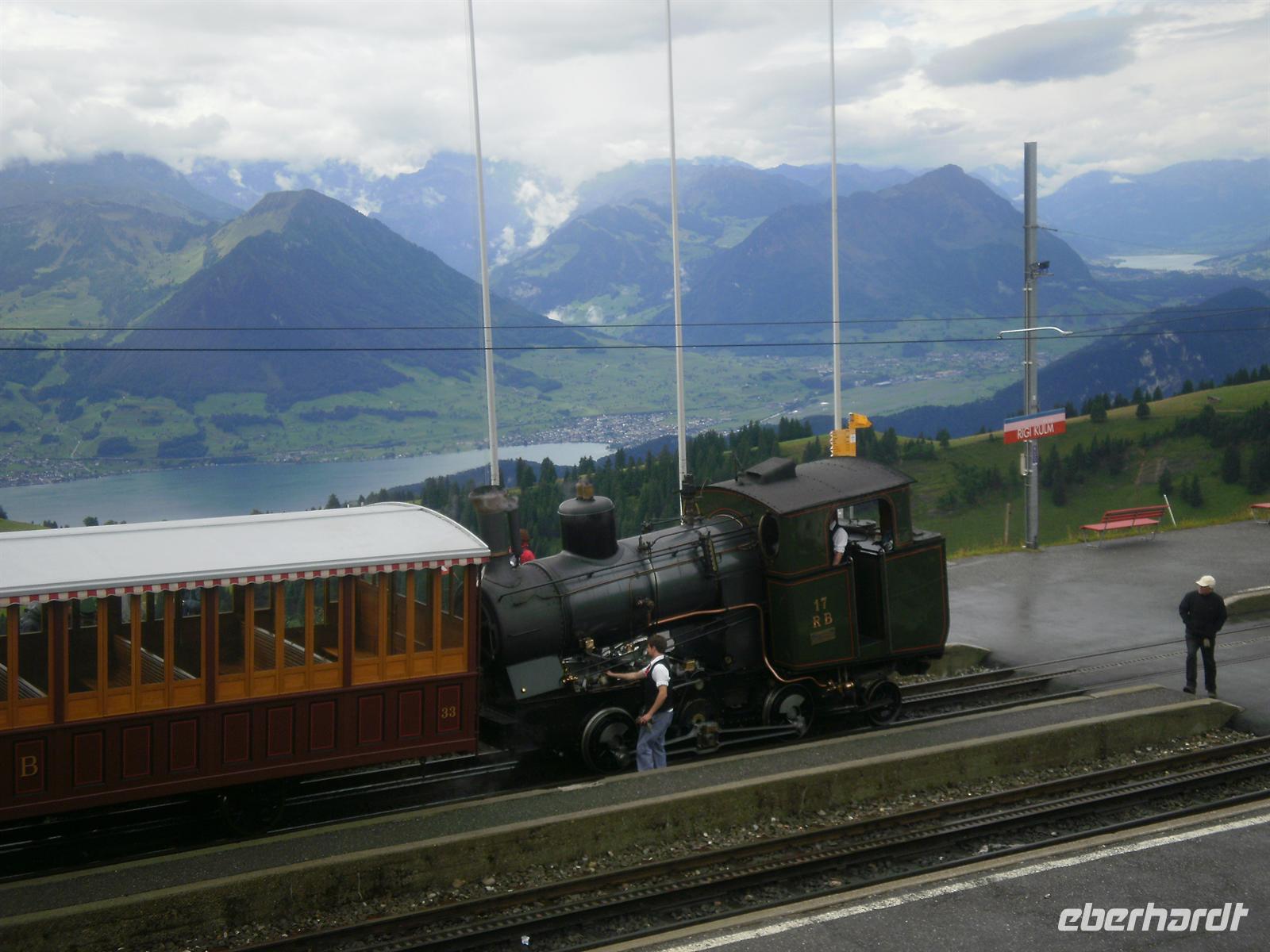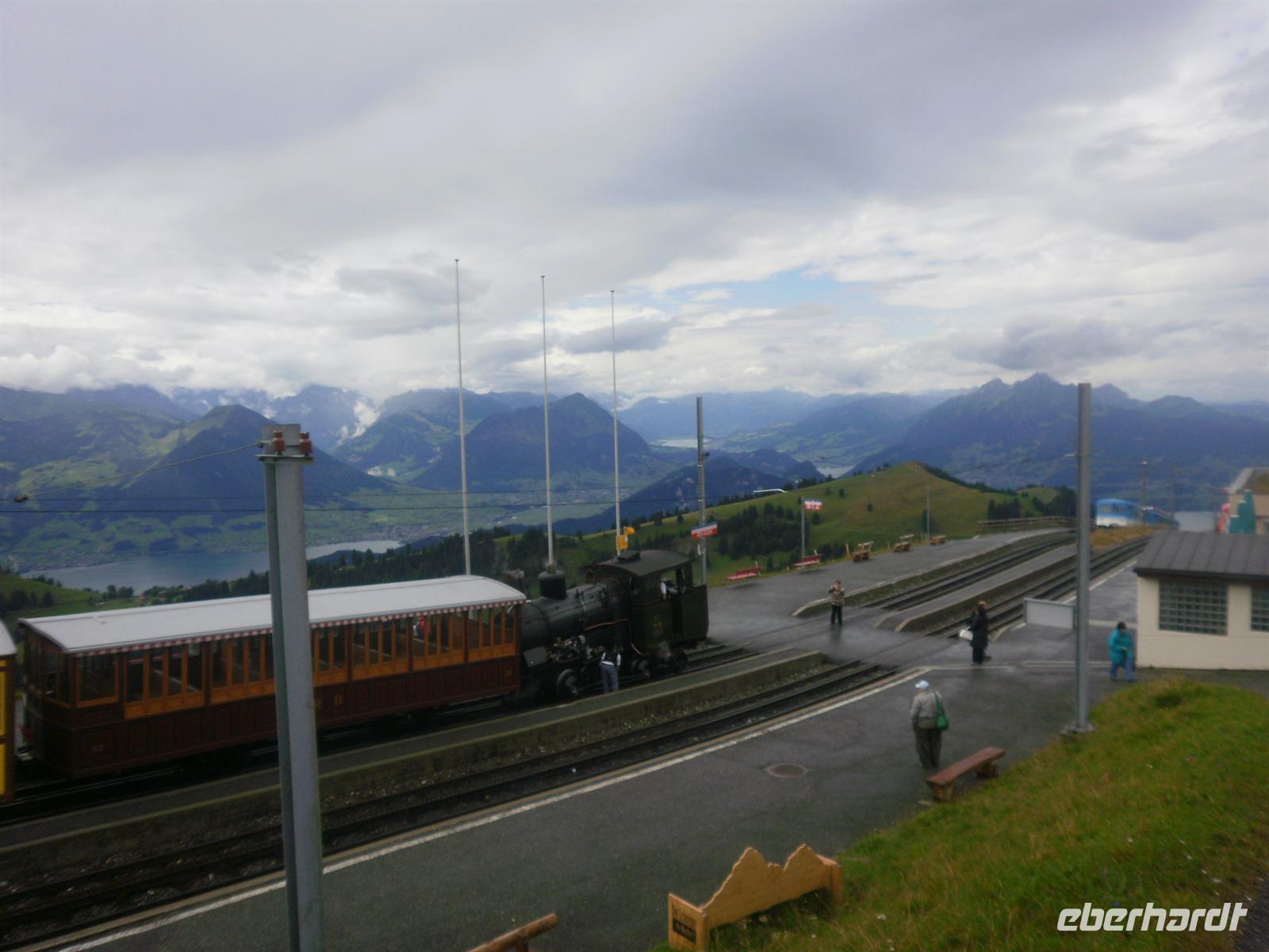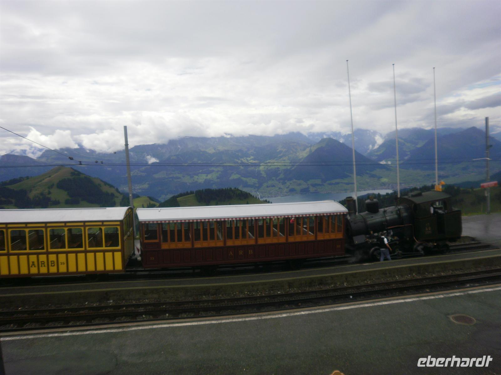 Der Bahnhof in Goldau war schließlich unser Ausgangspunkt zur Dampfbahnfahrt auf die Rigi. Die Rigi ist übrigens ein Bergmassiv zwischen dem Vierwaldstättersee, dem Zugersee und dem Lauerzersee. Höchster Gipfel ist mit einer Höhe von knapp 1800 Metern über dem Meer die Rigi-Kulm, ein beliebtes Ausflugsziel. Der Berg wir oft auch als "Königin der Berge" bezeichnet. Die Ingenieure Riggenbach und Zschokke bauten die zahnradbetriebene Arth-Rigi-Bahn. Diese konnte am 4. Juni 1875 den Betrieb aufnehmen. Bereits 1907 folgte die Eröffnung des elektrischen Betriebes auf der Bergstrecke Goldau-Kulm. Diese Umstellung war eine echte Pionierleistung, denn die Arth-Rigi-Bahn war die erste normalspurige Zahnradbahn der Schweiz, die auf elektrische Traktion umstellte. Wir benötigten für die reichlich 8 Kilometer lange Strecke knapp zwei Stunden, denn unsere Dampflok brauchte ab und an eine Pause und mußte Wasser tanken. Am Mittag erreichten wir schließlich Rigi-Kulm - entgegen unserer Erwartungen ohne Regen und mit recht guter Sicht auf die umliegenden Berge! Nach einem längeren Aufenthalt auf der Rigi fuhren wir mit der Rigi-Bahn nach Vitznau am Vierwaldstättersee.