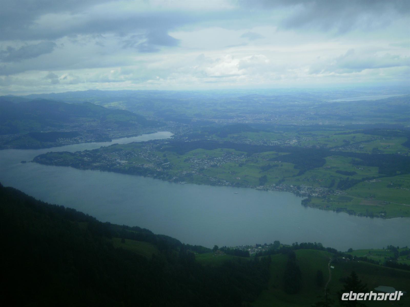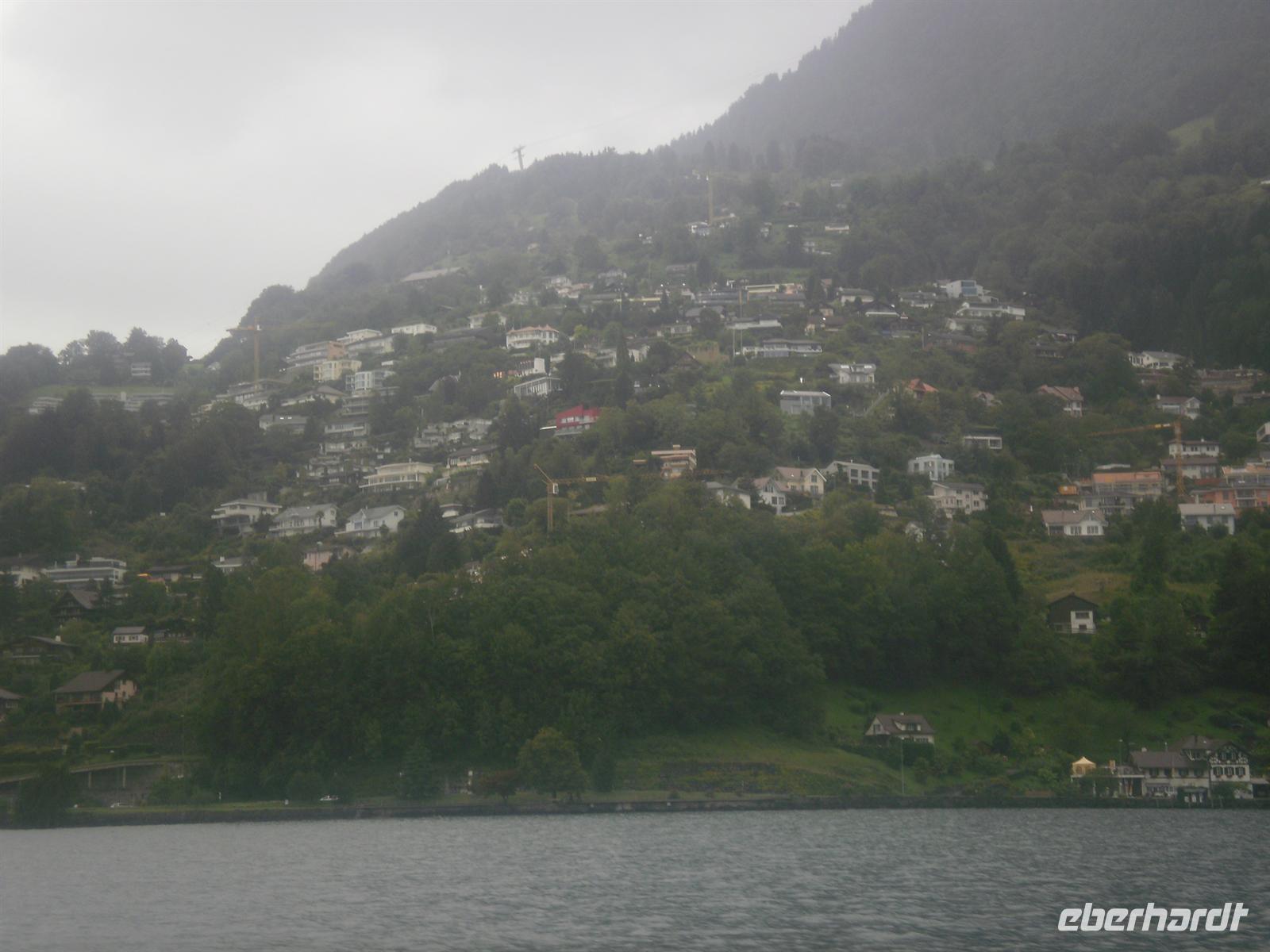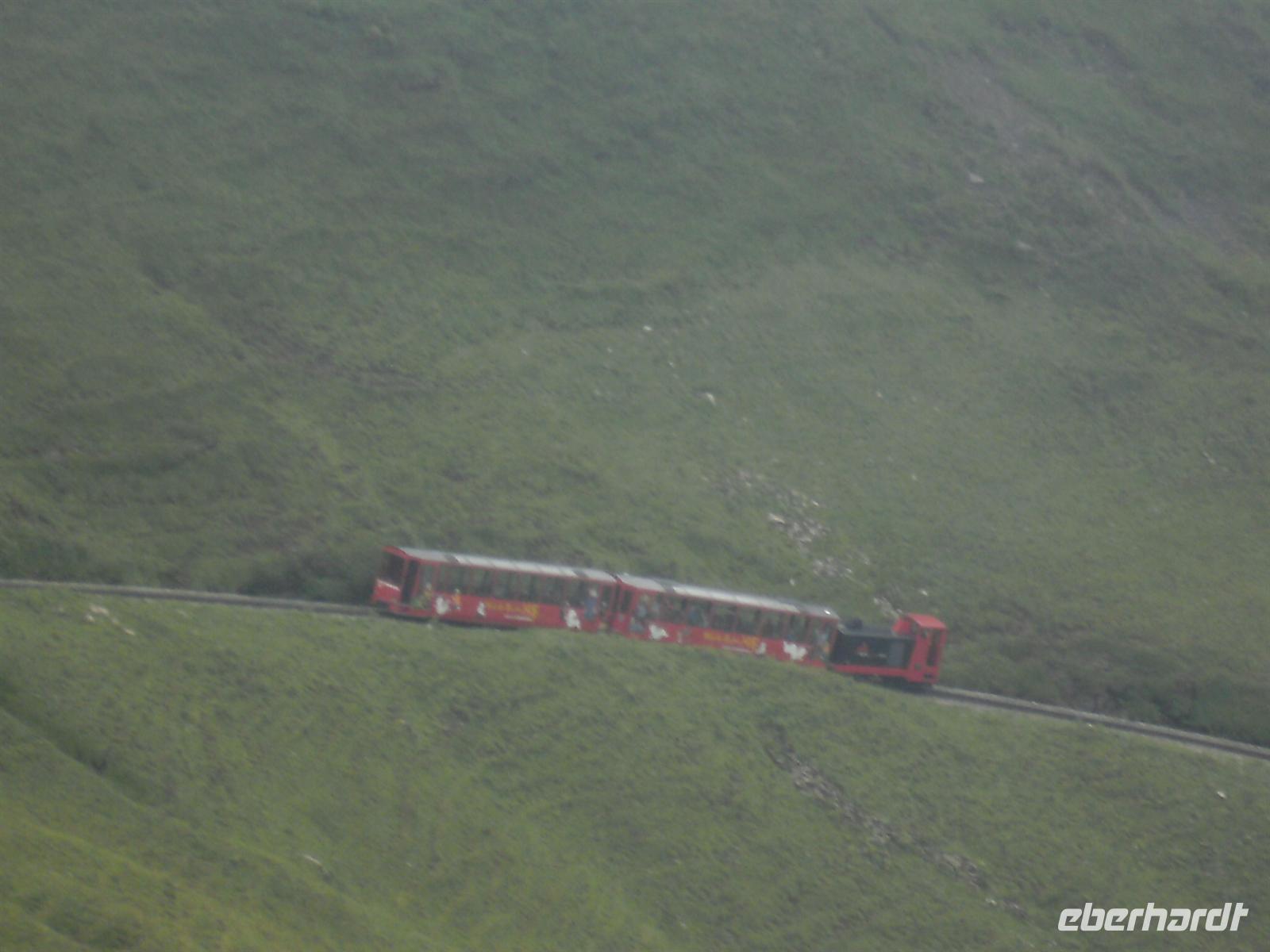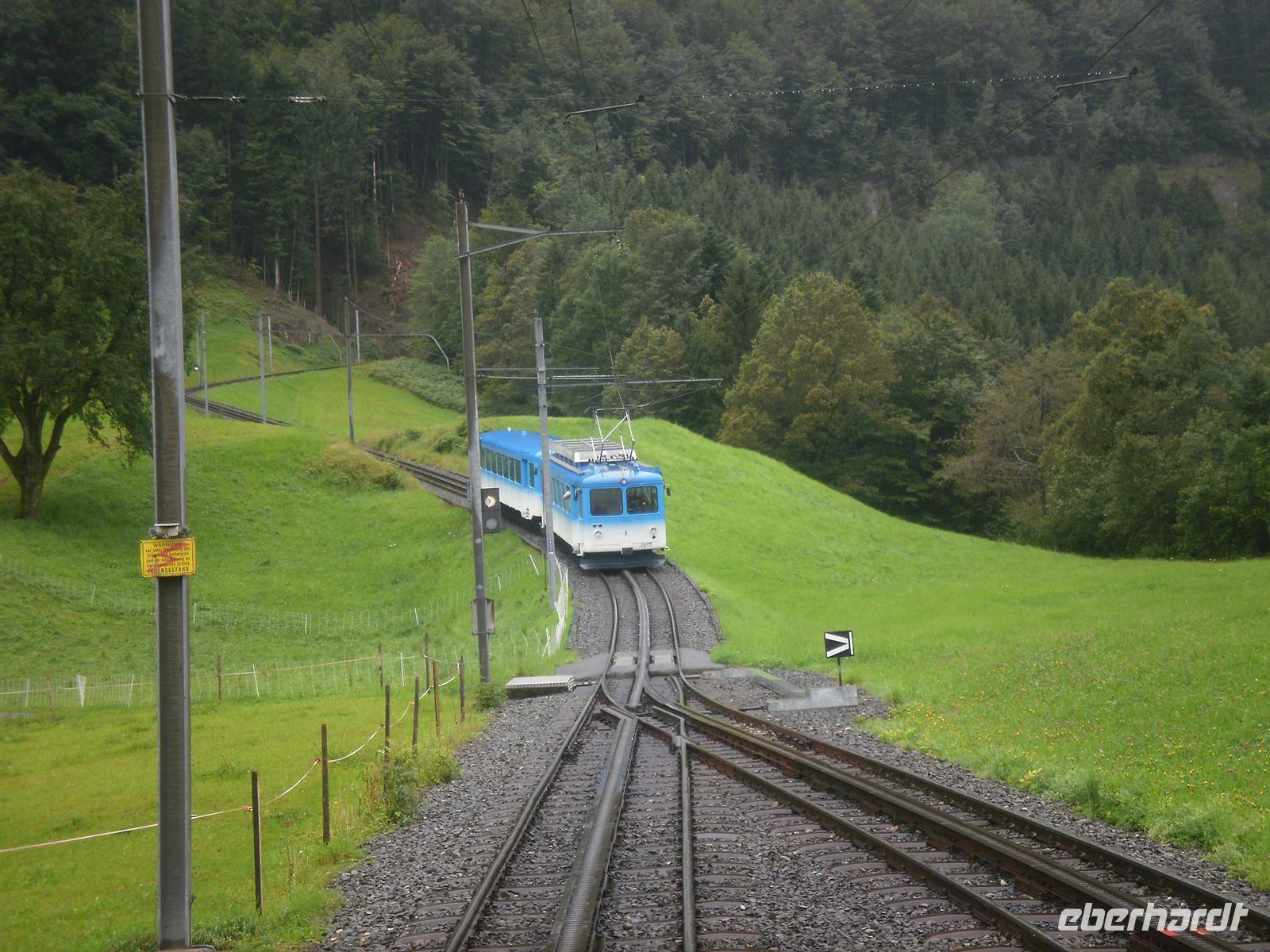 Der Bahnhof in Goldau war schließlich unser Ausgangspunkt zur Dampfbahnfahrt auf die Rigi. Die Rigi ist übrigens ein Bergmassiv zwischen dem Vierwaldstättersee, dem Zugersee und dem Lauerzersee. Höchster Gipfel ist mit einer Höhe von knapp 1800 Metern über dem Meer die Rigi-Kulm, ein beliebtes Ausflugsziel. Der Berg wir oft auch als "Königin der Berge" bezeichnet. Die Ingenieure Riggenbach und Zschokke bauten die zahnradbetriebene Arth-Rigi-Bahn. Diese konnte am 4. Juni 1875 den Betrieb aufnehmen. Bereits 1907 folgte die Eröffnung des elektrischen Betriebes auf der Bergstrecke Goldau-Kulm. Diese Umstellung war eine echte Pionierleistung, denn die Arth-Rigi-Bahn war die erste normalspurige Zahnradbahn der Schweiz, die auf elektrische Traktion umstellte. Wir benötigten für die reichlich 8 Kilometer lange Strecke knapp zwei Stunden, denn unsere Dampflok brauchte ab und an eine Pause und mußte Wasser tanken. Am Mittag erreichten wir schließlich Rigi-Kulm - entgegen unserer Erwartungen ohne Regen und mit recht guter Sicht auf die umliegenden Berge! Nach einem längeren Aufenthalt auf der Rigi fuhren wir mit der Rigi-Bahn nach Vitznau am Vierwaldstättersee.