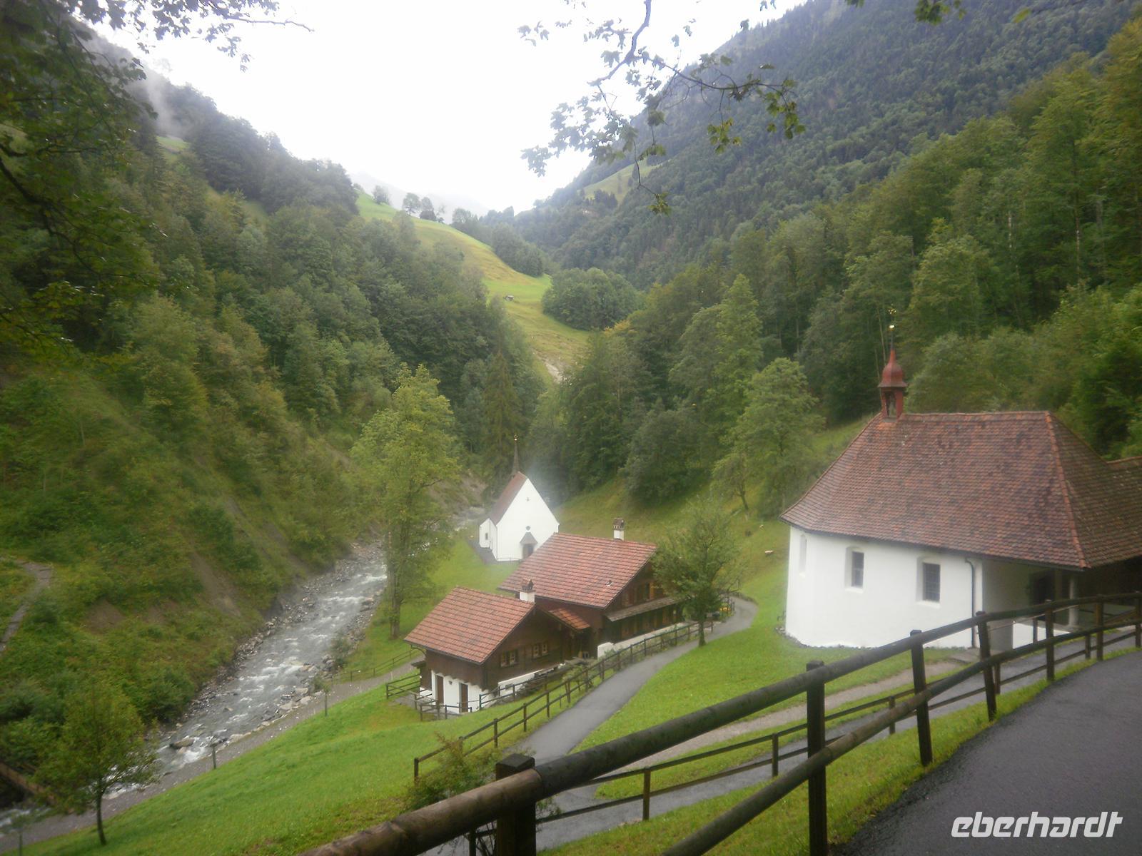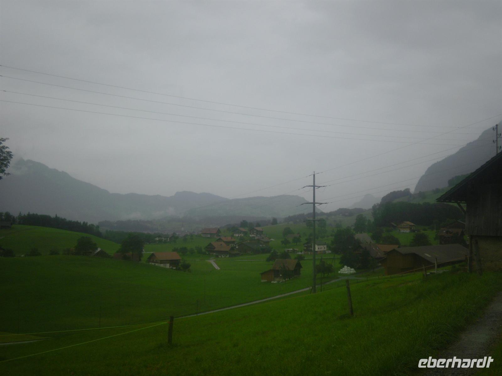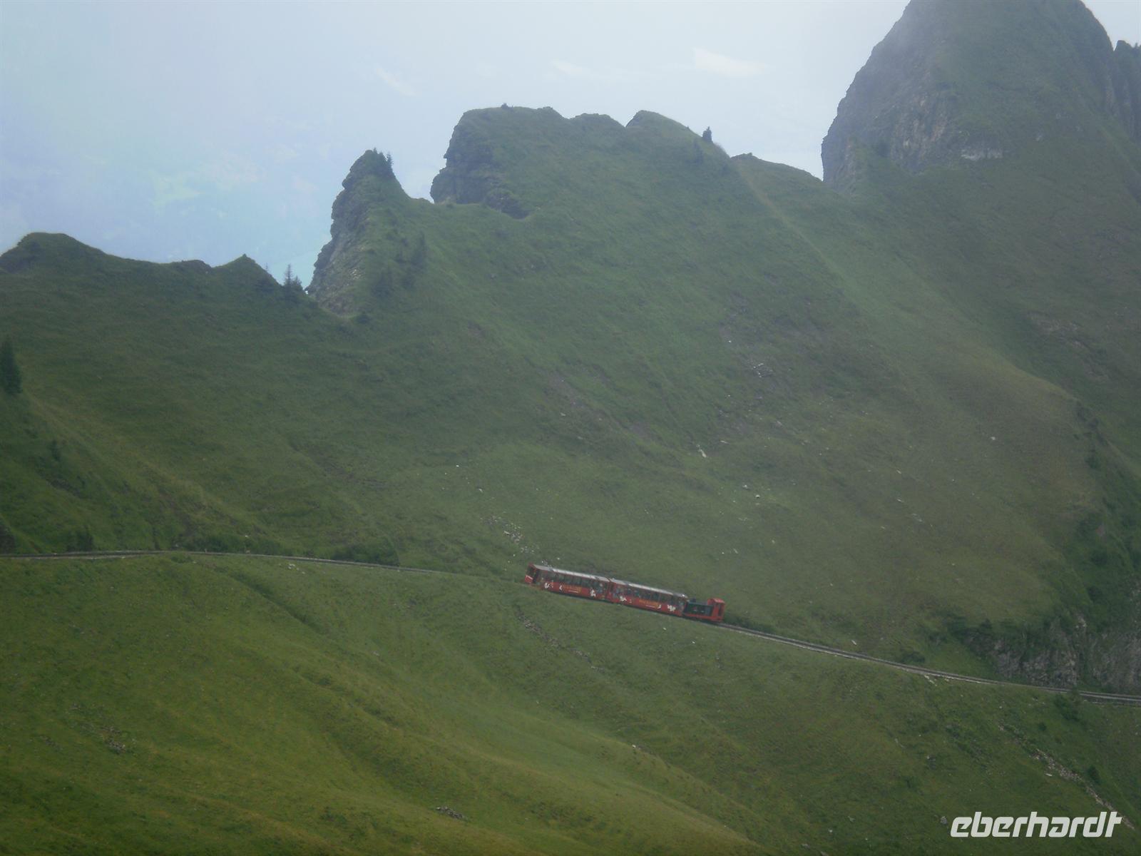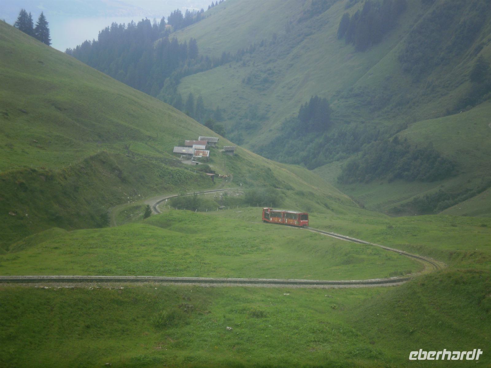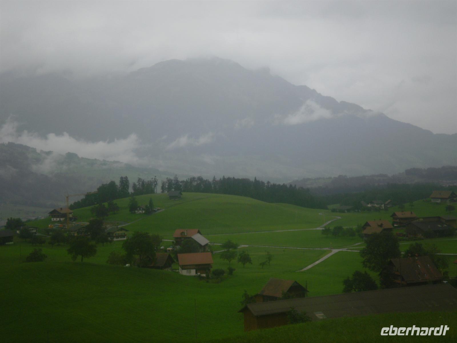 Nach dem kurzen Besuch in einer Holzschnitzerei ging es mit "Volldampf" hinauf auf das Brienzer Rothorn. Die Zahnradstrecke mit Dampfbetrieb wurde bereits 1892 eröffnet und überwindet die etwa 7,5 Kilometer lange Strecke in 55 Minuten. Von der auf 2252 Meter hoch gelegenen Gipfelstation hatten wir dann noch einen kurzen Weg zum 2270 Meter hohen Rothorn-Kulm. Bei guter Sicht hat man von hier eine großartige Aussicht über die Appenzeller, Urner, Engelberger, Berner und Walliser Alpen. Leider war es für uns die blanke Theorie, denn es zeigte sich nicht einer der in sämtlichen Prospekten angekündigten Berge! Am Nachmittag setzten wir unsere Fahrt schließlich mit einem kurzen Aufenthalt in Interlaken und entlang des Thuner Sees in Richtung Bern fort. Kurz vor Bern ging es in Richtung Osten zurück durch das Entlebuch, dem Haupttal der Kleinen Emme und über Luzern nach Flüeli-Ranft. Letztendlich ging dieser Tag in die Chronik dieser Reise als erster regenfreier Tag ein - das war doch schonmal eine große Sache!