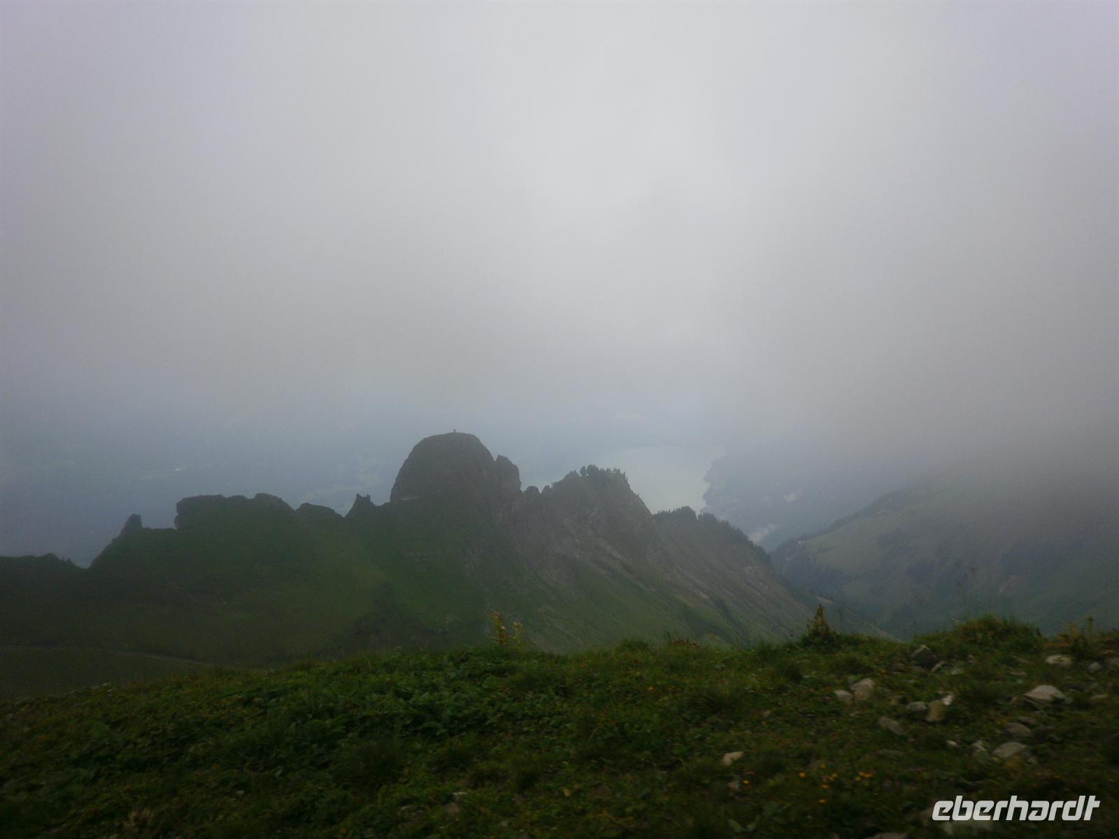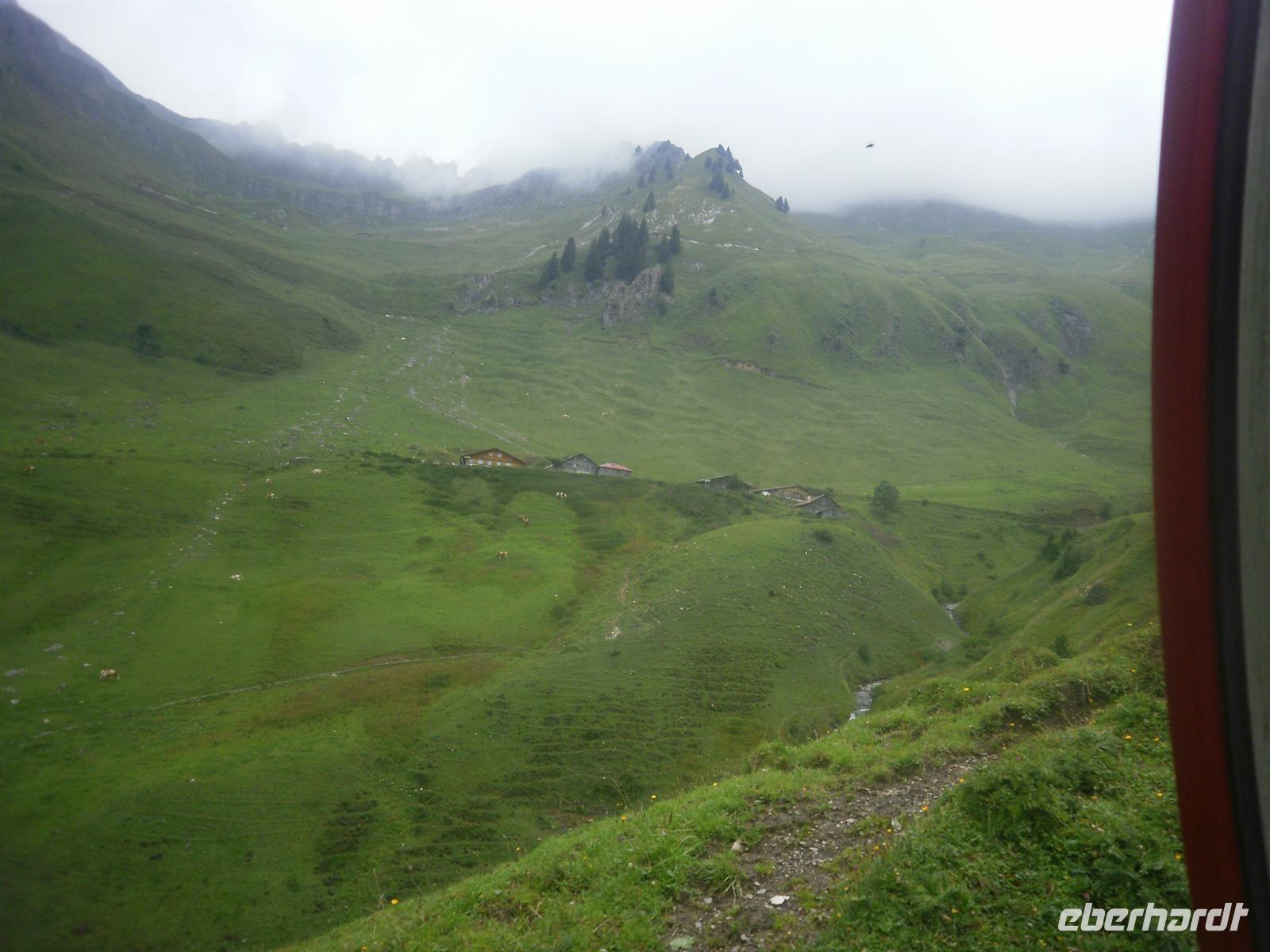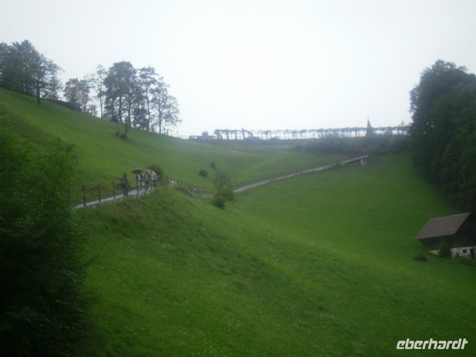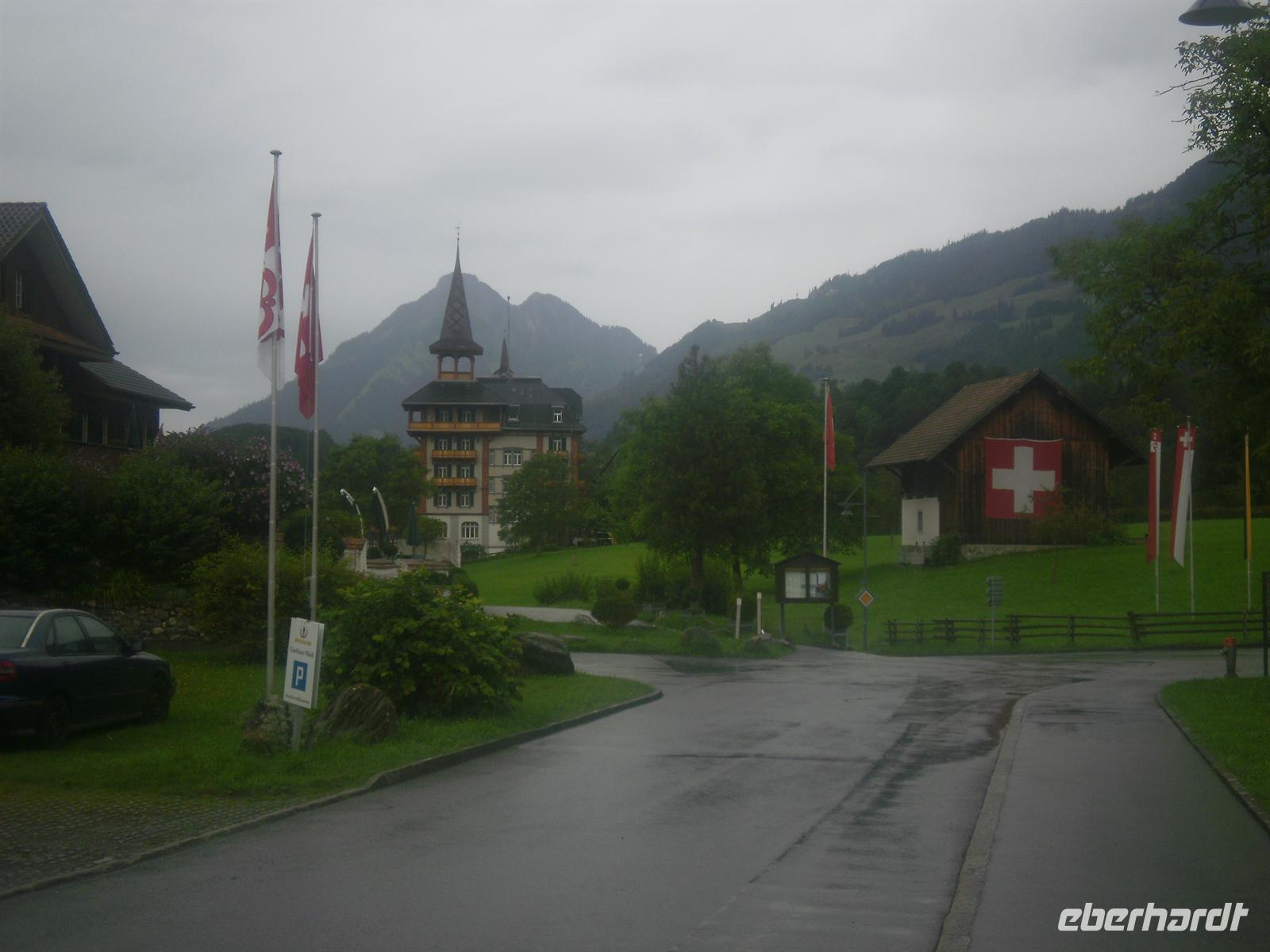 Nach dem kurzen Besuch in einer Holzschnitzerei ging es mit "Volldampf" hinauf auf das Brienzer Rothorn. Die Zahnradstrecke mit Dampfbetrieb wurde bereits 1892 eröffnet und überwindet die etwa 7,5 Kilometer lange Strecke in 55 Minuten. Von der auf 2252 Meter hoch gelegenen Gipfelstation hatten wir dann noch einen kurzen Weg zum 2270 Meter hohen Rothorn-Kulm. Bei guter Sicht hat man von hier eine großartige Aussicht über die Appenzeller, Urner, Engelberger, Berner und Walliser Alpen. Leider war es für uns die blanke Theorie, denn es zeigte sich nicht einer der in sämtlichen Prospekten angekündigten Berge! Am Nachmittag setzten wir unsere Fahrt schließlich mit einem kurzen Aufenthalt in Interlaken und entlang des Thuner Sees in Richtung Bern fort. Kurz vor Bern ging es in Richtung Osten zurück durch das Entlebuch, dem Haupttal der Kleinen Emme und über Luzern nach Flüeli-Ranft. Letztendlich ging dieser Tag in die Chronik dieser Reise als erster regenfreier Tag ein - das war doch schonmal eine große Sache!