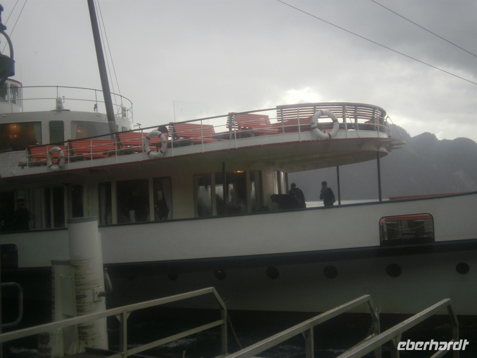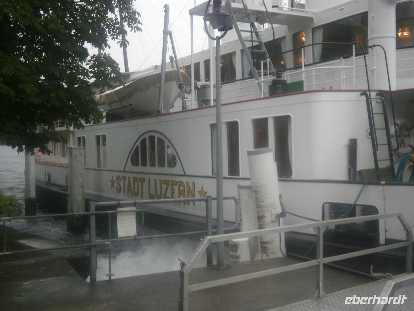 Diese Strecke konnte bereits 1871 eingeweiht werden und ist somit die älteste Zahnradstrecke Europas - es ist schon gigantisch, was die Bahnarchitekten bereits im 19. Jahrhundert geleistet haben...! Nach etwa 45 Minuten erreichten wir Vitznau und dort stiegen wir in den Schaufelraddampfer "Stadt Luzern" um, der uns nunmehr nach Luzern brachte. Unser Traumschiff mit 1600 PS wurde bereits 1928 in Roßlau (Sachsen) gebaut und gilt heute als eines der Flakschiffe der Schifffahrtsgesellschaft des Vierwaldstättersees. Schade war nur, das wir diese herrliche Fahrt leider wieder mal bei Regen erleben mußten, aber da konnte ja zum Glück niemand etwas dafür. Unser Bus mitsamt unserem Buschauffeur Tilo erwarte uns letztendlich in Luzern und von hier aus traten wir unsere Rückfahrt nach Flüeli-Ranft an. Nach einem hervorragenden Abendessen als 3-Gänge-Menü ging jetzt wieder einmal ein erlebnisreicher Tag zu Ende.