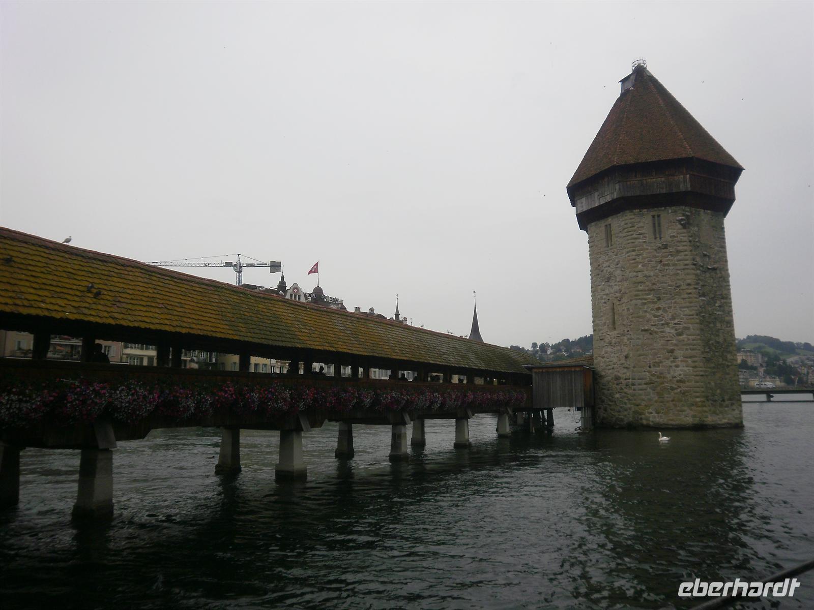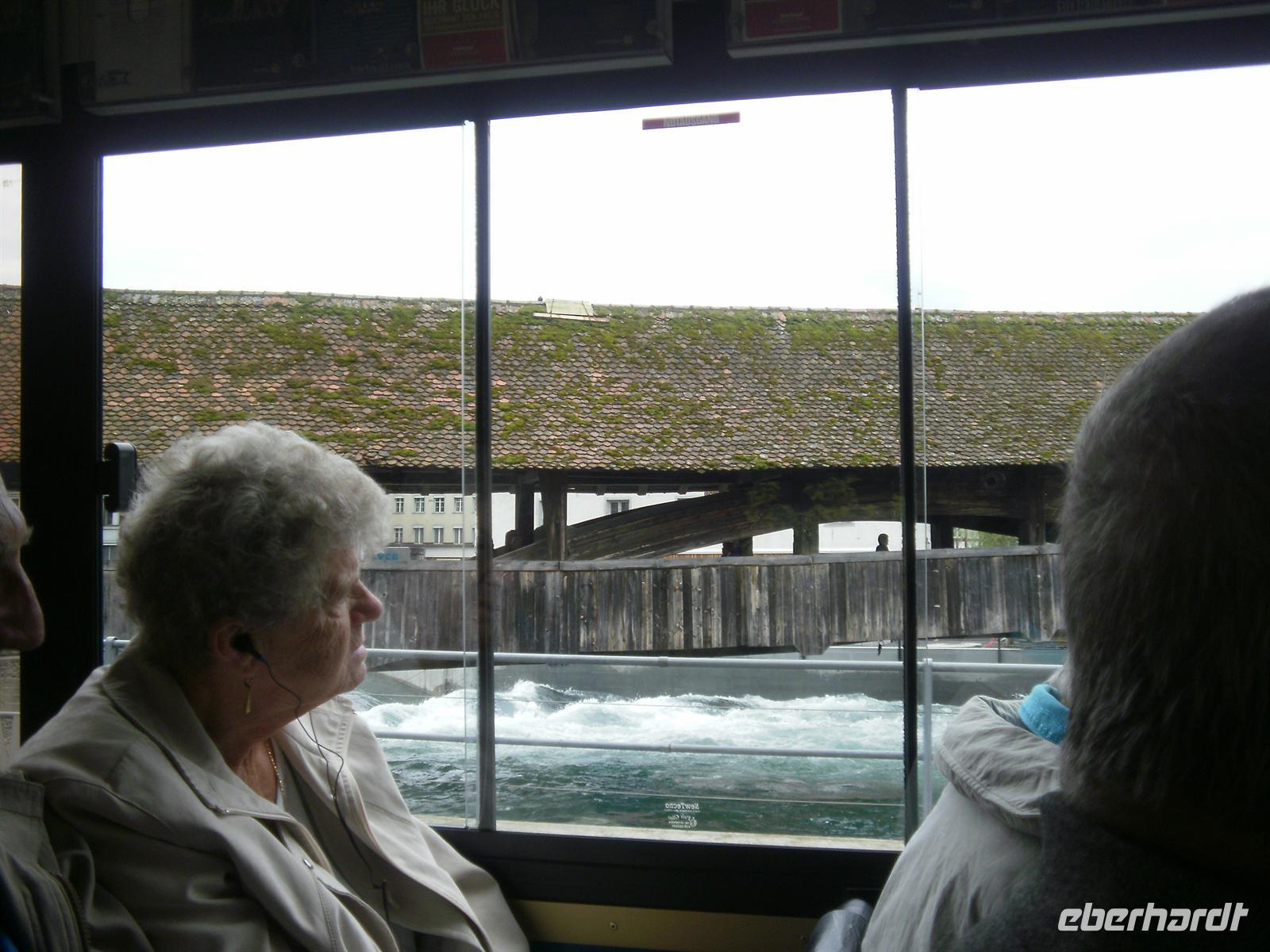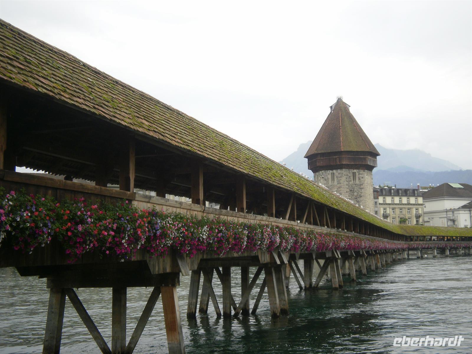Diese 8,9 Kilometer lange Strecke führte uns von Sursee durch das Surental bis Triengen. Die Fahrt war zwar leider sehr kurz, aber intensiv. Wir fühlten uns von Anfang an wohl in den nostalgischen Wagen - noch dazu kam, daß wir exzellent bewirtet wurden. Es gab Weisswein, Orangensaft und Bier - die Stimmung war prima! Die Fahrt endete nach etwa vierzig Minuten am Bahnhof von Triengen. Hier erwartete uns bereits unser Bus und er brachte uns nach einer kleinen Mittagspause weiter nach Luzern. Luzern und die Region Vierwaldstättersee gelten als die "Essenz der Schweiz". Denn nirgendwo findet man so viel Schweiz auf kleinstem Raum - eine Stadt mit viel Charme und einem mittelalterlichen Kern, den charakteristischen Vierwaldstättersee mit Europas größter Binnenschifffahrt und ein wunderschönes Alpenpanorama mit unverwechselbaren Bergen. Während einer Stadtführung mit einer kleinen Bahn erfuhren wir einiges über die jahrhundertealte Luzerner Geschichte und spazierten natürlich auch über die weltberühmte Kapellbrücke. Diese wurde in der ersten Hälfte des 14. Jahrhunderts als Teil der Stadtbefestigung errichtet und hat ihren Namen von der benachbarten St.-Peters-Kapelle.