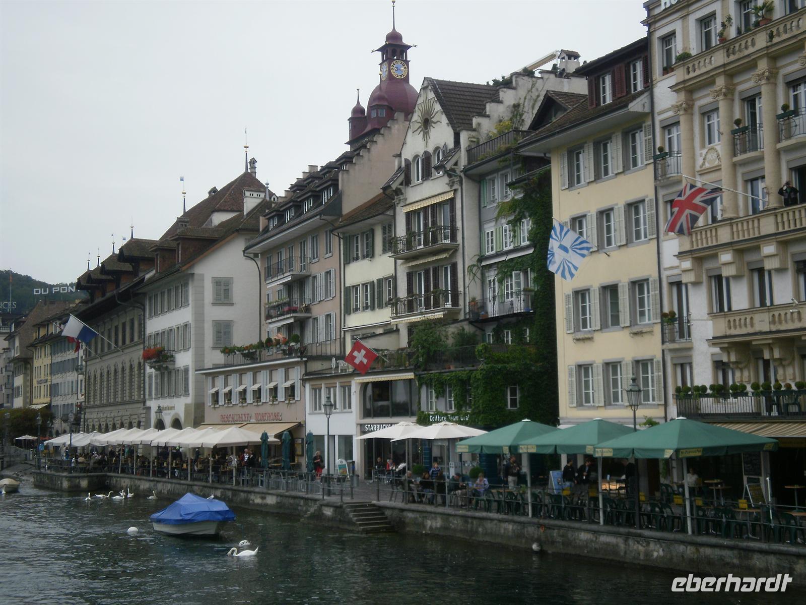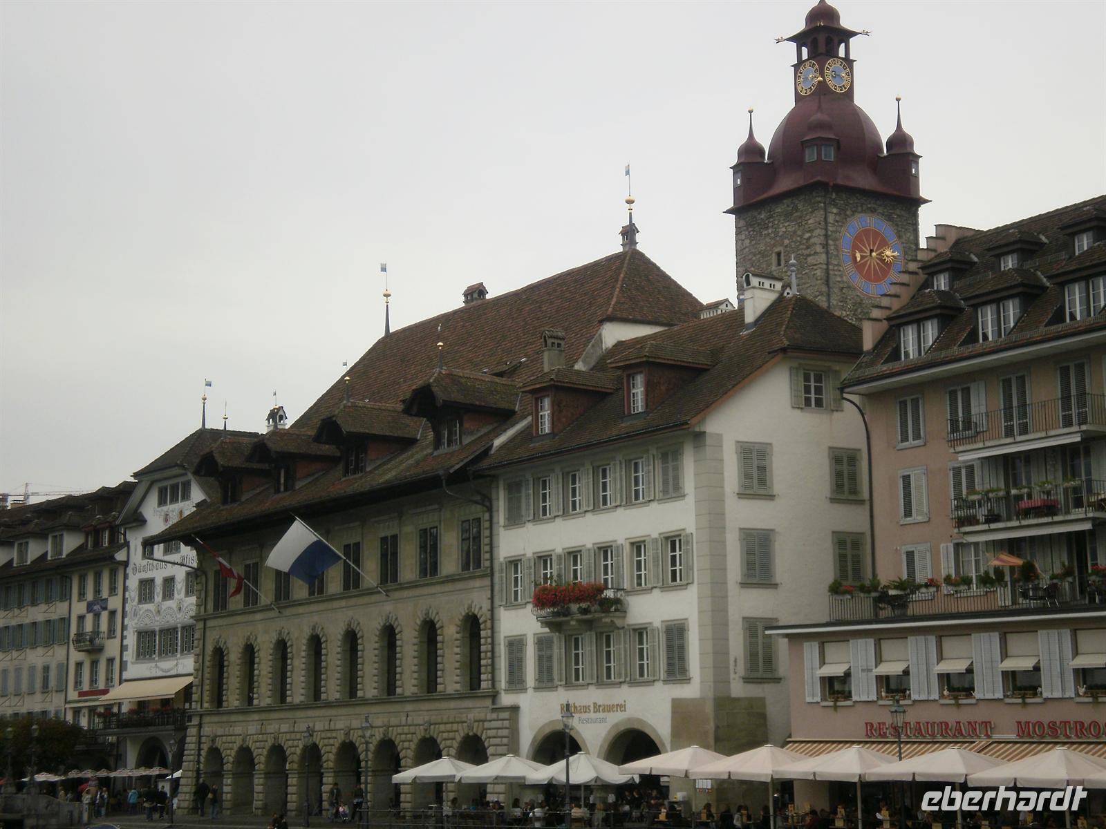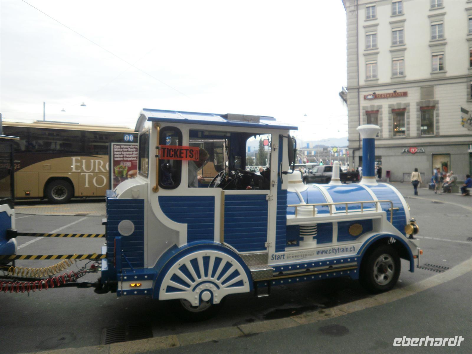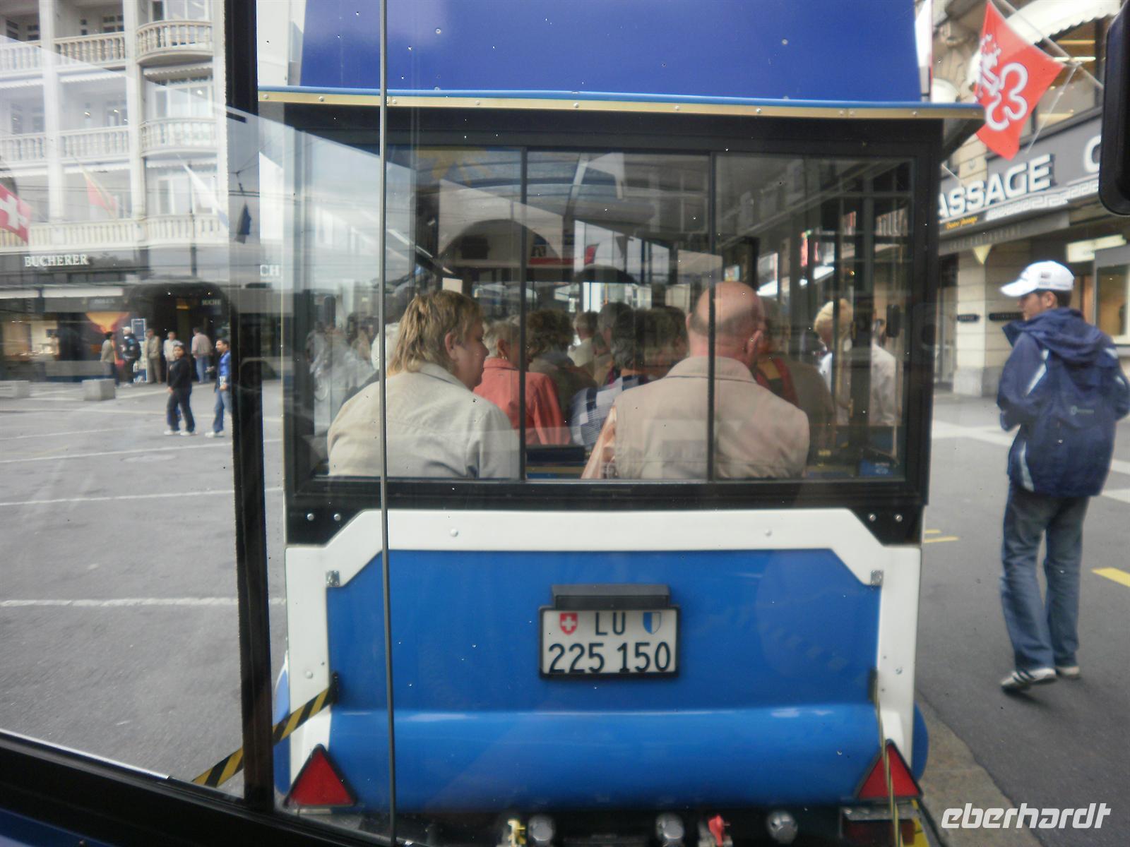 Diese 8,9 Kilometer lange Strecke führte uns von Sursee durch das Surental bis Triengen. Die Fahrt war zwar leider sehr kurz, aber intensiv. Wir fühlten uns von Anfang an wohl in den nostalgischen Wagen - noch dazu kam, daß wir exzellent bewirtet wurden. Es gab Weisswein, Orangensaft und Bier - die Stimmung war prima! Die Fahrt endete nach etwa vierzig Minuten am Bahnhof von Triengen. Hier erwartete uns bereits unser Bus und er brachte uns nach einer kleinen Mittagspause weiter nach Luzern. Luzern und die Region Vierwaldstättersee gelten als die "Essenz der Schweiz". Denn nirgendwo findet man so viel Schweiz auf kleinstem Raum - eine Stadt mit viel Charme und einem mittelalterlichen Kern, den charakteristischen Vierwaldstättersee mit Europas größter Binnenschifffahrt und ein wunderschönes Alpenpanorama mit unverwechselbaren Bergen. Während einer Stadtführung mit einer kleinen Bahn erfuhren wir einiges über die jahrhundertealte Luzerner Geschichte und spazierten natürlich auch über die weltberühmte Kapellbrücke. Diese wurde in der ersten Hälfte des 14. Jahrhunderts als Teil der Stadtbefestigung errichtet und hat ihren Namen von der benachbarten St.-Peters-Kapelle.