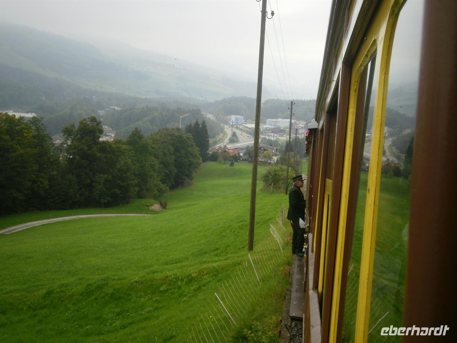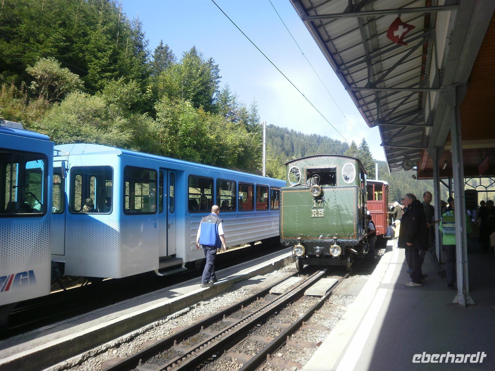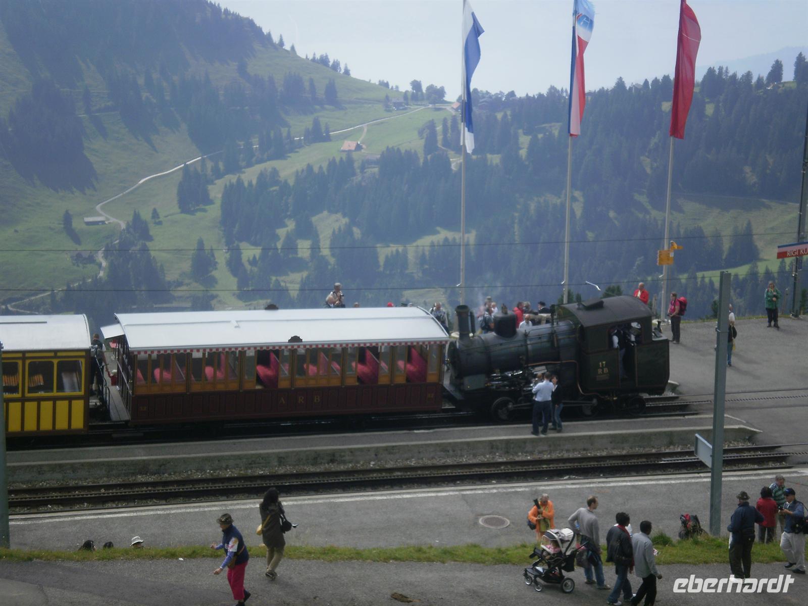 Der Bahnhof in Goldau war schließlich unser Ausgangspunkt zur Dampfbahnfahrt auf die Rigi. Die Rigi ist übrigens ein Bergmassiv zwischen dem Vierwaldstättersee, dem Zugersee und dem Lauerzersee. Höchster Gipfel ist mit einer Höhe von knapp 1800 Metern über dem Meer die Rigi-Kulm, ein beliebtes Ausflugsziel. Der Berg wir oft auch als "Königin der Berge" bezeichnet. Die Ingenieure Riggenbach und Zschokke bauten die zahnradbetriebene Arth-Rigi-Bahn. Diese konnte am 4. Juni 1875 den Betrieb aufnehmen. Bereits 1907 folgte die Eröffnung des elektrischen Betriebes auf der Bergstrecke Goldau-Kulm. Diese Umstellung war eine echte Pionierleistung, denn die Arth-Rigi-Bahn war die erste normalspurige Zahnradbahn der Schweiz, die auf elektrische Traktion umstellte. Wir benötigten für die reichlich 8 Kilometer lange Strecke knapp zwei Stunden, denn unsere Dampflok brauchte ab und an eine Pause und mußte Wasser tanken. Am Mittag erreichten wir schließlich Rigi-Kulm - entgegen unserer Erwartungen ohne Regen und mit recht guter Sicht auf die umliegenden Berge!