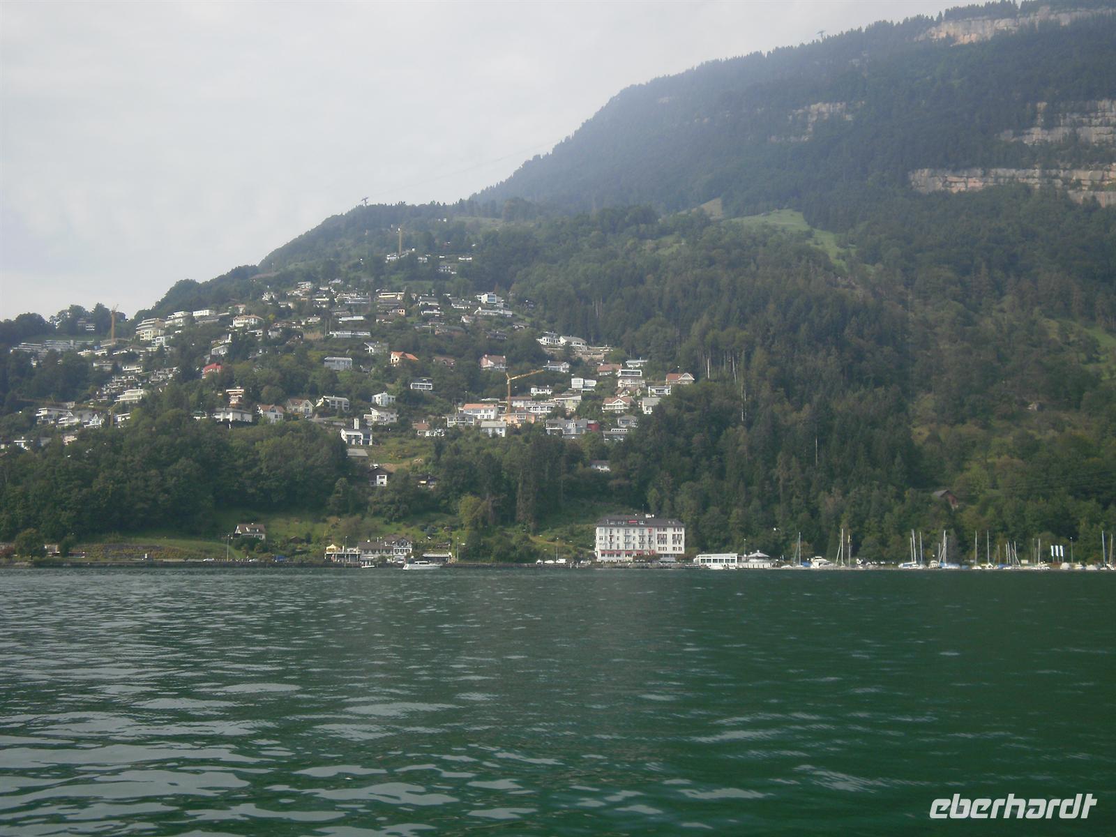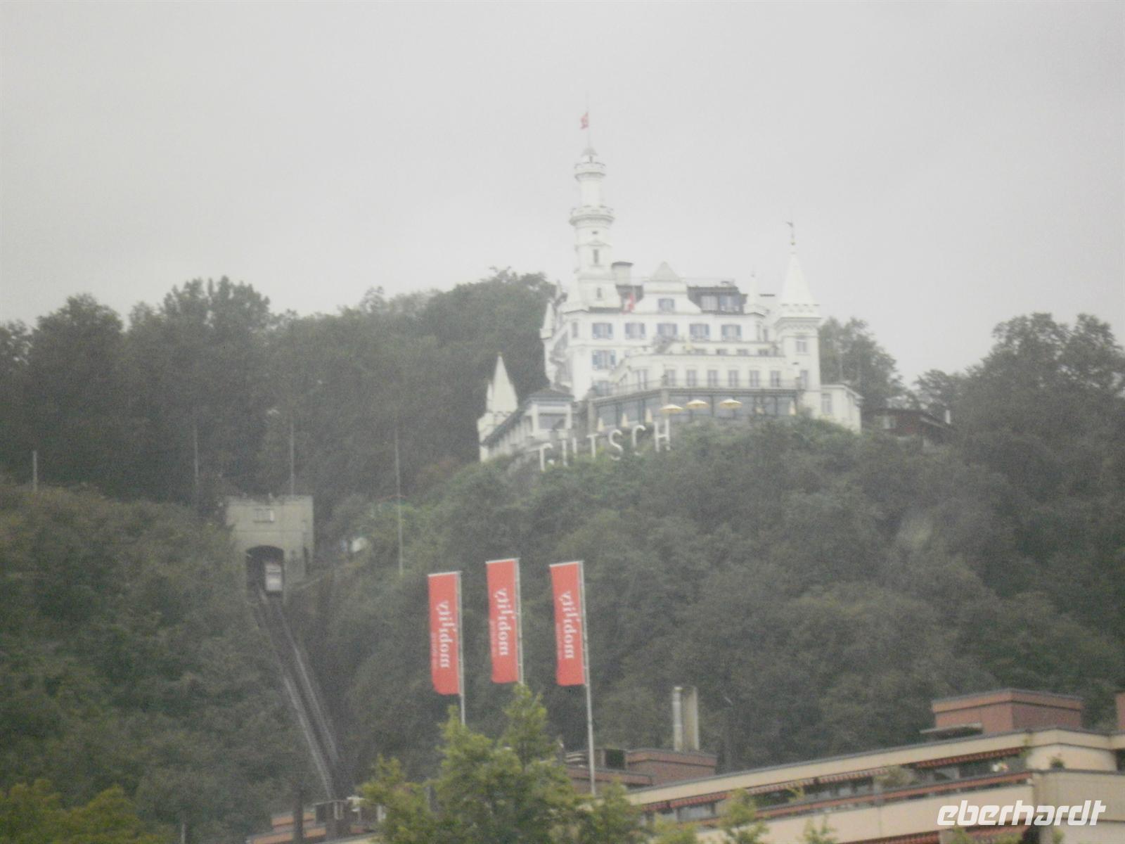 Nach einem längeren Aufenthalt auf der Rigi fuhren wir mit der Rigi-Bahn nach Vitznau am Vierwaldstättersee. Diese Strecke konnte bereits 1871 eingeweiht werden und ist somit die älteste Zahnradstrecke Europas - es ist schon gigantisch, was die Bahnarchitekten bereits im 19. Jahrhundert geleistet haben...! Nach etwa 45 Minuten erreichten wir Vitznau und dort stiegen wir in den Schaufelraddampfer "Stadt Luzern" um, der uns nunmehr nach Luzern brachte. Unser Traumschiff mit 1600 PS wurde bereits 1928 in Roßlau (Sachsen) gebaut und gilt heute als eines der Flakschiffe der Schifffahrtsgesellschaft des Vierwaldstättersees. Schade war nur, das wir diese herrliche Fahrt leider wieder mal bei Regen erleben mußten, aber da konnte ja zum Glück niemand etwas dafür. Unser Bus mitsamt unserem Buschauffeur André erwarte uns letztendlich in Luzern und von hier aus traten wir unsere Rückfahrt nach Flüeli-Ranft an. Nach einem hervorragenden Abendessen als 3-Gänge-Menü ging jetzt wieder einmal ein erlebnisreicher Tag zu Ende.
