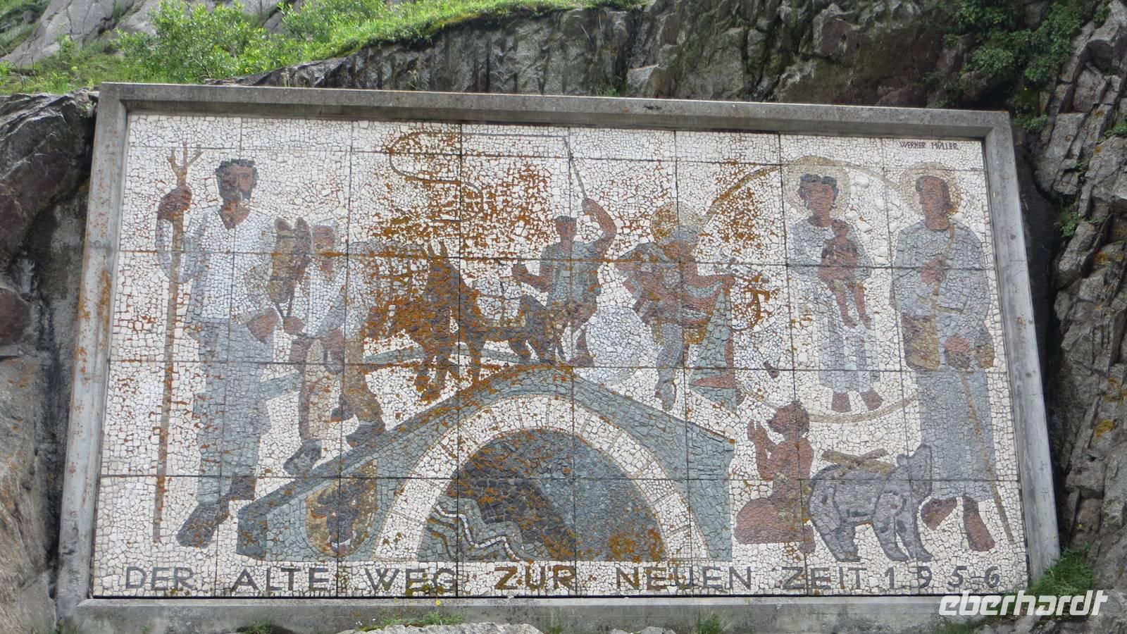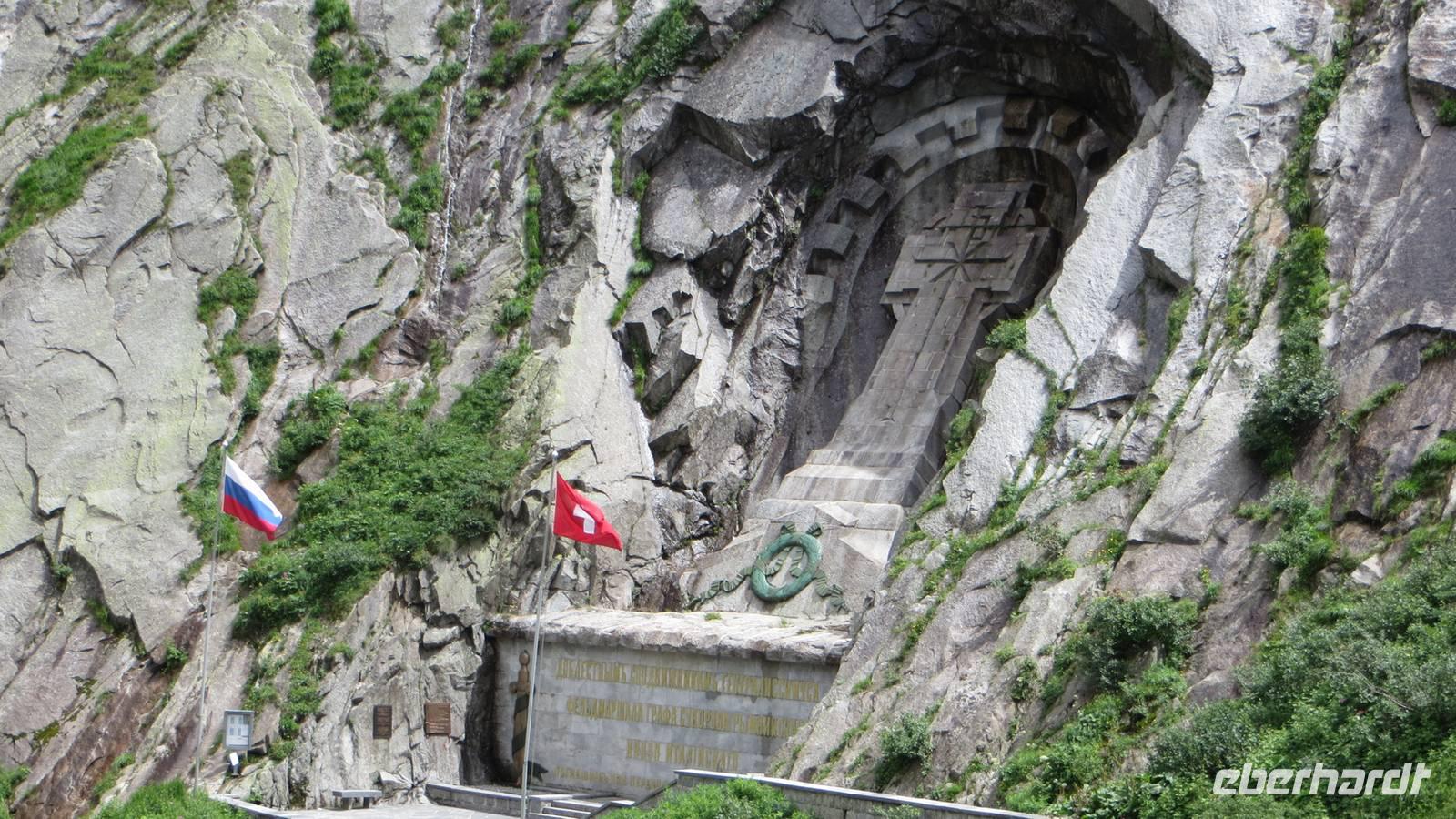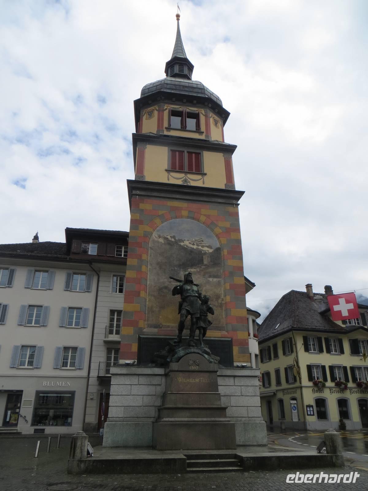 Die Lok rief uns mit ihrem Pfeifen wieder in den Zug und wir setzten unsere Fahrt fort. Sie führte uns über die Steffenbachbrücke, diese wird jedes Jahr vor dem Winter abgebaut, damit sie nicht durch Lawinen zerstört werden kann. Viel zu schnell war die schöne Fahrt in Realp zu Ende. Gerald unsere Chauffeur, erwartete uns bereits mit unserem Mittagsimbiss aus der Bordküche. Nun ging es durch das Hospental nach Andermatt und weiter zur Schöllenenschlucht. An der Teufelsbrücke legten wir einen Stopp ein. Der Legende nach sollen sich die Bewohner des Ursenentals beim Bau der Brücke über die wilde Reuss mit dem Teufel verbündet haben. Dieser forderte als Lohn für seinen Beistand das erste Lebewesen, welches über die Brücke ging. Er dachte natürlich an ein schönes junges Mädchen. Aber die schlauen Ursener schickten einen Ziegenbock als erstes über die Brücke. Das behagte dem Teufel gar nicht, aber es war ein Lebewesen. Wir sahen die alte Steinbrücke und die Darstellung des Teufels mit dem Ziegenbock. Anschließend erreichten wir Altdorf. In dem Ort soll sich die Apfelschuß-Szene aus der Geschichte von Wilhelm Tell zugetragen haben. Bis heute ist nicht geklärt, ob Wilhelm Tell, der Nationalheld der Schweiz, überhaupt gelebt hat. Aber die Geschichte ist lebendig. Wir sahen das Tell-Denkmal, welches Wilhelm Tell mit seinem Sohn Walter darstellt. Den mittelalterlichen Wohnturm, vor dem das Denkmal steht, konnten wir besteigen. Wir hatten eine schöne Sicht über Altdorf und erfuhren einiges aus der Geschichte des Ortes. Danach erreichten wir Flüeli-Ranft, wo wir im Jugendstil-Hotel Paxmontana unsere Zimmer bezogen. Flüeli-Ranft ist ein besonderer Ort der Ruhe. Hier hat im 15.Jahrhundert Nikolaus von Flüe, auch Bruder Klaus genannt gelebt. Er ist der einzige Heilige der Schweiz. Im Hotel verzichtete man bewusst auf Radio und TV im Zimmer. Und diese Ruhe genossen wir auch. Dennoch konnten die Fußball-Fans natürlich das Final-Spiel der Fußball-WM zwischen Deutschland und Argentinien in der Bar im Fernsehen verfolgen. Die Freude über den Weltmeistertitel der deutschen Mannschaft war sehr groß.