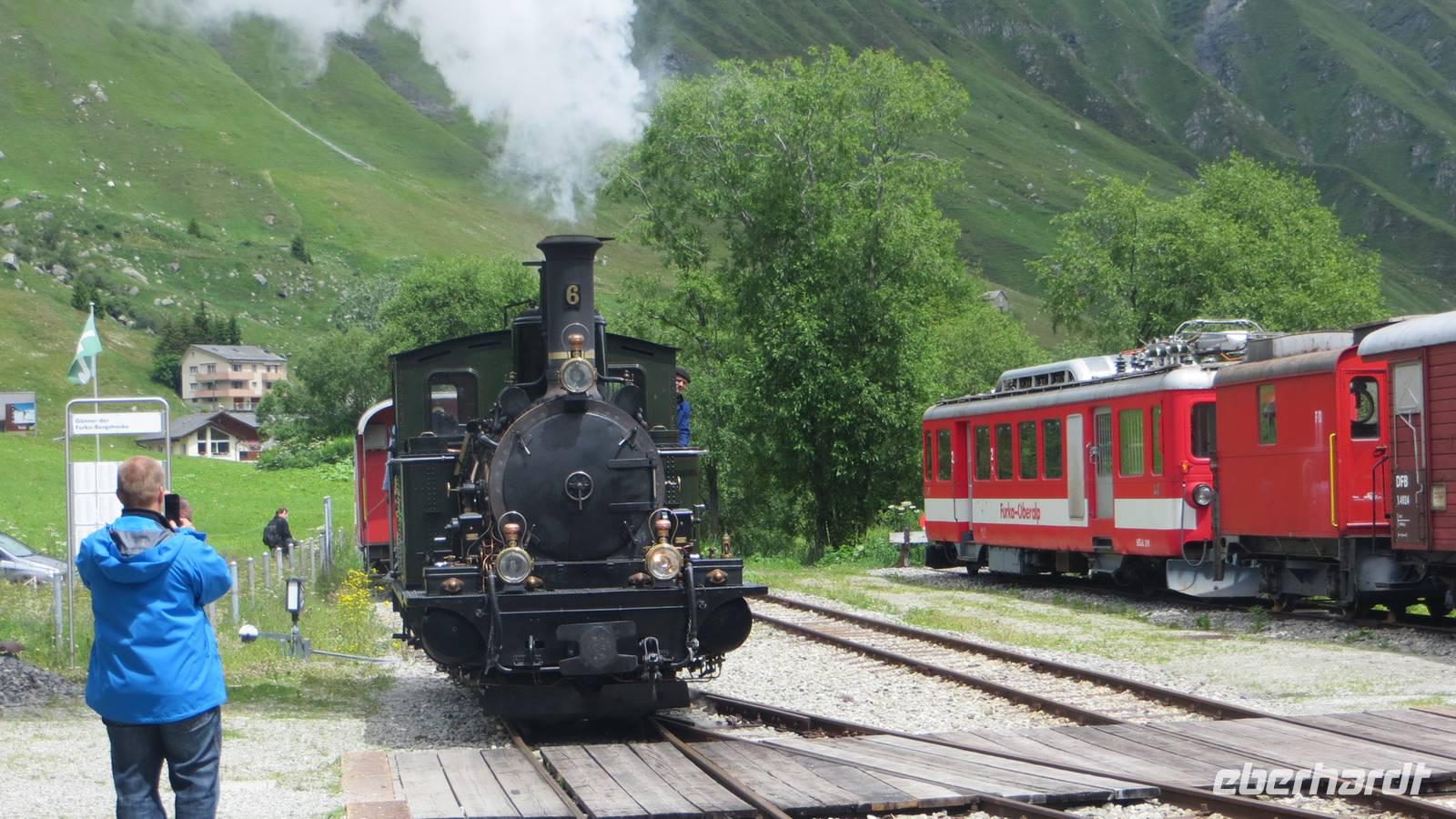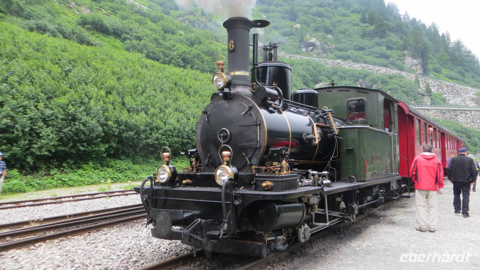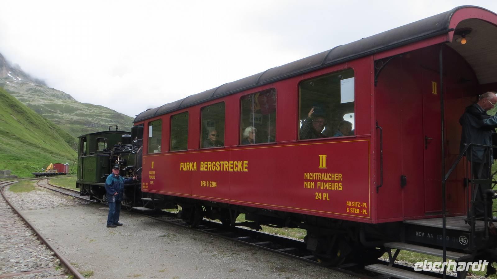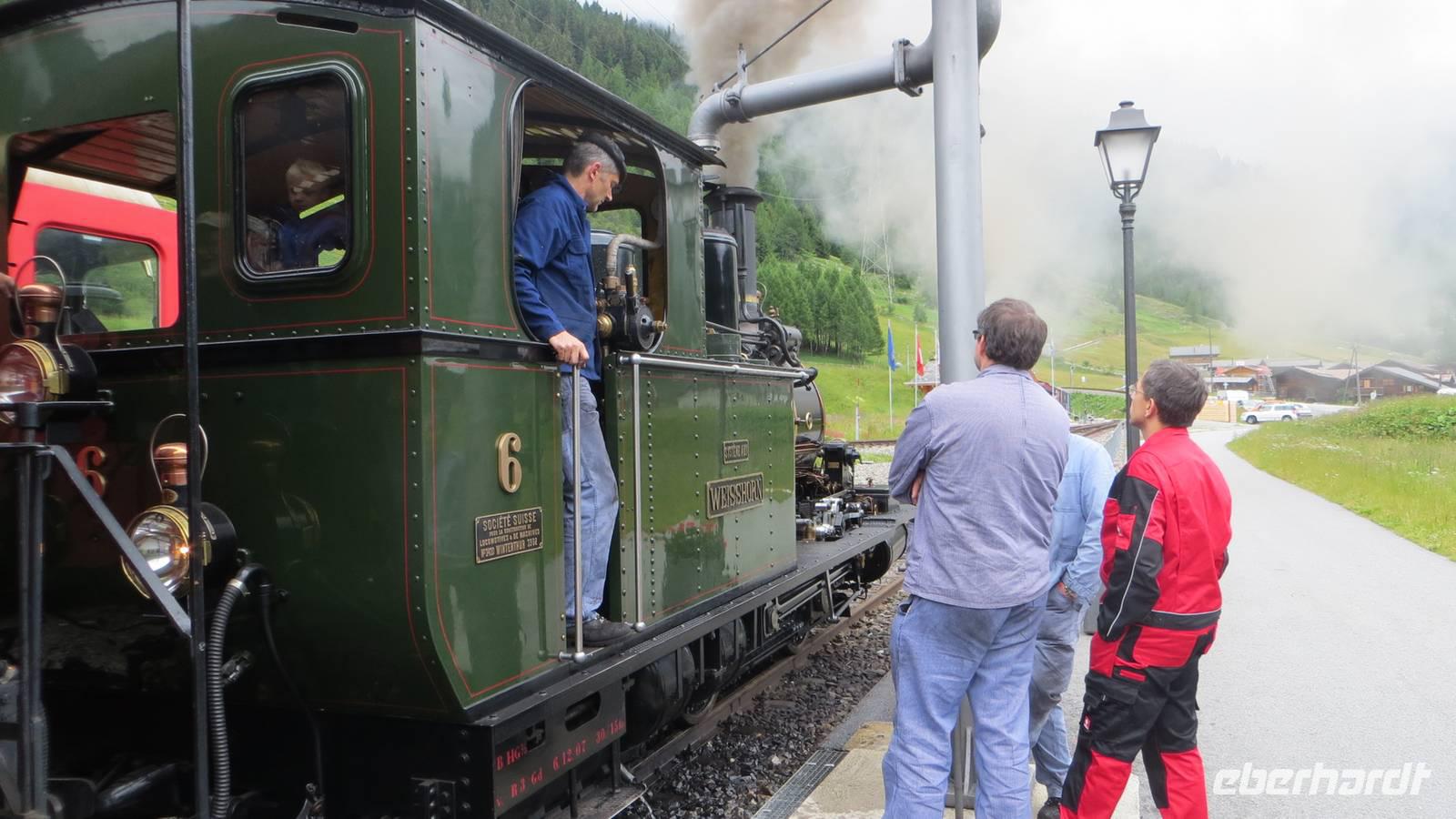 Heute stand ein weiterer Höhepunkt auf unserem Programm. Wir fuhren zunächst nach Ullrichen im Goms. Hier spazierten wir etwas durch den Ort und sahen uns die typischen Walliser Holzhäuser an. Danach brachte uns der Bus nach Oberwald zum Bahnhof der Furka-Dampfbahn. Wir wollten erleben, wie die Touristen vor über 100 Jahren gereist sind. Die Furka-Bergstrecke war die alte Strecke des Glacier-Express. Mit Eröffnung des Furka-Basis-Tunnels 1981 wurde diese stillgelegt. Ende der 80iger Jahre fanden sich viele Bahnbegeisterte, die die Bergstrecke in freiwilliger Arbeit wieder aufbauten, Lokomotiven und Wagen restaurierten und die Strecke ab 2002 wieder in Betrieb nahmen. Seit 2010 kann die gesamte Strecke von Oberwald bis nach Realp wieder befahren werden. Für uns war ein Wagen reserviert und unsere Reise wie in einer längst vergangen Zeit begann. Wir fuhren durch die herrliche Landschaft des Furka-Gebietes. Dabei bewunderten wir die Strecke, sahen die Alpenrosen und wilden Orchideen blühen und genossen die Fahrt. Wir konnten auch auf der Plattform stehen und die Fahrt wurde zu einem besonderen Erlebnis. Natürlich blieben schmutzige Hände nicht aus, denn die Dampflok wurde mit Kohle betrieben. An der Station Furke legten wir eine Pause ein. Hier überraschte uns der Furka-Wirt, der ein Freund von unserer Reiseleiterin war, mit einem Glas Wein und Kostproben von Käse und Wurst. Natürlich kauften wir dann auch noch Käse.