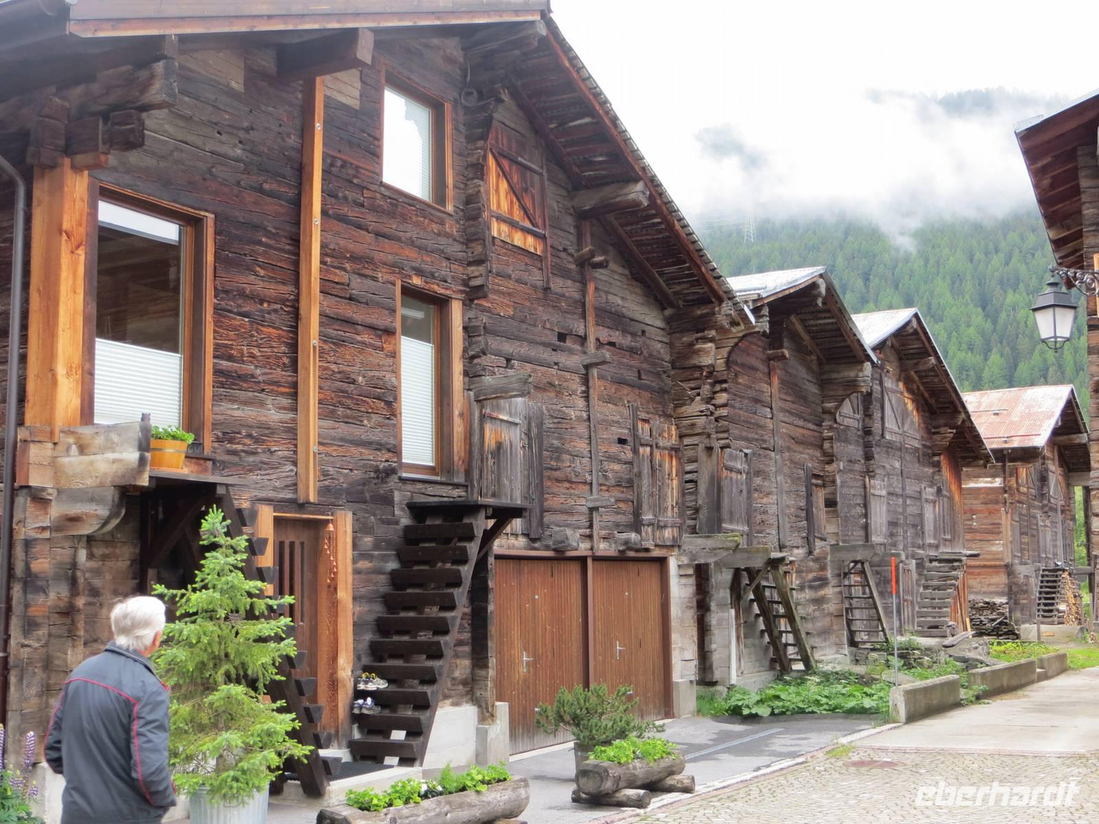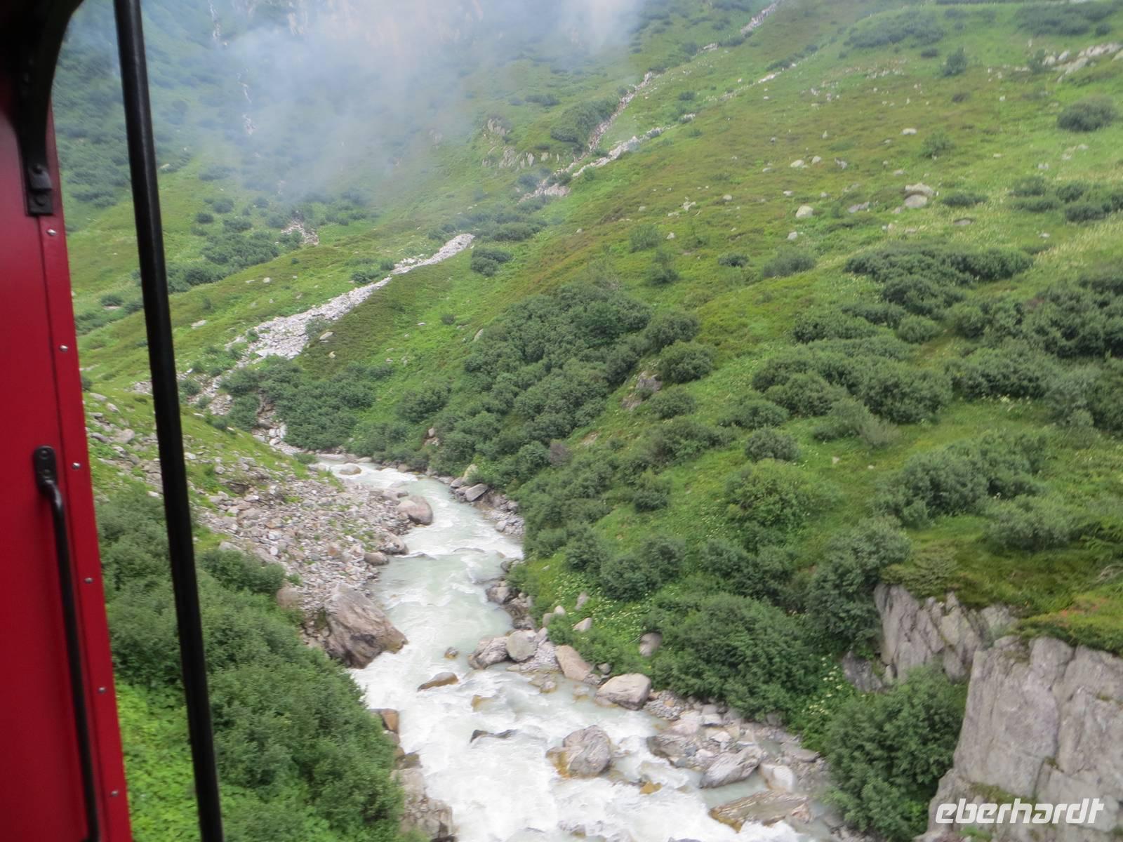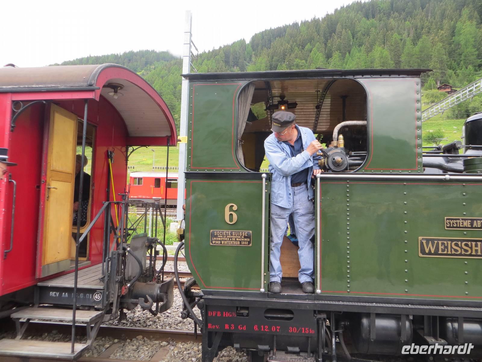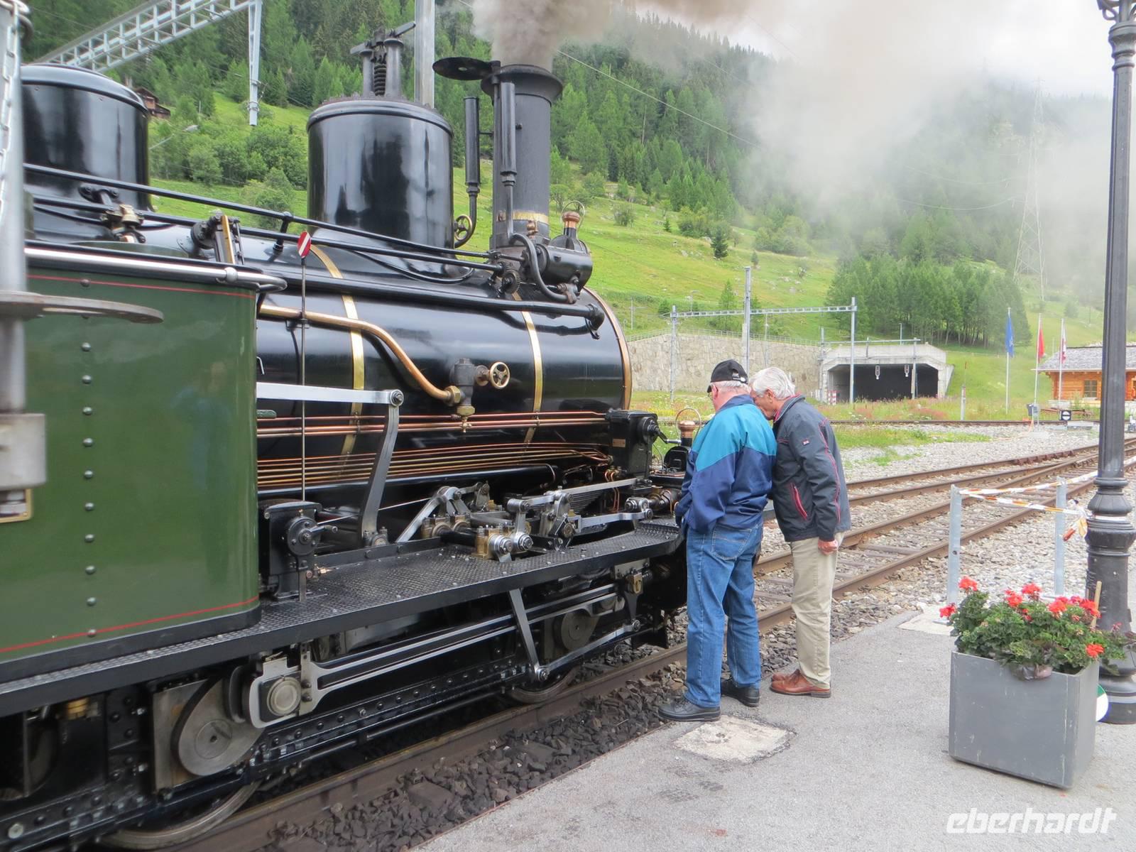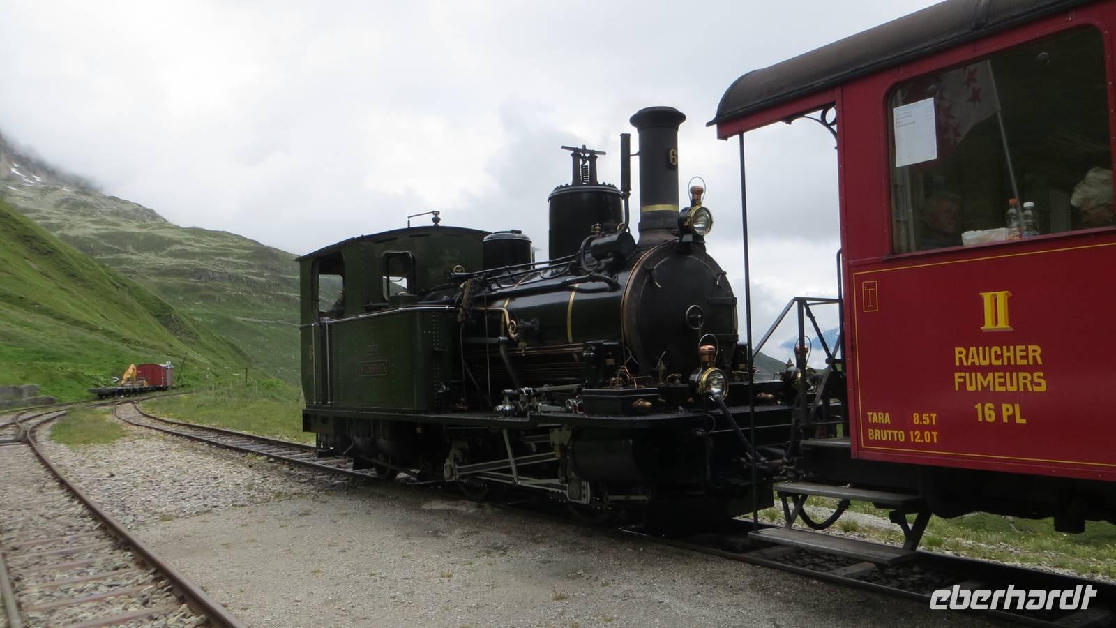 Heute stand ein weiterer Höhepunkt auf unserem Programm. Wir fuhren zunächst nach Ullrichen im Goms. Hier spazierten wir etwas durch den Ort und sahen uns die typischen Walliser Holzhäuser an. Danach brachte uns der Bus nach Oberwald zum Bahnhof der Furka-Dampfbahn. Wir wollten erleben, wie die Touristen vor über 100 Jahren gereist sind. Die Furka-Bergstrecke war die alte Strecke des Glacier-Express. Mit Eröffnung des Furka-Basis-Tunnels 1981 wurde diese stillgelegt. Ende der 80iger Jahre fanden sich viele Bahnbegeisterte, die die Bergstrecke in freiwilliger Arbeit wieder aufbauten, Lokomotiven und Wagen restaurierten und die Strecke ab 2002 wieder in Betrieb nahmen. Seit 2010 kann die gesamte Strecke von Oberwald bis nach Realp wieder befahren werden. Für uns war ein Wagen reserviert und unsere Reise wie in einer längst vergangen Zeit begann. Wir fuhren durch die herrliche Landschaft des Furka-Gebietes. Dabei bewunderten wir die Strecke, sahen die Alpenrosen und wilden Orchideen blühen und genossen die Fahrt. Wir konnten auch auf der Plattform stehen und die Fahrt wurde zu einem besonderen Erlebnis. Natürlich blieben schmutzige Hände nicht aus, denn die Dampflok wurde mit Kohle betrieben. An der Station Furke legten wir eine Pause ein. Hier überraschte uns der Furka-Wirt, der ein Freund von unserer Reiseleiterin war, mit einem Glas Wein und Kostproben von Käse und Wurst. Natürlich kauften wir dann auch noch Käse.
