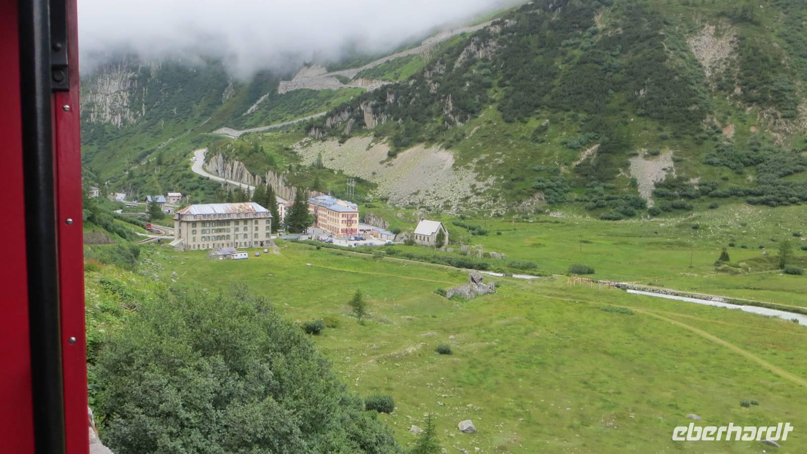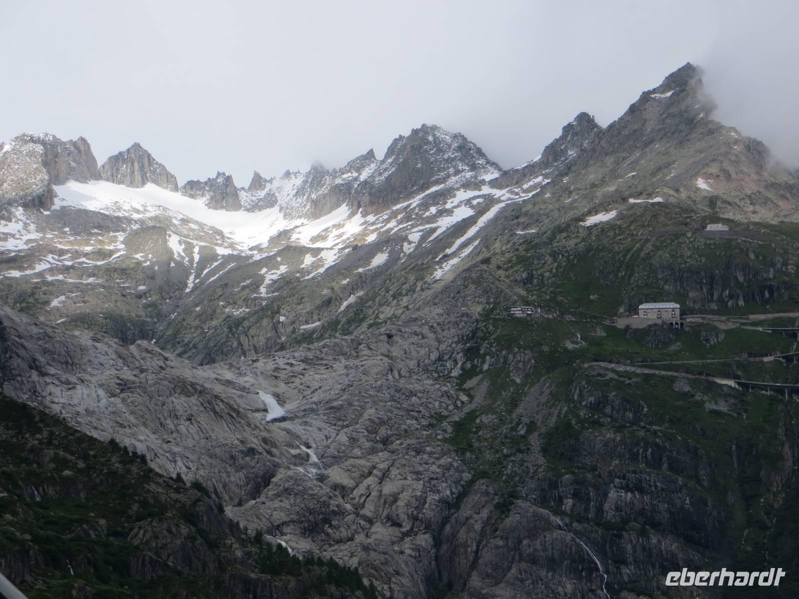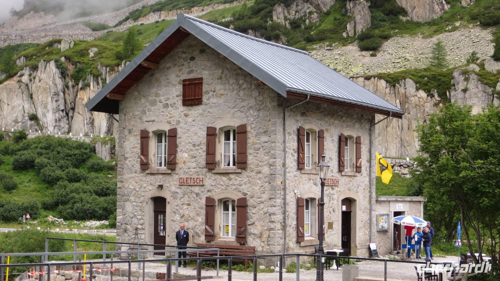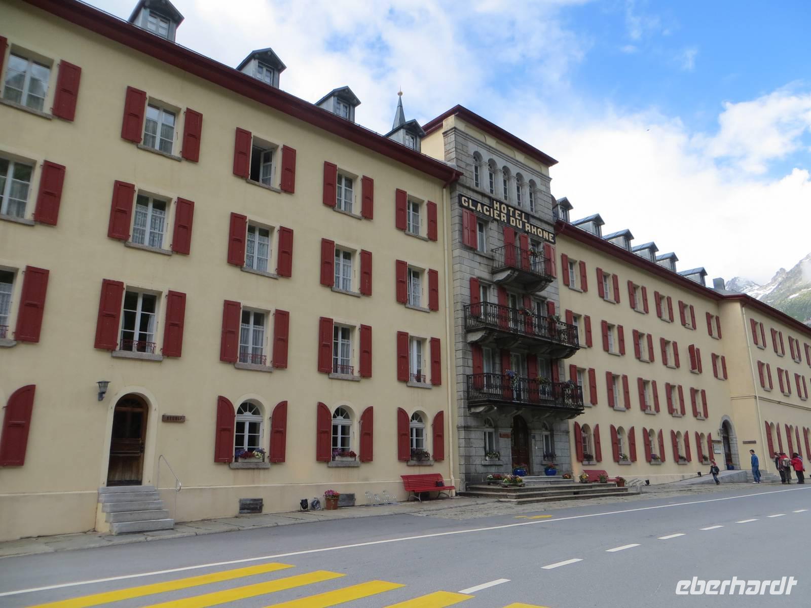 Am Morgen hieß es Abschied nehmen von der Schatzalp und Davos. Wir fuhren mit der Standseilbahn ein letztes Mal hinab nach Davos. Dort erwartete Gerald unser Chauffeur uns bereits mit dem Bus und unserem Gepäck, welches separat wieder ins Tal gebracht wurde. Heute stand für uns eine faszinierende Fahrt über zwei Passstraßen auf dem Programm. Unser Weg führte uns zunächst über Tiefencastel und Thusis zur sagenumwobenen Via Mala Schlucht. Wir hatten Zeit um diese einmalige Klamm, die der Rhein in das Felsmassiv gegraben hat zu bewundern. Einige sind die 324 Stufen hinabgestiegen und haben die Strudeltöpfe aus nächster Nähe betrachtet. Anschließend begaben wir uns auf die erste Passstraße. Es ging hinauf zum San Bernhardino. Gerald musste hier Schwerstarbeit leisten. Die Kehren waren teilweise so eng, dass es schon eine fahrerische Meisterleistung verlangte, diese mit dem Bus zu durchfahren. Wir hatten dabei einzigartigen Blicken in die wunderschöne Bergwelt. Auf der Passhöhe in 2.066 Metern Höhe legten wir einen kurzen Stopp ein, um Fotos machen zu können. Nun ging es hinab ins Tal. Durch das Valle Levantina im Tessin erreichten wir nach unserer Mittagspause die nächste Passstraße zum Nufenen-Pass. Dieser war besser ausgebaut und wir genossen die Fahrt auf den 2.478 Meter hohen Pass, welcher gleichzeitig die Grenze zwischen dem Tessin und dem Wallis bildet. Nach einer Kaffee-Pause ging es hinab ins Goms, das Tal der jungen Rhône. In Ullrichen und Obergersteln sahen wir die typischen Walliser Holzhäuser und Spycher mit den Mäuseplatten. Die Spycher standen auf Holzpfosten auf denen eine runde Steinplatte lag, damit die Mäuse nicht an die Vorräte kamen. Nun ging es hinauf nach Gletsch, wo wir im Hotel Glacier du Rhône unsere Zimmer bezogen. Das Hotel war ein ehemaliges Grand Hotel und hier war die Zeit wirklich stehen geblieben. Die Zimmer verfügten über ein Waschbecken und Toiletten und Duschen befanden sich auf der Etage. Aber das wussten wir und wir wollten ja bewusst in die alte Zeit eintauchen. Am Abend wurde uns wieder ein vorzügliches Menü serviert.