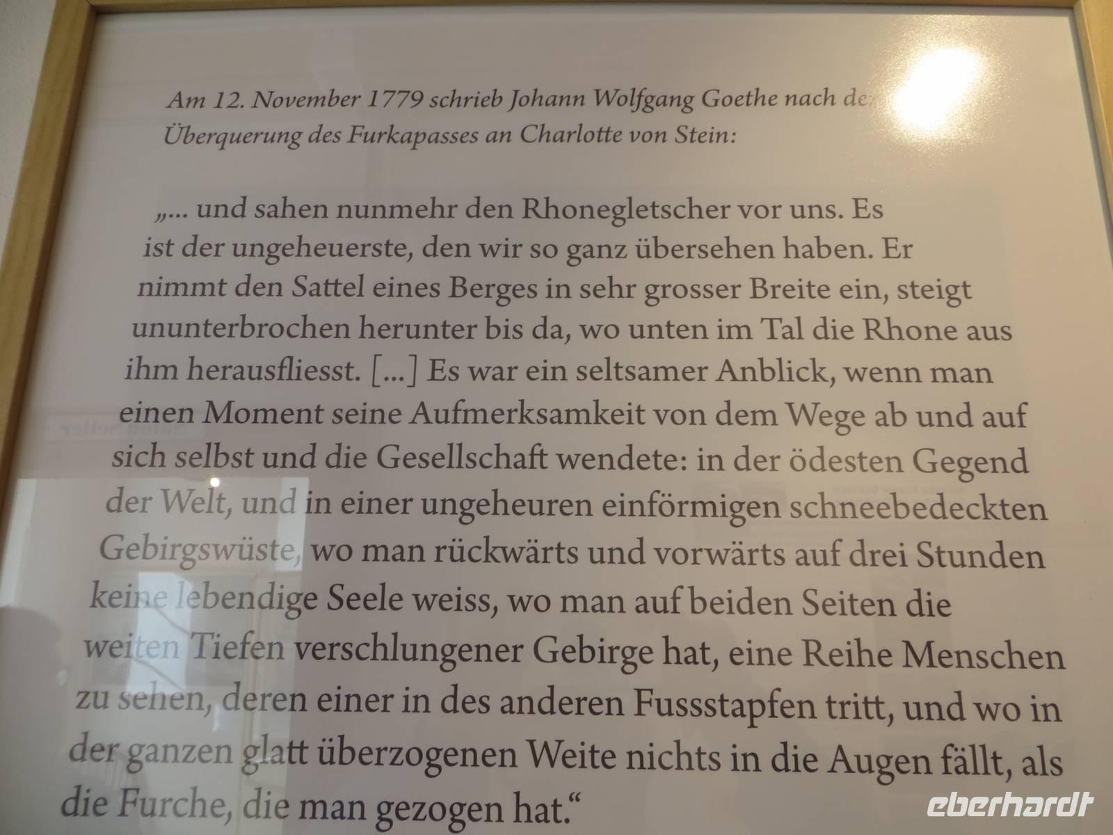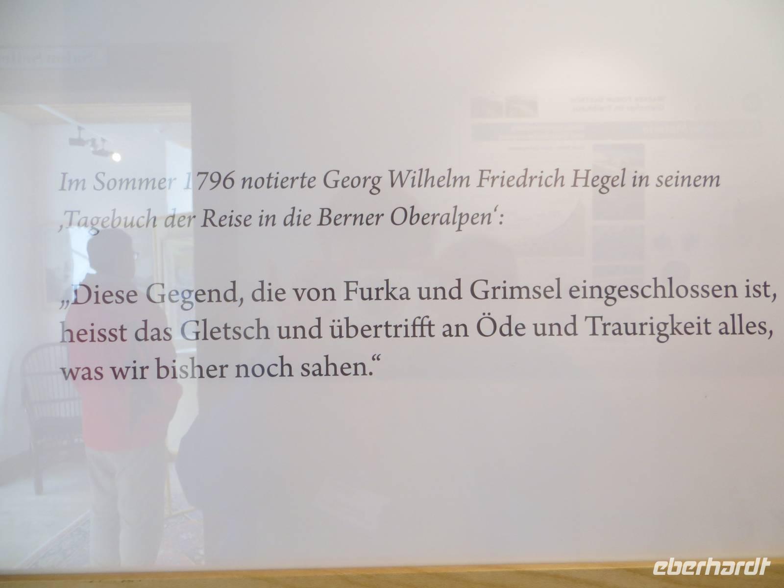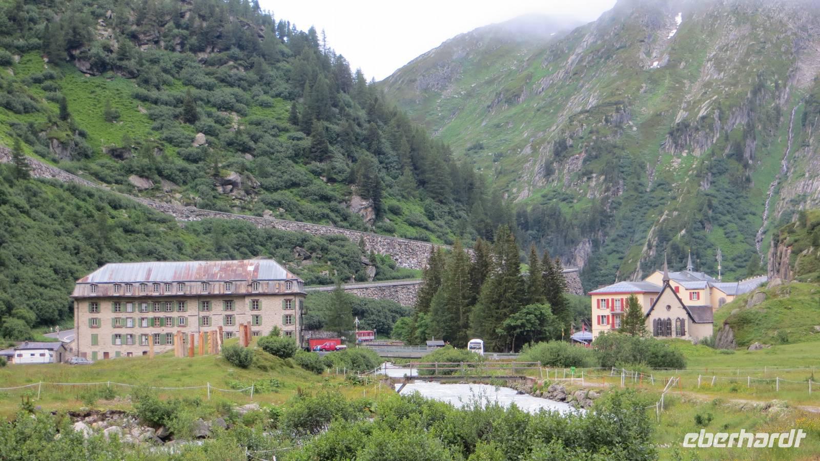 Am Morgen hieß es Abschied nehmen von der Schatzalp und Davos. Wir fuhren mit der Standseilbahn ein letztes Mal hinab nach Davos. Dort erwartete Gerald unser Chauffeur uns bereits mit dem Bus und unserem Gepäck, welches separat wieder ins Tal gebracht wurde. Heute stand für uns eine faszinierende Fahrt über zwei Passstraßen auf dem Programm. Unser Weg führte uns zunächst über Tiefencastel und Thusis zur sagenumwobenen Via Mala Schlucht. Wir hatten Zeit um diese einmalige Klamm, die der Rhein in das Felsmassiv gegraben hat zu bewundern. Einige sind die 324 Stufen hinabgestiegen und haben die Strudeltöpfe aus nächster Nähe betrachtet. Anschließend begaben wir uns auf die erste Passstraße. Es ging hinauf zum San Bernhardino. Gerald musste hier Schwerstarbeit leisten. Die Kehren waren teilweise so eng, dass es schon eine fahrerische Meisterleistung verlangte, diese mit dem Bus zu durchfahren. Wir hatten dabei einzigartigen Blicken in die wunderschöne Bergwelt. Auf der Passhöhe in 2.066 Metern Höhe legten wir einen kurzen Stopp ein, um Fotos machen zu können. Nun ging es hinab ins Tal. Durch das Valle Levantina im Tessin erreichten wir nach unserer Mittagspause die nächste Passstraße zum Nufenen-Pass. Dieser war besser ausgebaut und wir genossen die Fahrt auf den 2.478 Meter hohen Pass, welcher gleichzeitig die Grenze zwischen dem Tessin und dem Wallis bildet. Nach einer Kaffee-Pause ging es hinab ins Goms, das Tal der jungen Rhône. In Ullrichen und Obergersteln sahen wir die typischen Walliser Holzhäuser und Spycher mit den Mäuseplatten. Die Spycher standen auf Holzpfosten auf denen eine runde Steinplatte lag, damit die Mäuse nicht an die Vorräte kamen. Nun ging es hinauf nach Gletsch, wo wir im Hotel Glacier du Rhône unsere Zimmer bezogen. Das Hotel war ein ehemaliges Grand Hotel und hier war die Zeit wirklich stehen geblieben. Die Zimmer verfügten über ein Waschbecken und Toiletten und Duschen befanden sich auf der Etage. Aber das wussten wir und wir wollten ja bewusst in die alte Zeit eintauchen. Am Abend wurde uns wieder ein vorzügliches Menü serviert.