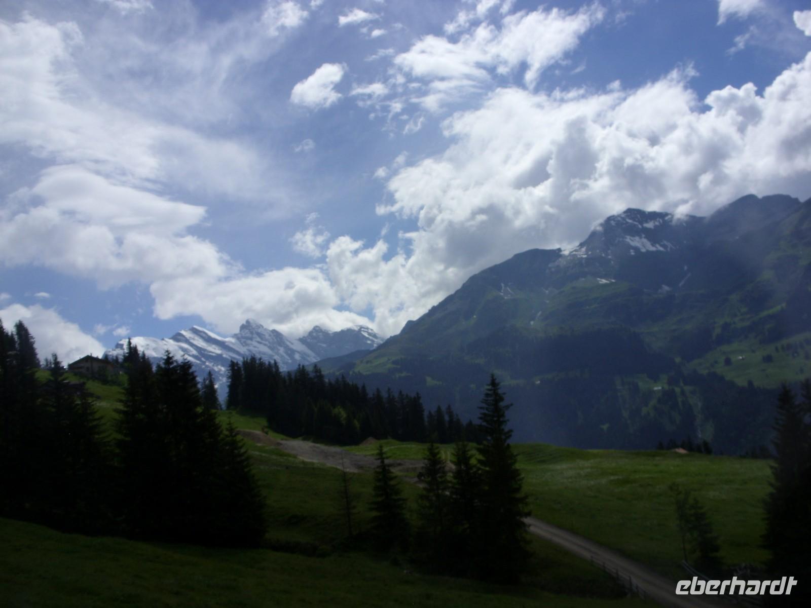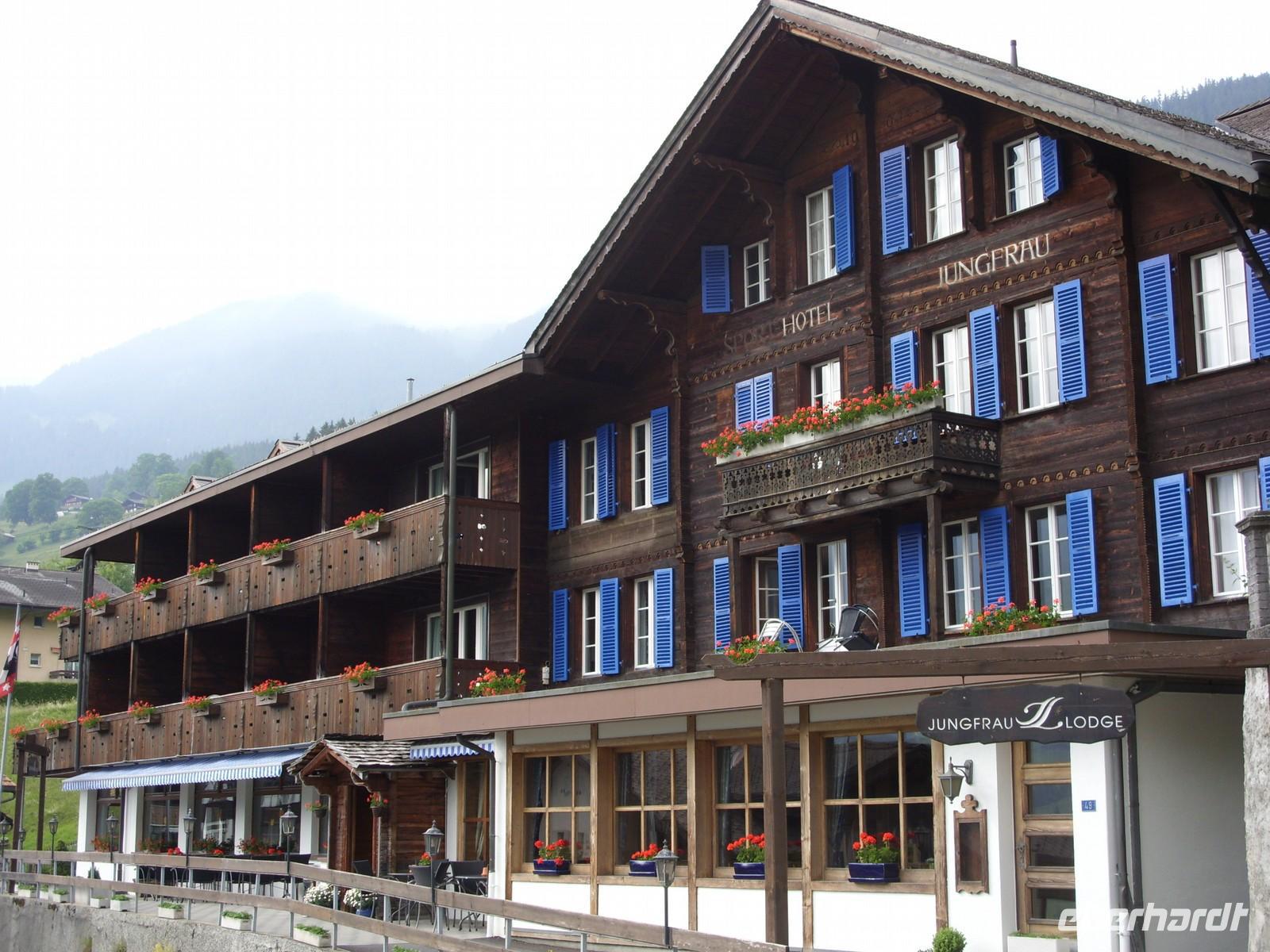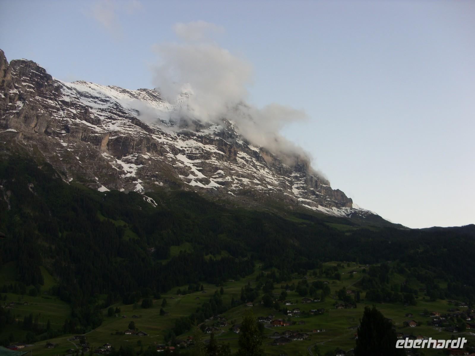 Über Basel erreichten wir schließlich am Nachmittag die Schweizerische Eigenossenschaft. Mit Nationalhymne und Nationalflagge fuhren wir standesgemäss in unser Urlaubsland ein. Nach einigen Kilometern machten wir kurz vor Bern nochmals eine kurze Pause ehe uns unser Chauffeur Andreas Glatzel weiter in die Bergwelt hineinfuhr. Vorbei ging es am Thuner See und Interlaken. Schließlich folgten wir der Schwarzen Lütschine und passierten alsbald den Orteingang von Grindelwald. Hier erwartete uns nach einigen Metern die Jungrau Lodge mit ihren zwei Häusern. Die meisten Gästen waren dann tatsächlich im sogenannten Neubau untergebracht und hatten von ihrem Zimmer aus einen herrlichen Blick auf die Eigernordwand, die jedoch ein wenig in den Wolken hing. Nach Bezug der Zimmer gab es dann sogleich ein wohl schmeckendes 4-Gang-Menü bis wir alle recht geschafft in unsere gemütlichen Betten fielen.