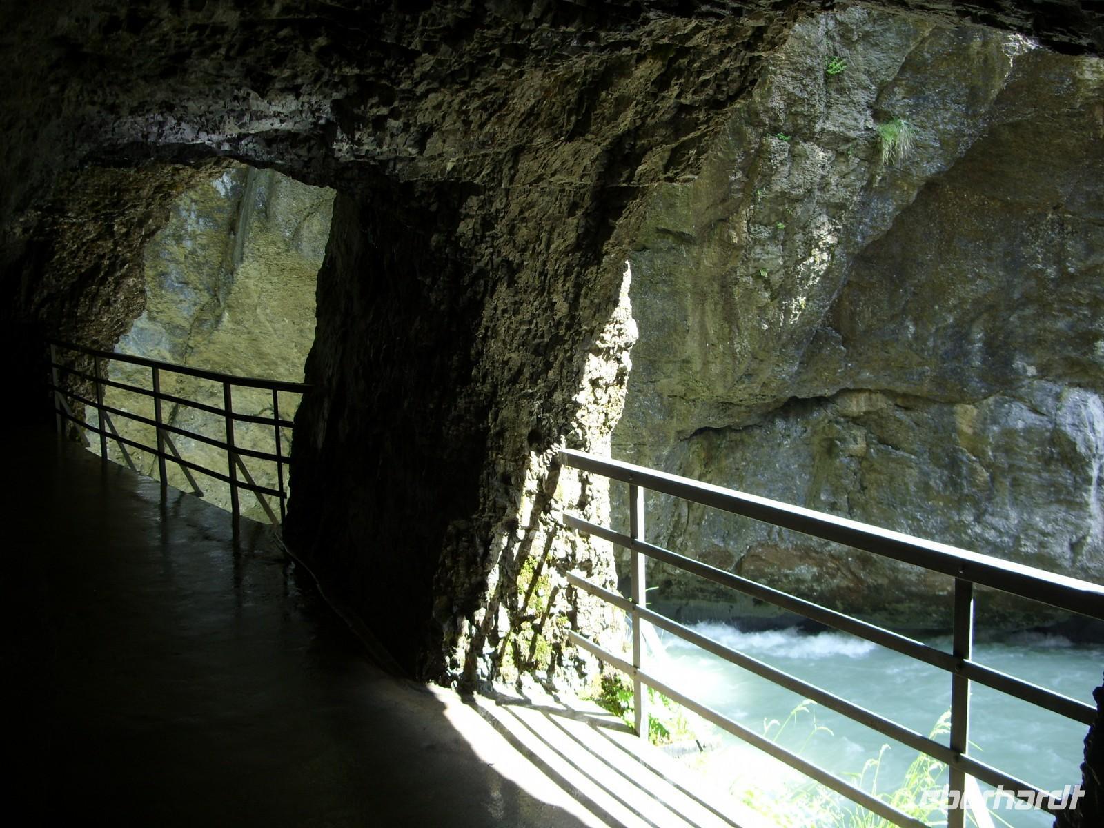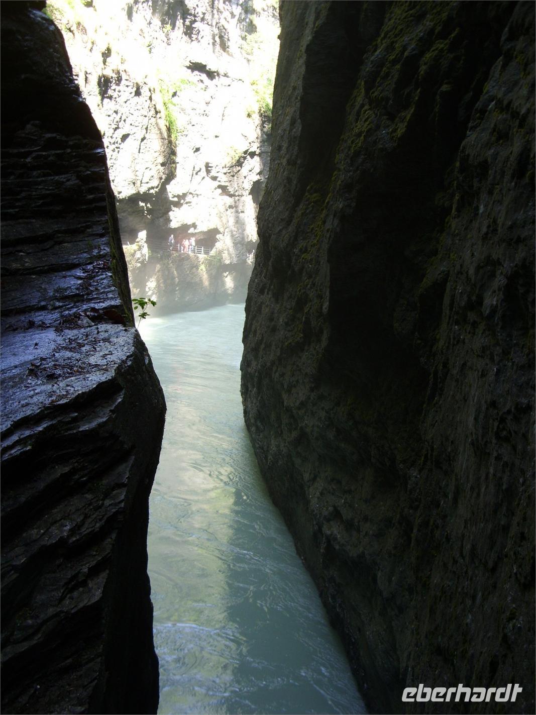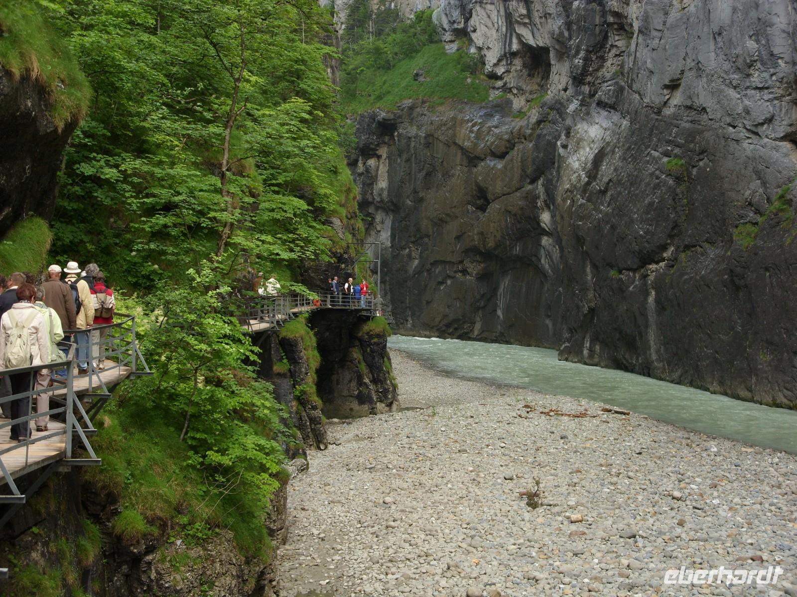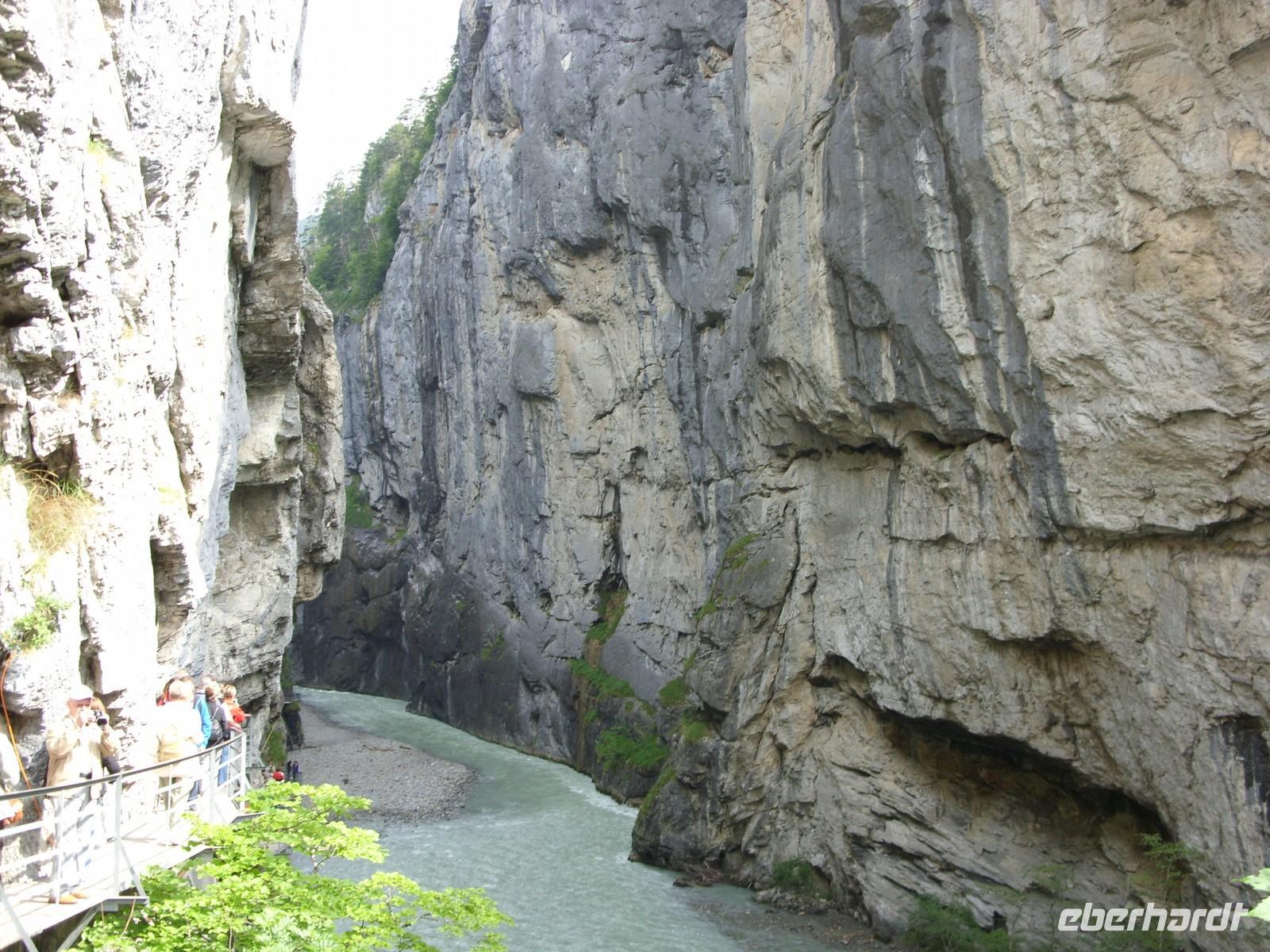 Unser erster richtiger Urlaubstag führte uns zunächst einmal aus dem Tal der Lütschine wieder hinaus. Wir fuhren gen Interlaken und bogen dort nach Osten ab. Nach etwa einer Stunden Fahrt erreichten wir den Osteingang zur Aareschlucht. Über eine Länge von 1400 Meter hat sich hier die Aare durch den Kalkfelsen gegraben, um dann mit fast 12 Stundenkilometer die Schlucht wieder zu verlassen. Dieses sagenhafte Naturschauspiel wollten wir natürlich aus nächster Nähe sehen. So wanderten wir also über die an der südlichen Felswand angebrachten Holzstege durch die Schluchte und staunten über die zum Teil 180 Meter steil aufragenden Felsen oder die engste Stelle mnit gerade einmal einem Meter Breite.