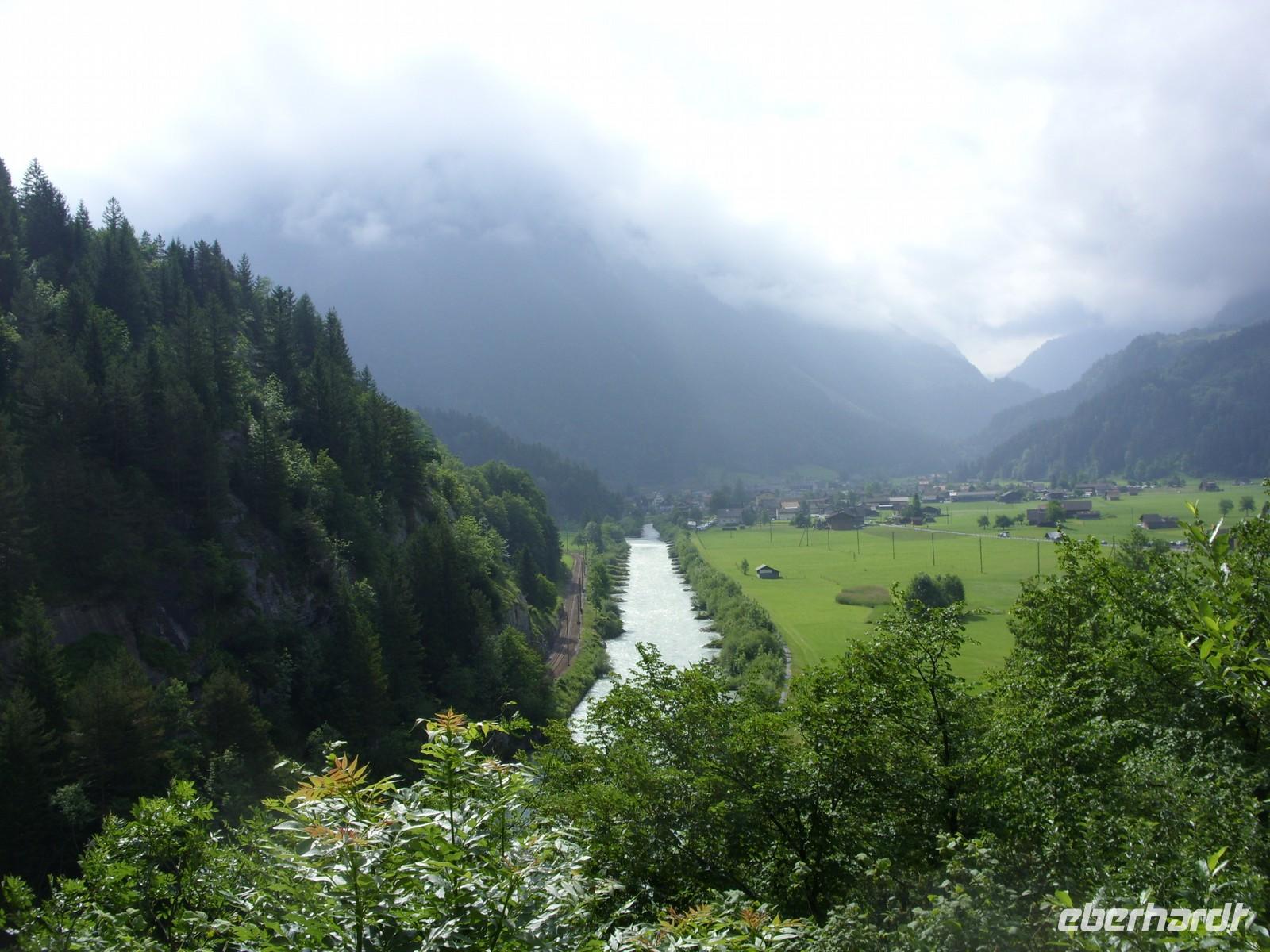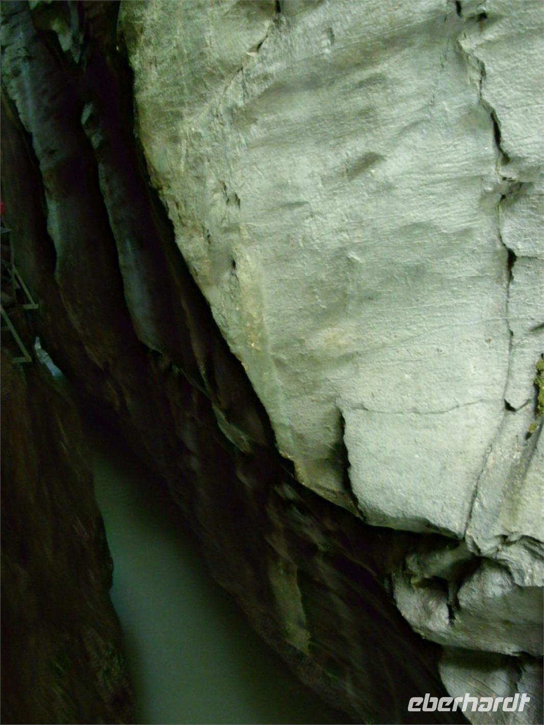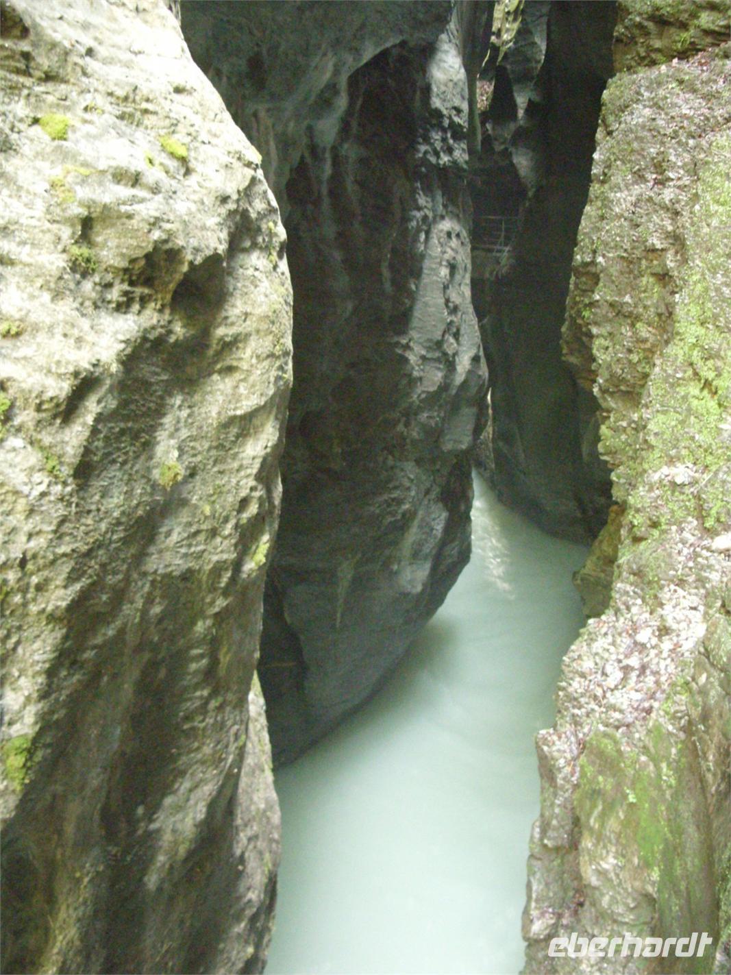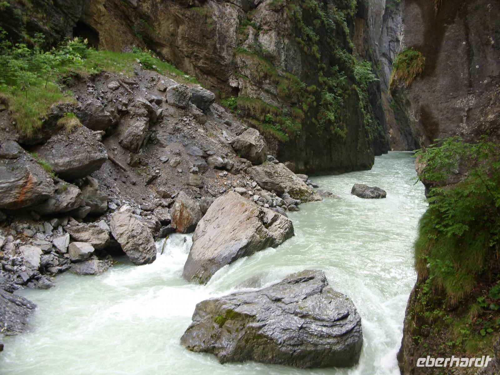 Unser erster richtiger Urlaubstag führte uns zunächst einmal aus dem Tal der Lütschine wieder hinaus. Wir fuhren gen Interlaken und bogen dort nach Osten ab. Nach etwa einer Stunden Fahrt erreichten wir den Osteingang zur Aareschlucht. Über eine Länge von 1400 Meter hat sich hier die Aare durch den Kalkfelsen gegraben, um dann mit fast 12 Stundenkilometer die Schlucht wieder zu verlassen. Dieses sagenhafte Naturschauspiel wollten wir natürlich aus nächster Nähe sehen. So wanderten wir also über die an der südlichen Felswand angebrachten Holzstege durch die Schluchte und staunten über die zum Teil 180 Meter steil aufragenden Felsen oder die engste Stelle mnit gerade einmal einem Meter Breite.