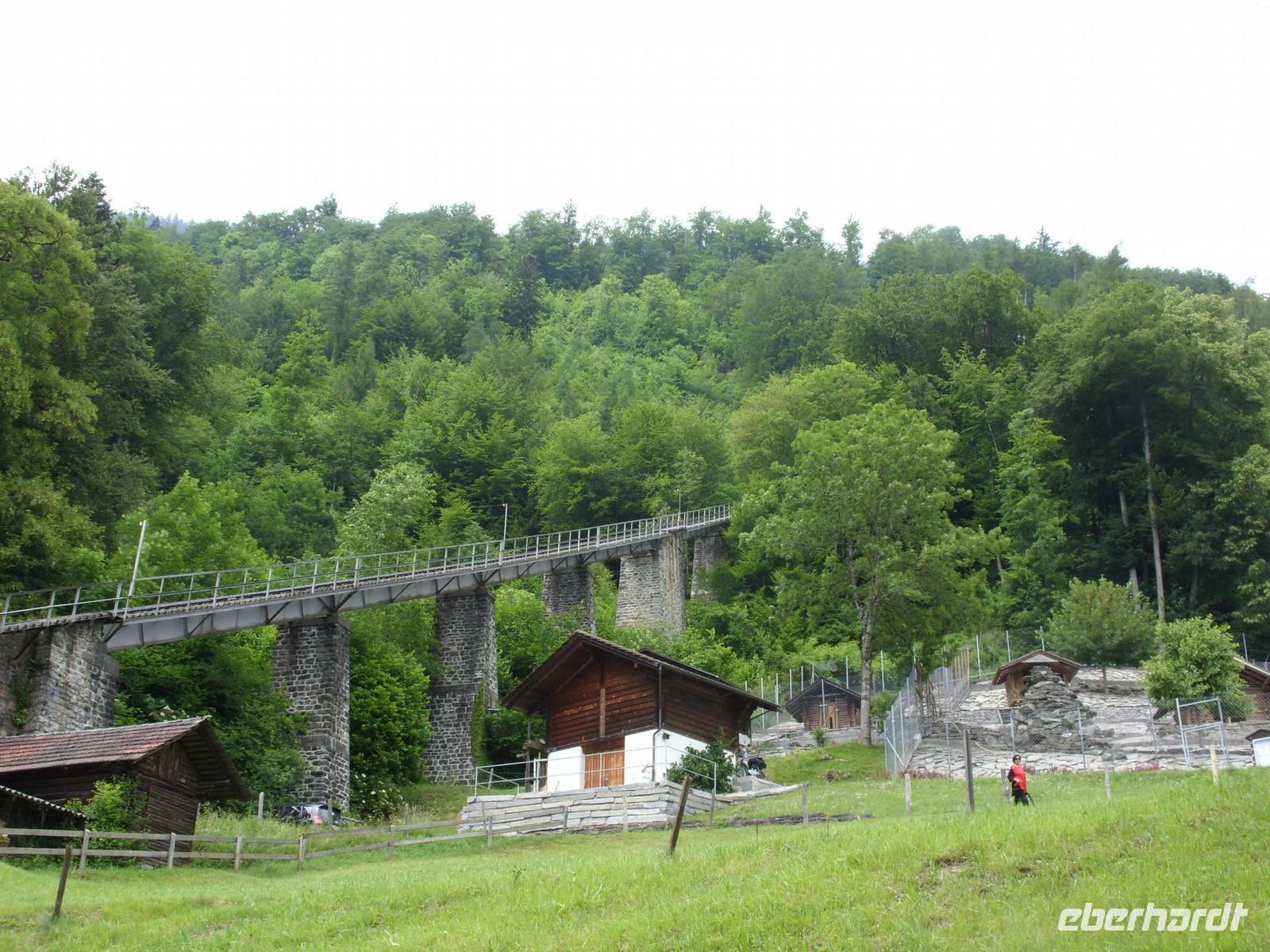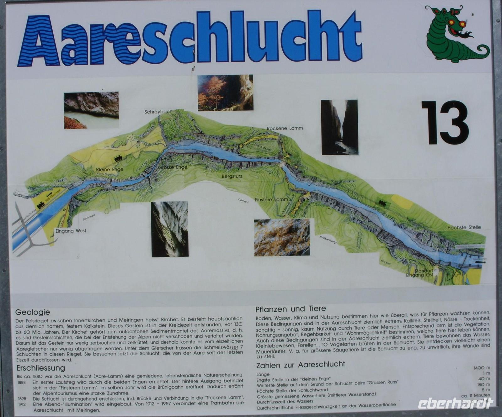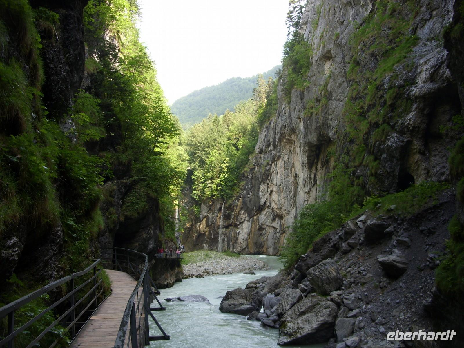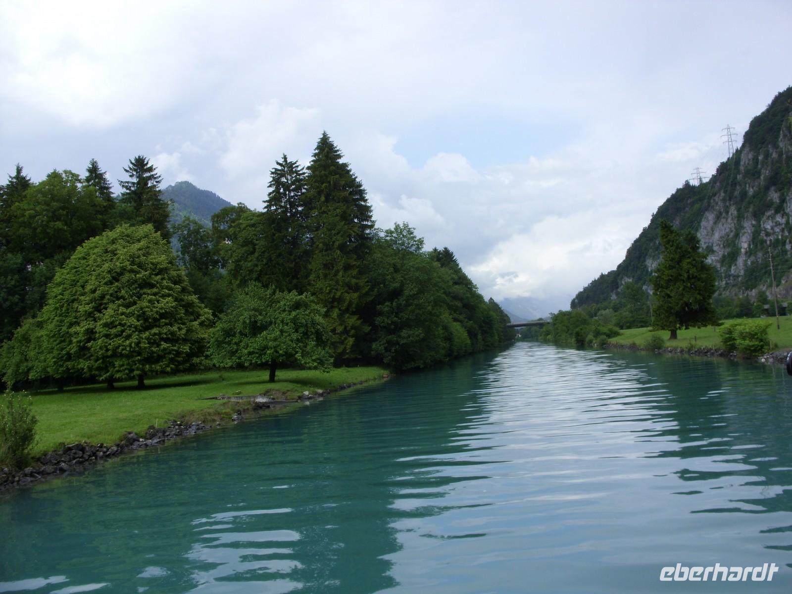 Unser erster richtiger Urlaubstag führte uns zunächst einmal aus dem Tal der Lütschine wieder hinaus. Wir fuhren gen Interlaken und bogen dort nach Osten ab. Nach etwa einer Stunden Fahrt erreichten wir den Osteingang zur Aareschlucht. Über eine Länge von 1400 Meter hat sich hier die Aare durch den Kalkfelsen gegraben, um dann mit fast 12 Stundenkilometer die Schlucht wieder zu verlassen. Dieses sagenhafte Naturschauspiel wollten wir natürlich aus nächster Nähe sehen. So wanderten wir also über die an der südlichen Felswand angebrachten Holzstege durch die Schluchte und staunten über die zum Teil 180 Meter steil aufragenden Felsen oder die engste Stelle mnit gerade einmal einem Meter Breite.