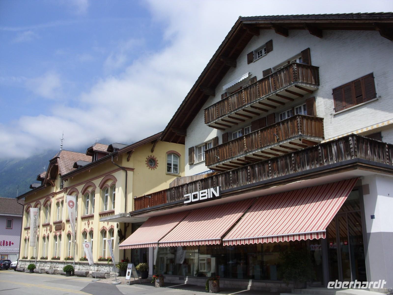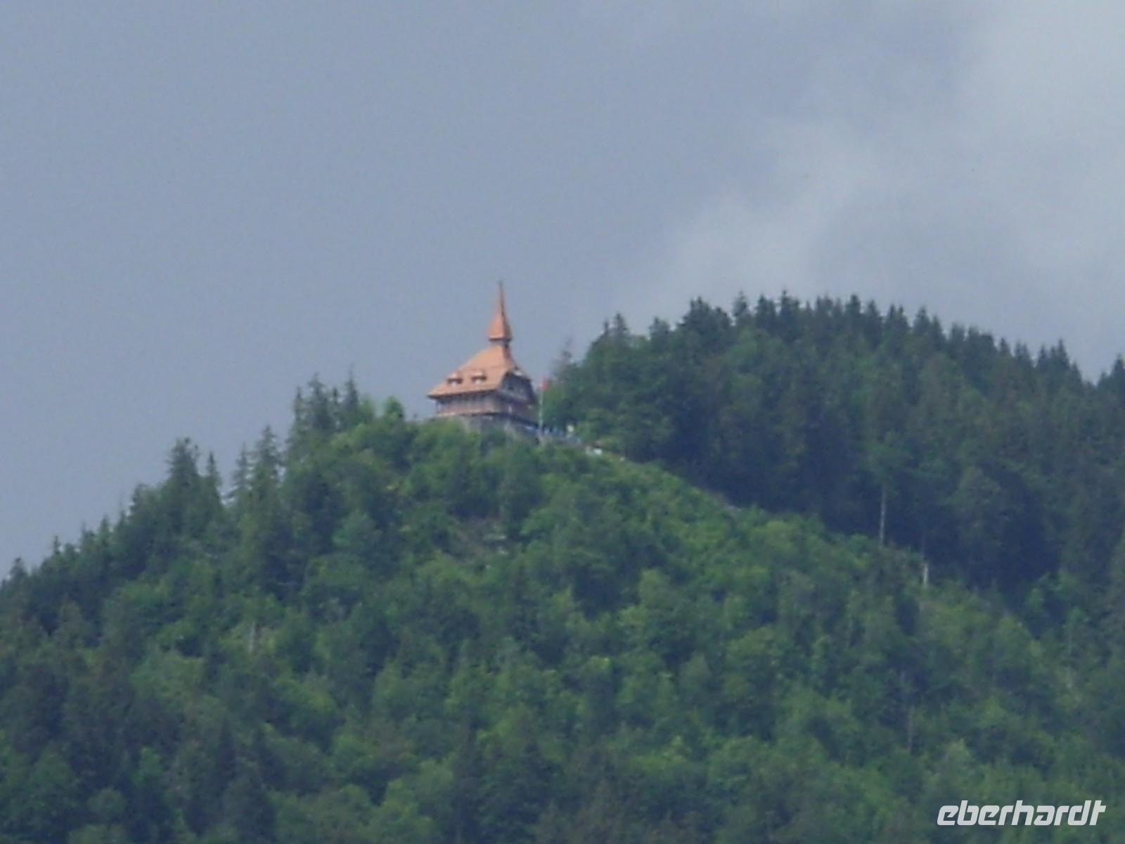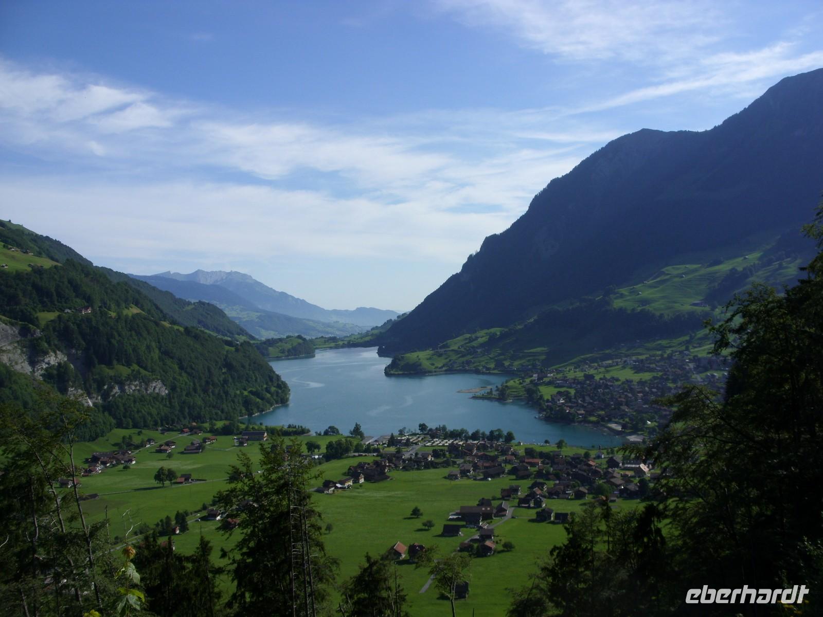 Nach diesem Naturschauspiel fuhren wir die wenige Kilometer nach Meiringen, beliebter Aufenthaltsort von Sir Arthur Conan Dolye, der hier maßgeblich Ideen für seine Kriminalfigur Sherlock Holmes sammelte. Die bei Meiringen liegenden Reichenbachfälle dienten schließlich sogar als Todesort für die fiktive Figur. So war es natürlich an der Tagesordnung einen Fotostopp am Sherlock-Holmes-Denkmal und der dahinter sich befindlichen englischen Kirche zu machen. Anschließend setzten wir unsere Fahrt in Richtung Brienz am herrlich blauen Brienzer See fort. Dort angekommen besuchten wir zunächst die Holschnitzerei Jobin. Danach lud die Strandpromenade zum Bummeln und Verweilen ein ehe es am Bus einen kleinen Imbiss gab. So langsam hatte nun auch die Sonne die Oberhand über die Wolken gewonnen und so waren wir guter Dinge, dass wir in Interlaken auf den Harder Kulm fahren könnten um von dort oben die herrliche Sicht auf die Berner Bergwelt zu genießen.