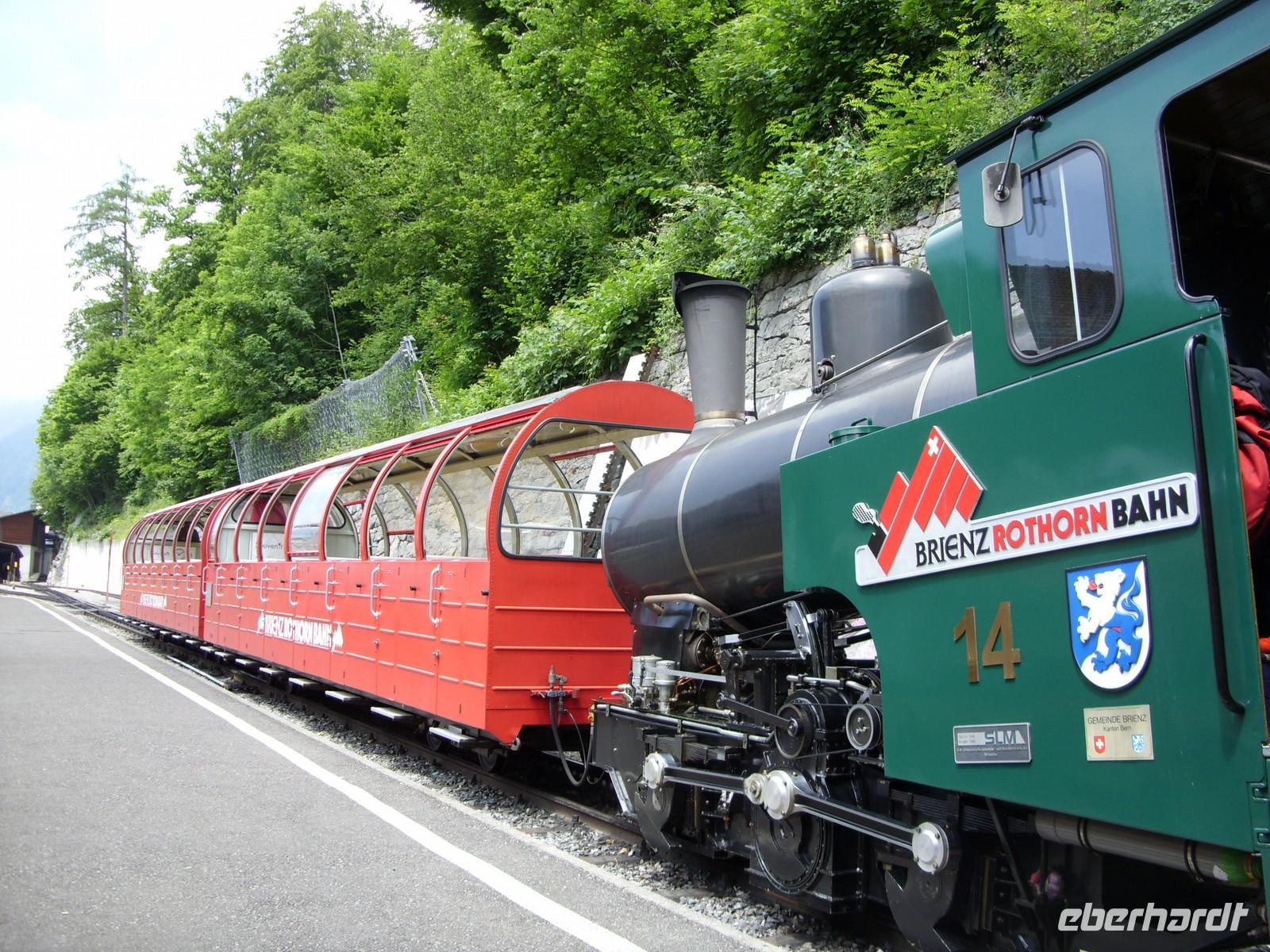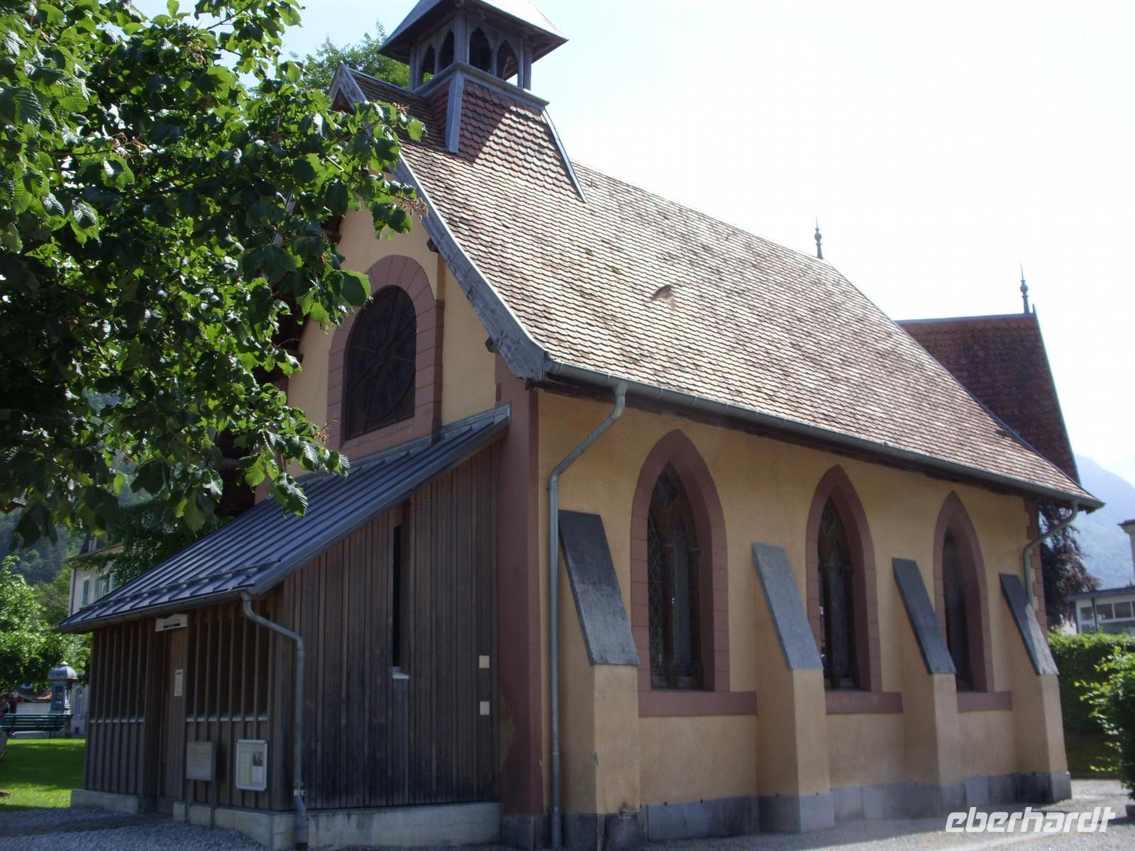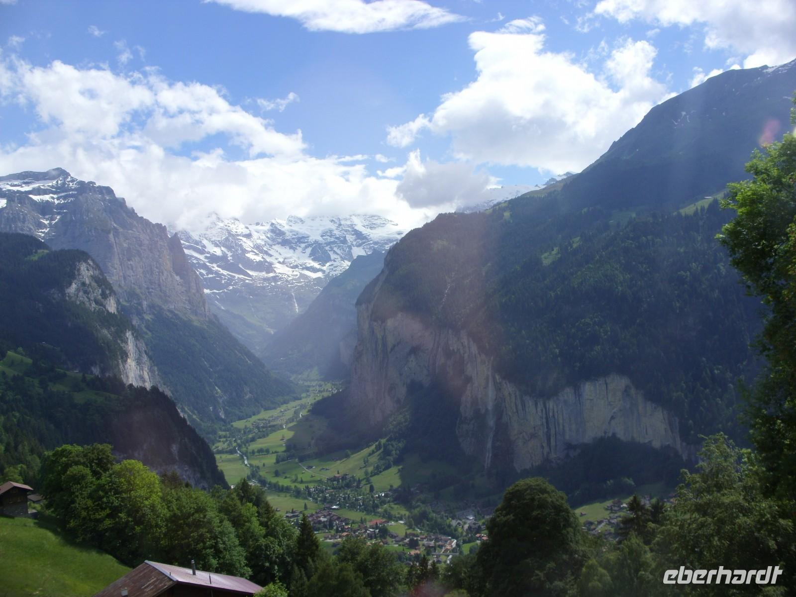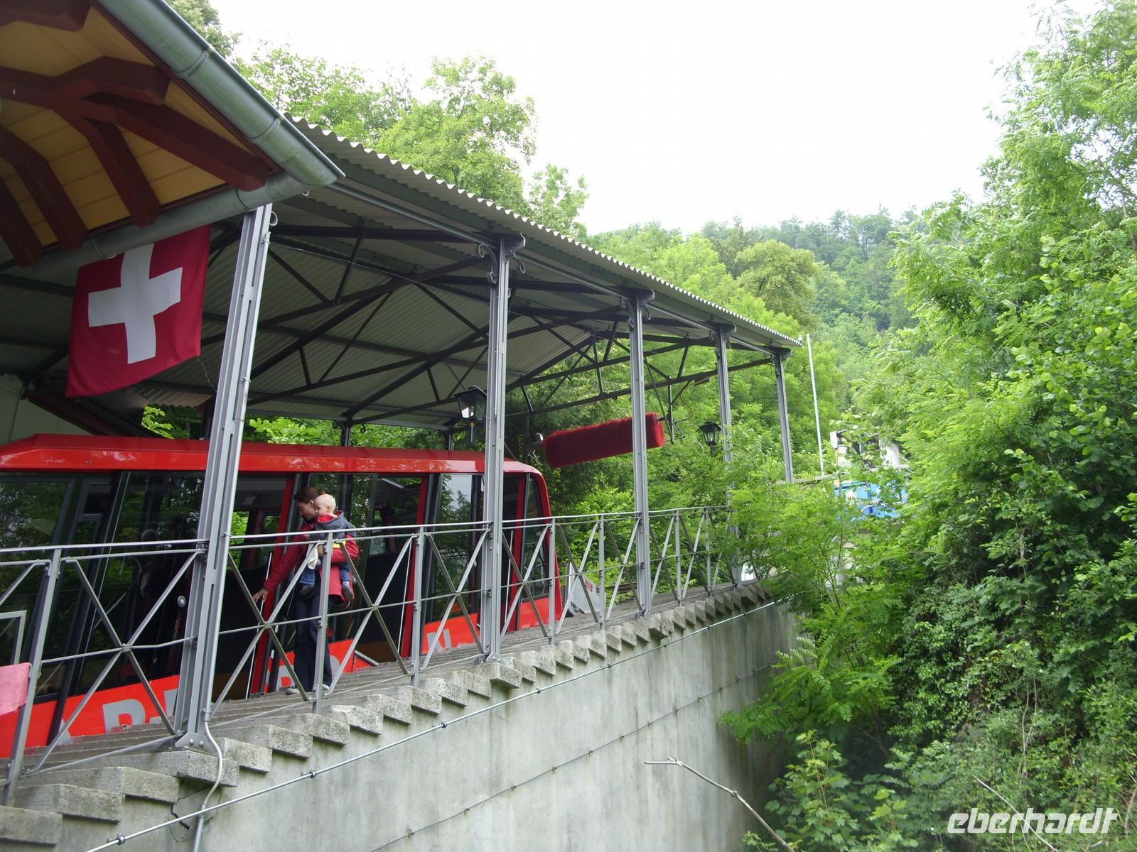 Nach diesem Naturschauspiel fuhren wir die wenige Kilometer nach Meiringen, beliebter Aufenthaltsort von Sir Arthur Conan Dolye, der hier maßgeblich Ideen für seine Kriminalfigur Sherlock Holmes sammelte. Die bei Meiringen liegenden Reichenbachfälle dienten schließlich sogar als Todesort für die fiktive Figur. So war es natürlich an der Tagesordnung einen Fotostopp am Sherlock-Holmes-Denkmal und der dahinter sich befindlichen englischen Kirche zu machen. Anschließend setzten wir unsere Fahrt in Richtung Brienz am herrlich blauen Brienzer See fort. Dort angekommen besuchten wir zunächst die Holschnitzerei Jobin. Danach lud die Strandpromenade zum Bummeln und Verweilen ein ehe es am Bus einen kleinen Imbiss gab. So langsam hatte nun auch die Sonne die Oberhand über die Wolken gewonnen und so waren wir guter Dinge, dass wir in Interlaken auf den Harder Kulm fahren könnten um von dort oben die herrliche Sicht auf die Berner Bergwelt zu genießen.