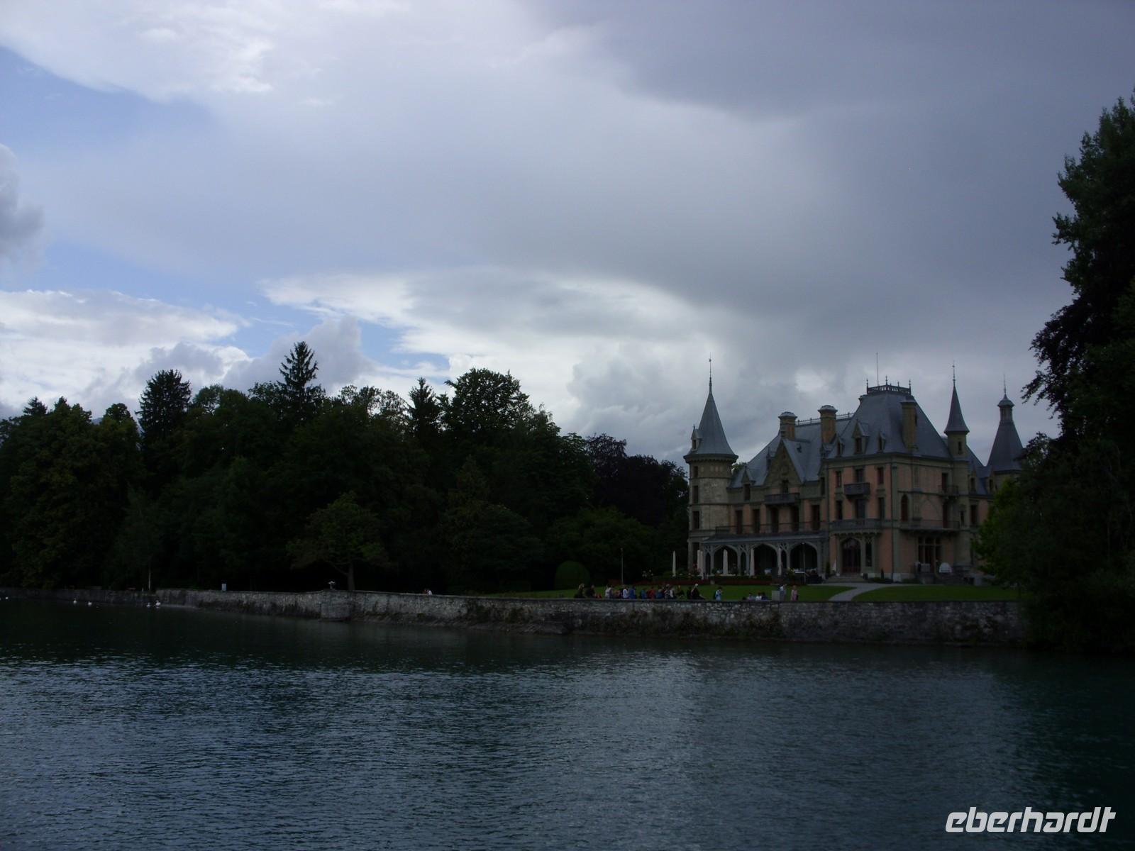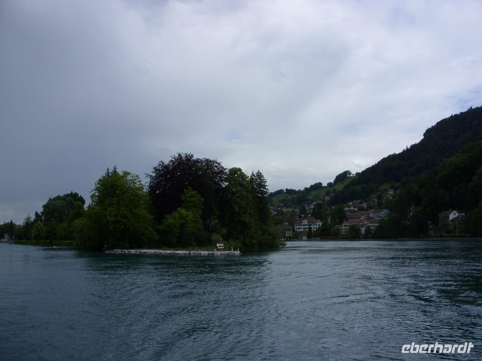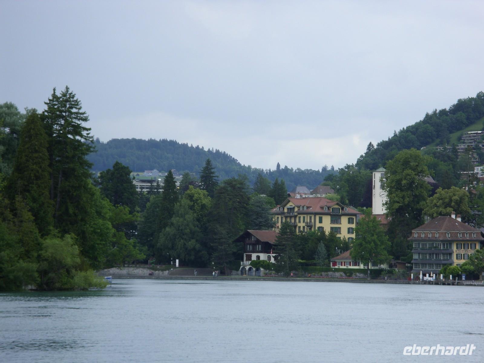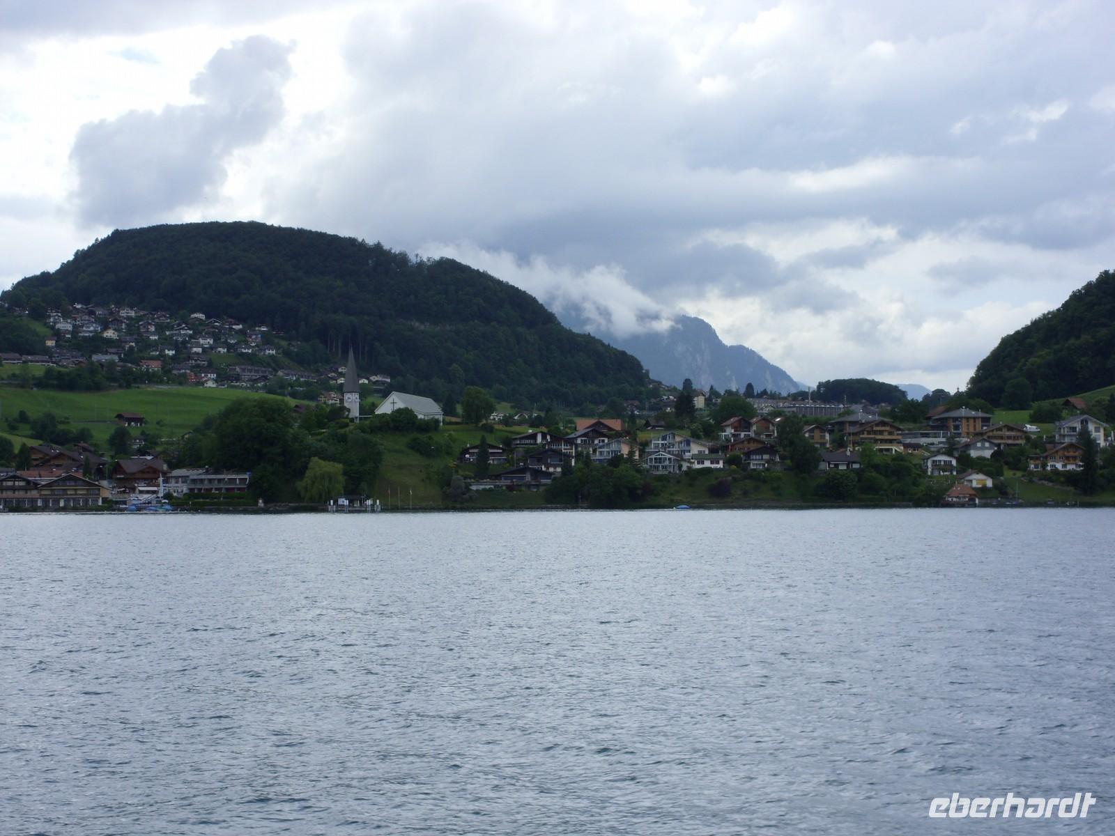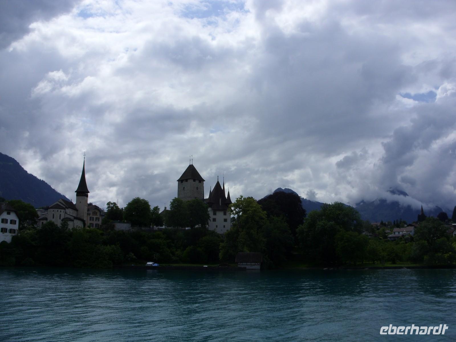 Am Mittag wartete dann schon unser Bus auf uns. Vorbei an Interlaken erreichten wir die Nordseite des Thuner Sees und folgten hier die zum Teil recht kurvenreiche und schmale Straße bis nach Thun. Unterhalb des Schlosses Hünegg legten wir einen kurzen Fotostopp ein, den wir gleich zur verspäteten Mittagsversorgung nutzten. Nun waren es nur noch wenige Meter bis Thun, welches wir während eines kurzen Besuches kennenlernten. Direkt am See gelegen ist Thun auch aufgrund ihres die Stadt überragenden Schlosses und der alten Festungsmauern sehr sehenswert. Doch schon bald wartete das Ausflugsschiff auf uns. An Bord wurden wir sogleich mit Kaffee & Kuchen verwöhnt und dann ging es auch schon los. Mehr als zwei Stunden schipperten wir über den Thuner See ? einmal ging es ans Südufer, dann wieder ans Nordufer und so fuhren wir im Zickzack über den See. Dabei genossen wir den Sonnenschein und den herrlichen Blick auf die umliegenden Berge, die jedoch ein manches Mal hinter einer Gewitterwolke verschwanden.