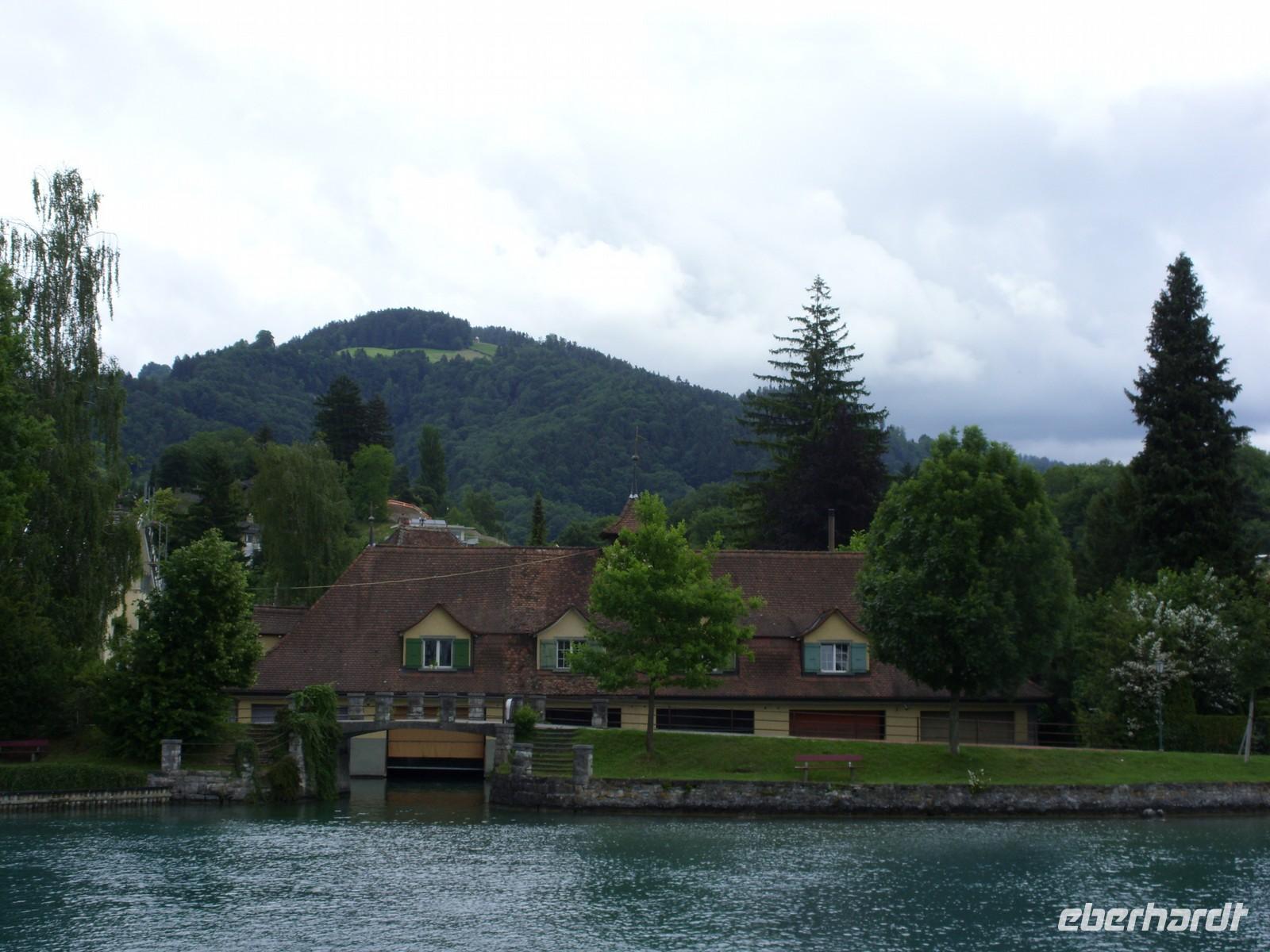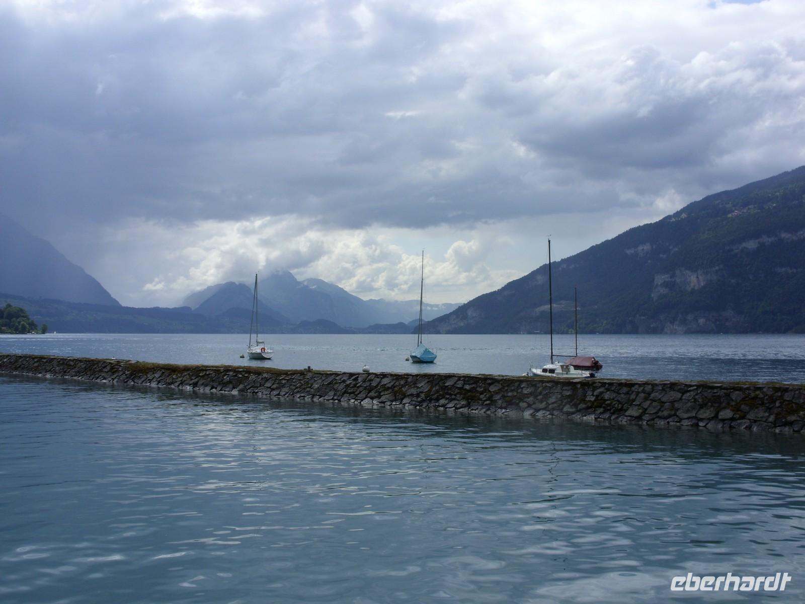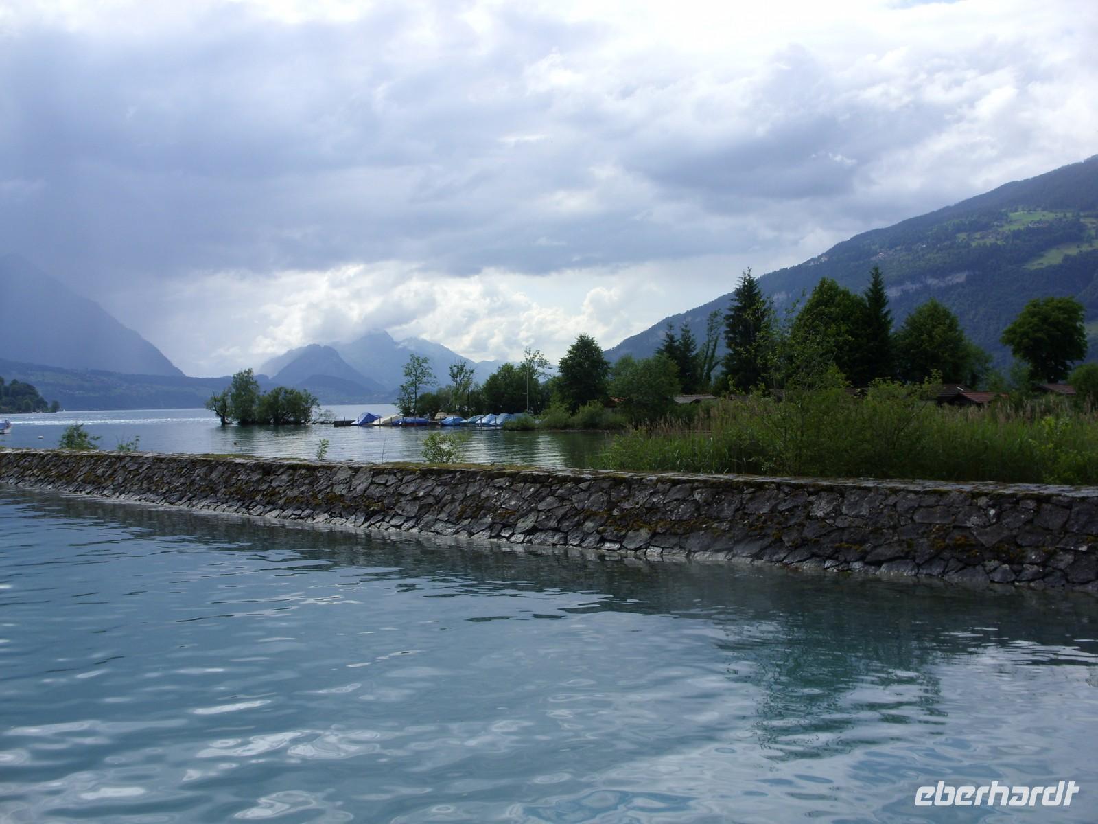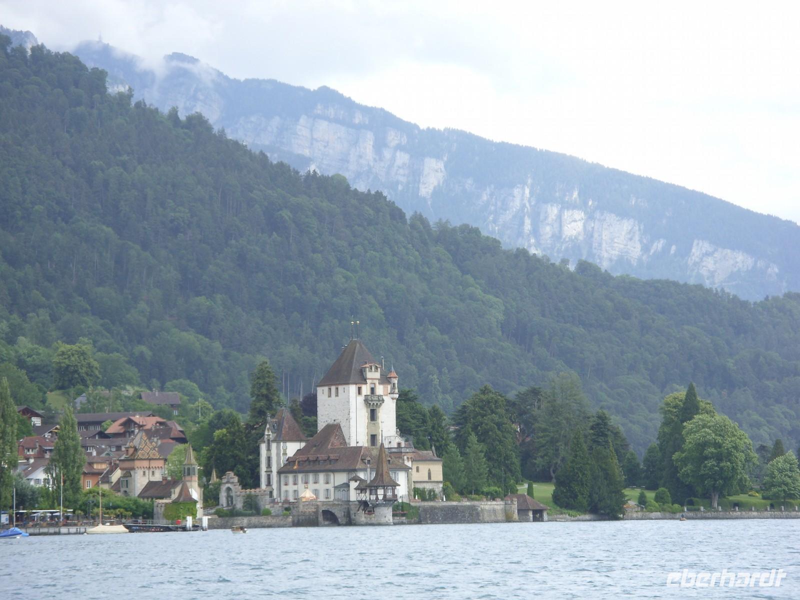 Am Mittag wartete dann schon unser Bus auf uns. Vorbei an Interlaken erreichten wir die Nordseite des Thuner Sees und folgten hier die zum Teil recht kurvenreiche und schmale Straße bis nach Thun. Unterhalb des Schlosses Hünegg legten wir einen kurzen Fotostopp ein, den wir gleich zur verspäteten Mittagsversorgung nutzten. Nun waren es nur noch wenige Meter bis Thun, welches wir während eines kurzen Besuches kennenlernten. Direkt am See gelegen ist Thun auch aufgrund ihres die Stadt überragenden Schlosses und der alten Festungsmauern sehr sehenswert. Doch schon bald wartete das Ausflugsschiff auf uns. An Bord wurden wir sogleich mit Kaffee & Kuchen verwöhnt und dann ging es auch schon los. Mehr als zwei Stunden schipperten wir über den Thuner See ? einmal ging es ans Südufer, dann wieder ans Nordufer und so fuhren wir im Zickzack über den See. Dabei genossen wir den Sonnenschein und den herrlichen Blick auf die umliegenden Berge, die jedoch ein manches Mal hinter einer Gewitterwolke verschwanden.