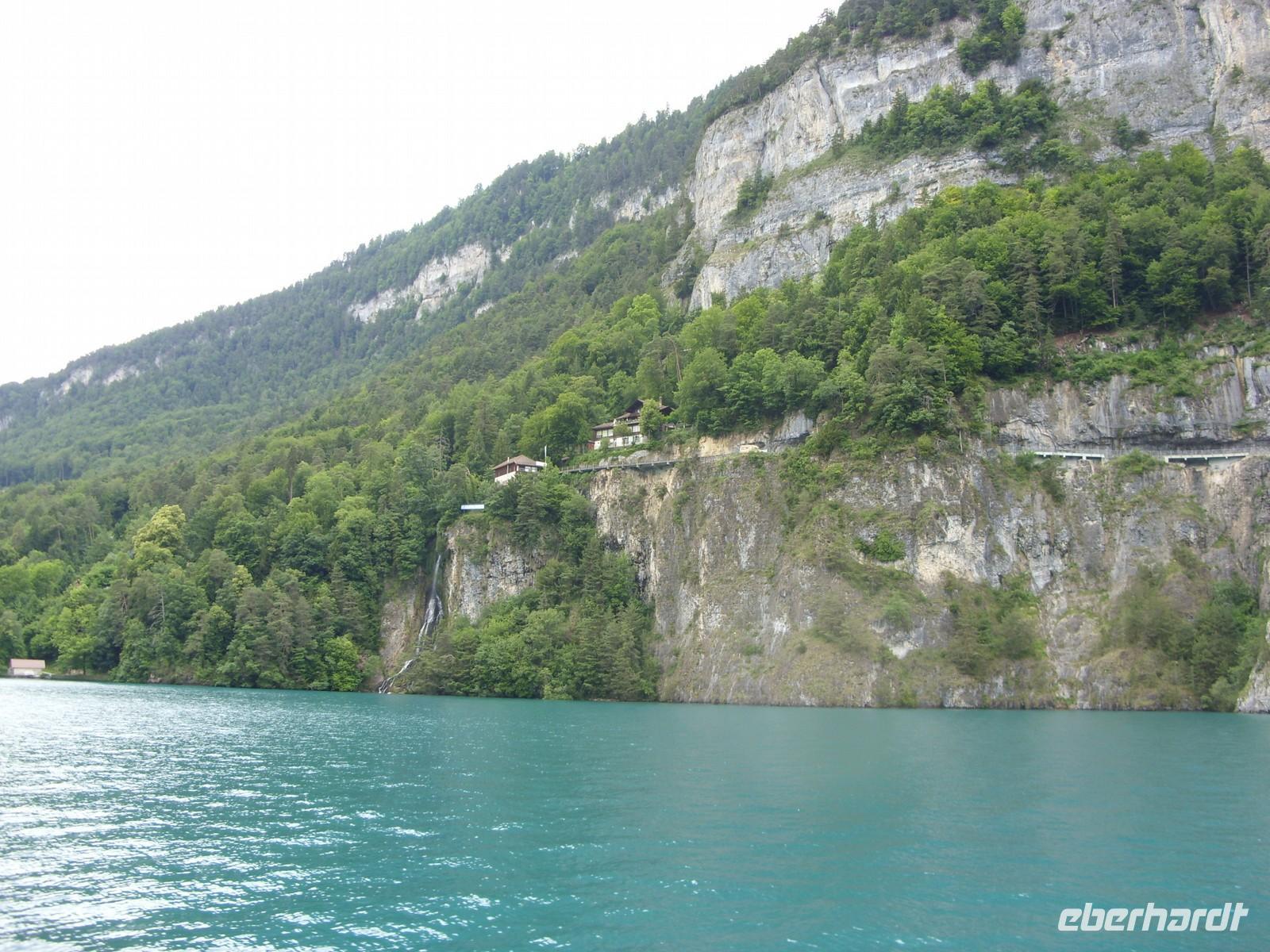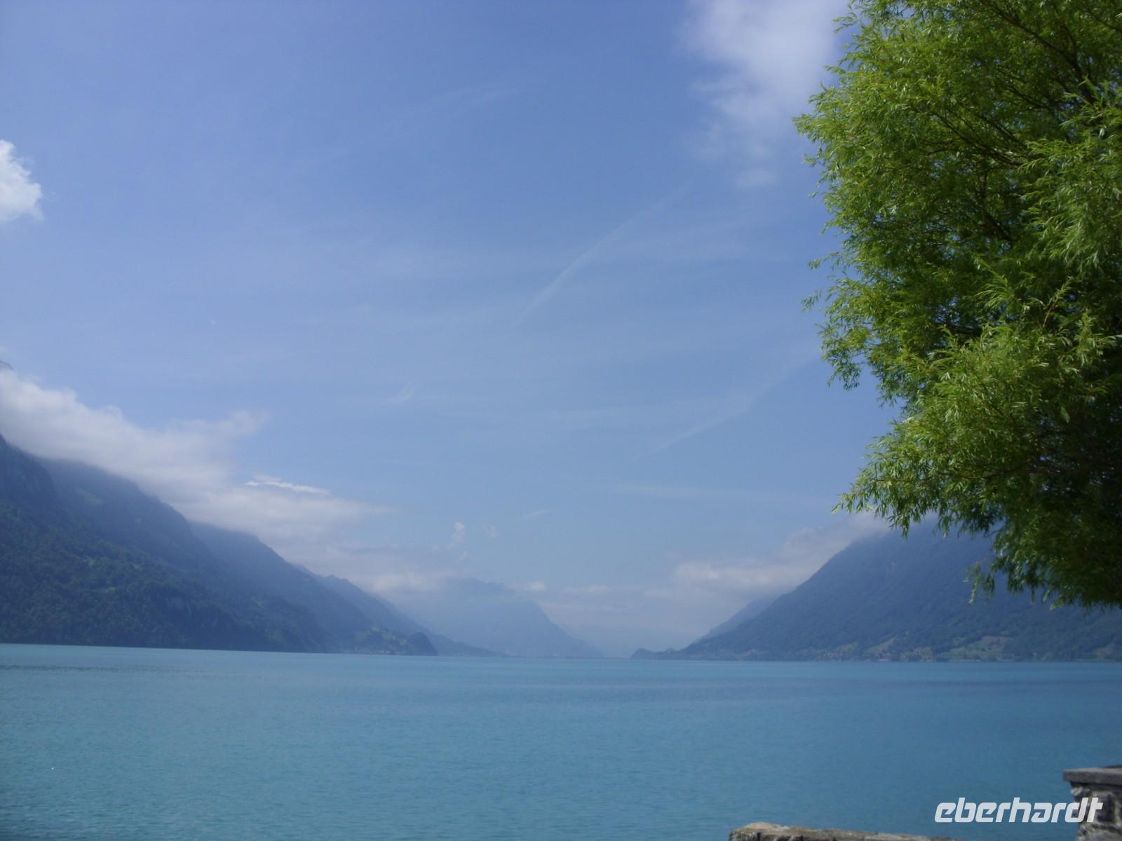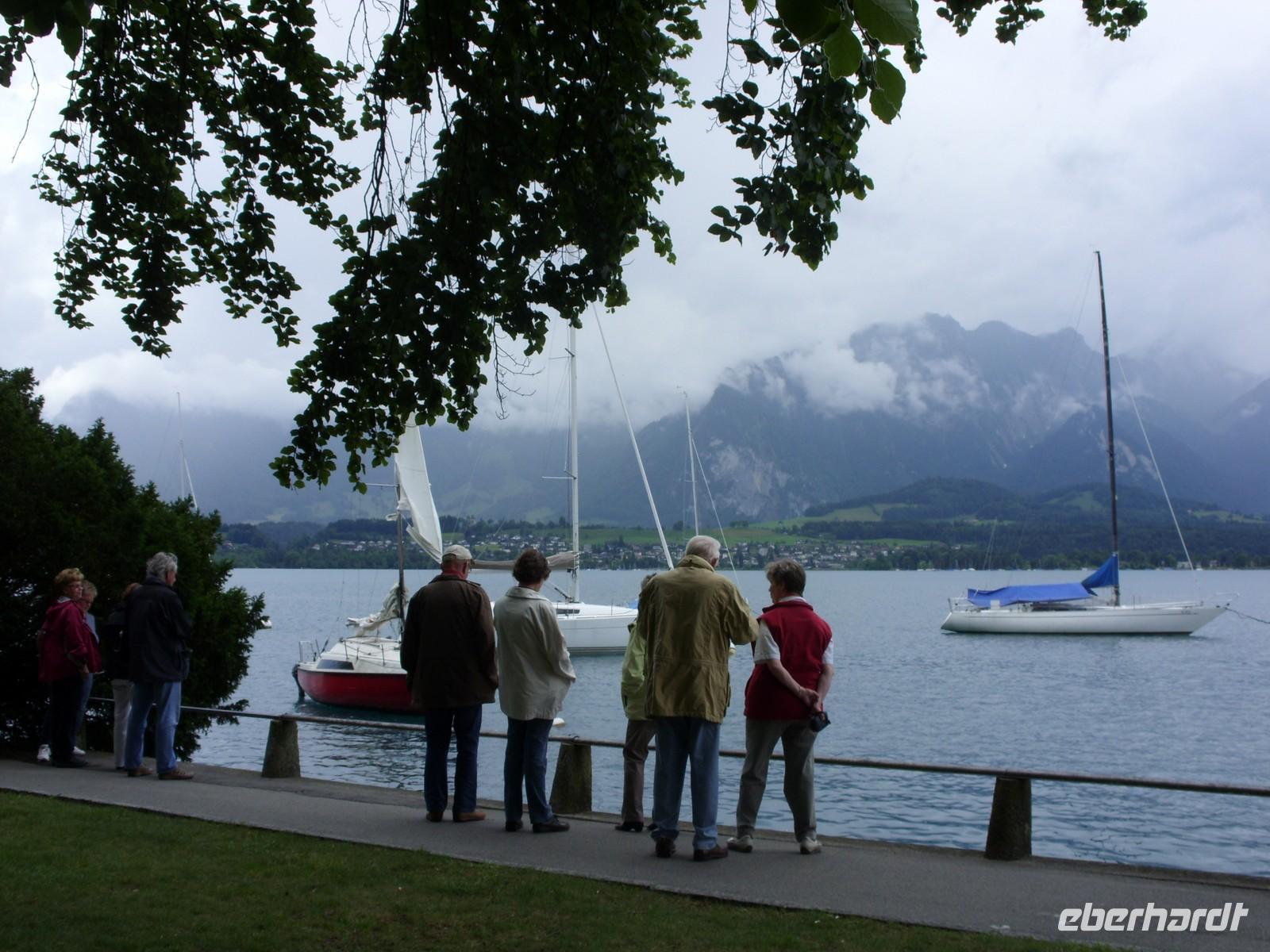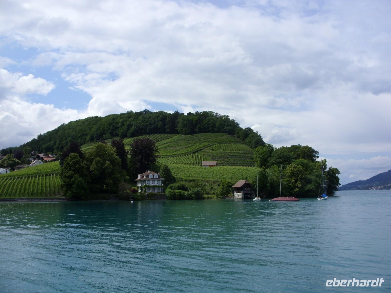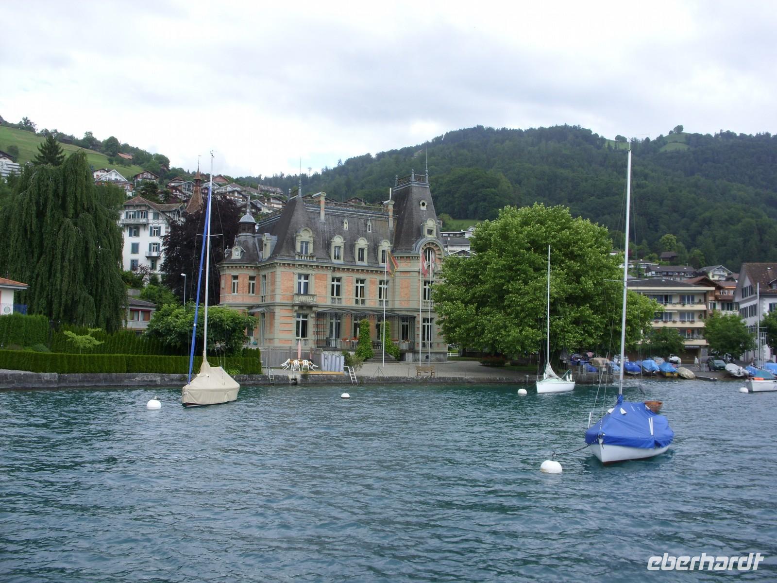 Am Mittag wartete dann schon unser Bus auf uns. Vorbei an Interlaken erreichten wir die Nordseite des Thuner Sees und folgten hier die zum Teil recht kurvenreiche und schmale Straße bis nach Thun. Unterhalb des Schlosses Hünegg legten wir einen kurzen Fotostopp ein, den wir gleich zur verspäteten Mittagsversorgung nutzten. Nun waren es nur noch wenige Meter bis Thun, welches wir während eines kurzen Besuches kennenlernten. Direkt am See gelegen ist Thun auch aufgrund ihres die Stadt überragenden Schlosses und der alten Festungsmauern sehr sehenswert. Doch schon bald wartete das Ausflugsschiff auf uns. An Bord wurden wir sogleich mit Kaffee & Kuchen verwöhnt und dann ging es auch schon los. Mehr als zwei Stunden schipperten wir über den Thuner See ? einmal ging es ans Südufer, dann wieder ans Nordufer und so fuhren wir im Zickzack über den See. Dabei genossen wir den Sonnenschein und den herrlichen Blick auf die umliegenden Berge, die jedoch ein manches Mal hinter einer Gewitterwolke verschwanden.