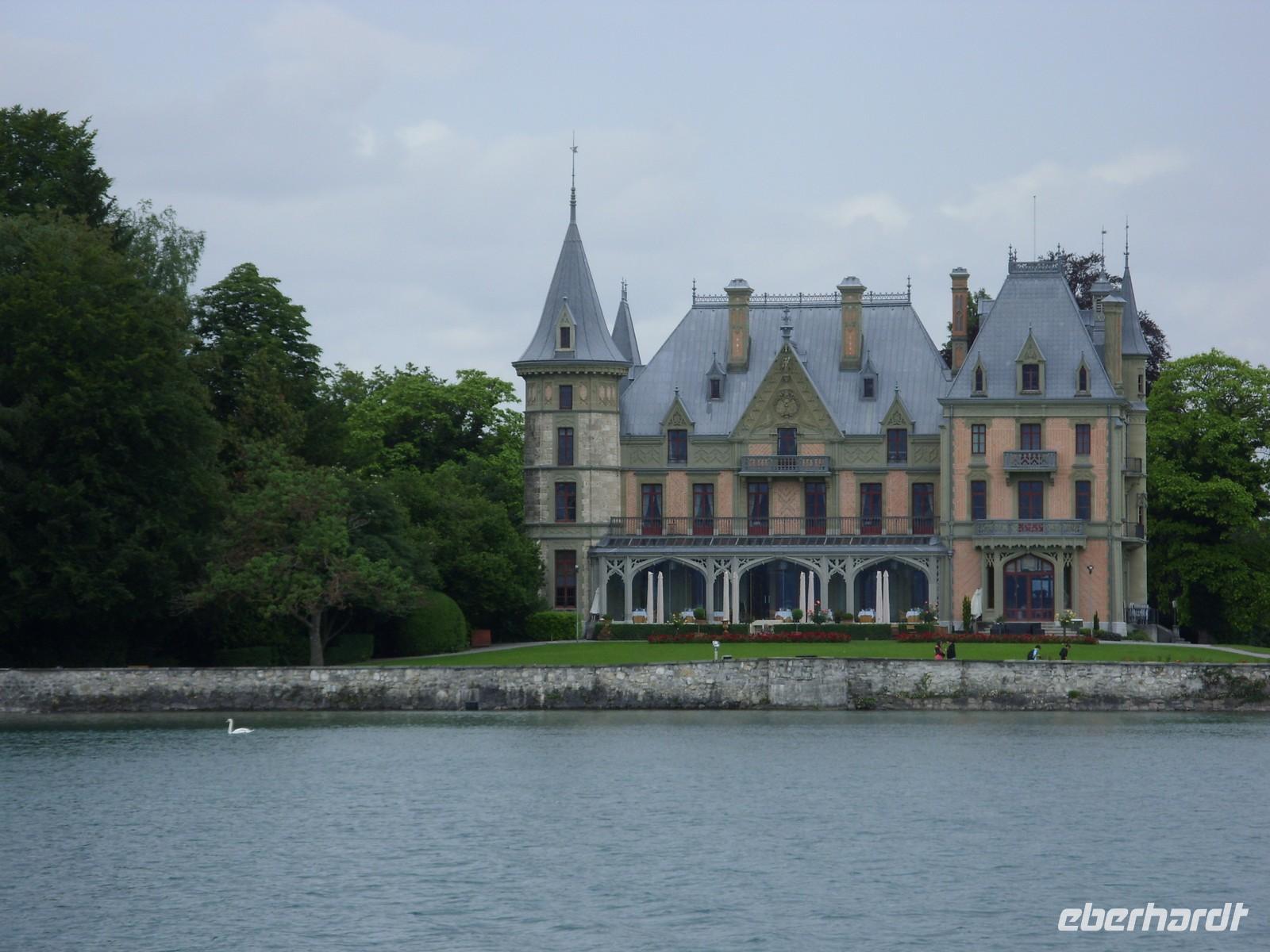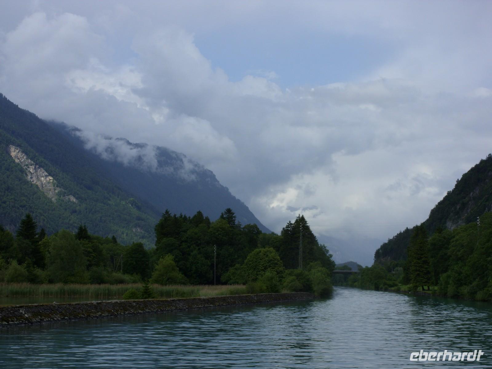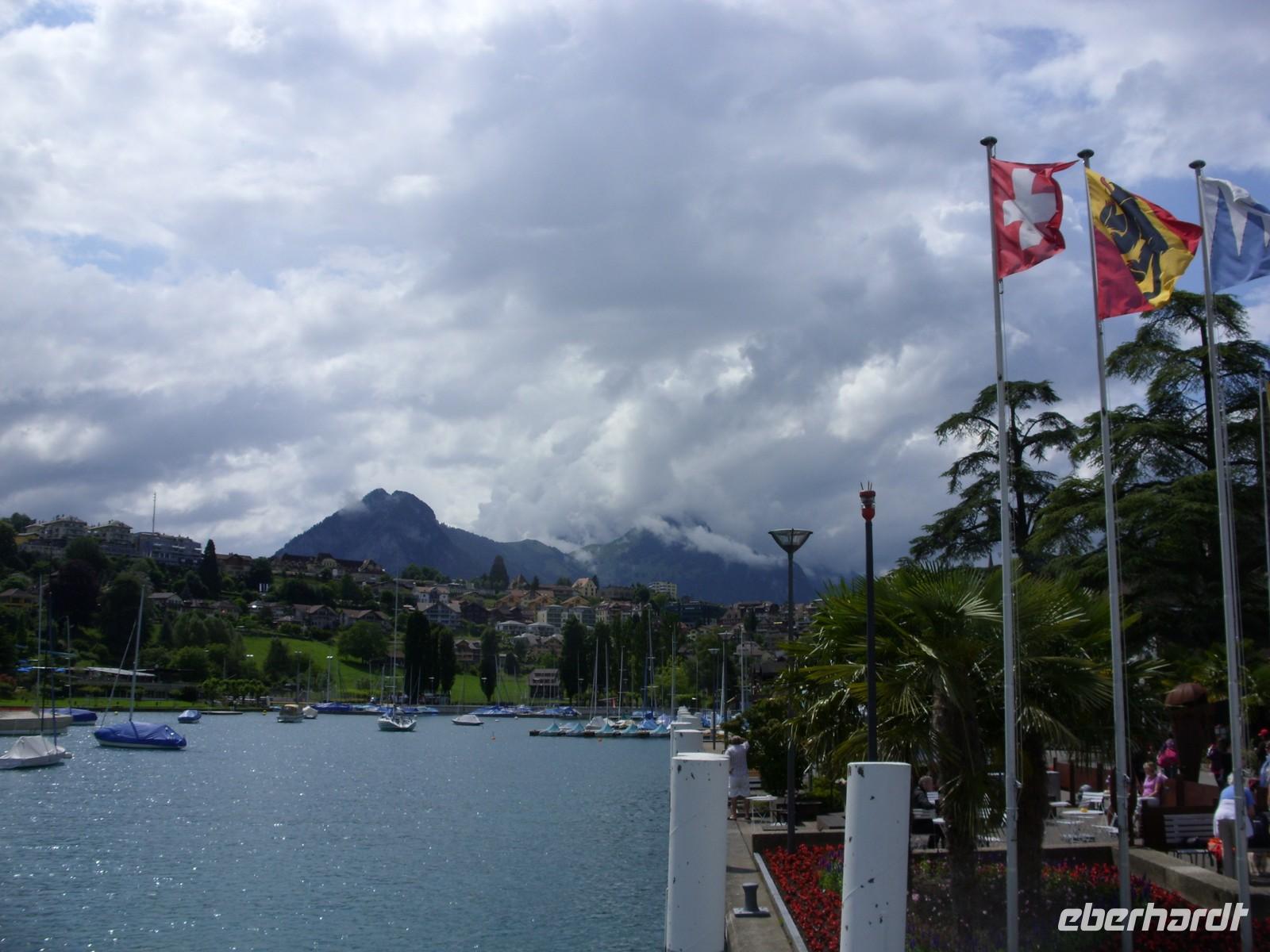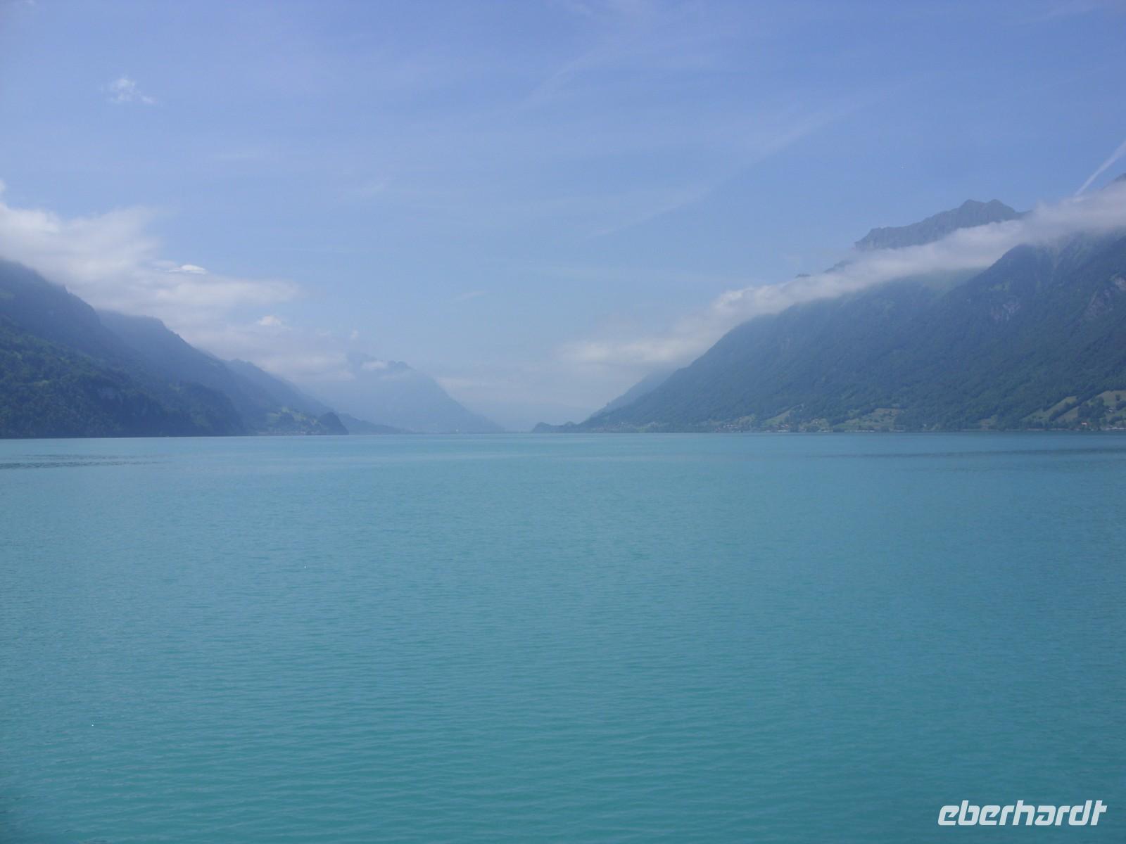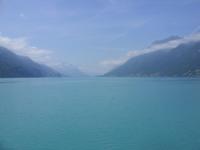 Am Mittag wartete dann schon unser Bus auf uns. Vorbei an Interlaken erreichten wir die Nordseite des Thuner Sees und folgten hier die zum Teil recht kurvenreiche und schmale Straße bis nach Thun. Unterhalb des Schlosses Hünegg legten wir einen kurzen Fotostopp ein, den wir gleich zur verspäteten Mittagsversorgung nutzten. Nun waren es nur noch wenige Meter bis Thun, welches wir während eines kurzen Besuches kennenlernten. Direkt am See gelegen ist Thun auch aufgrund ihres die Stadt überragenden Schlosses und der alten Festungsmauern sehr sehenswert. Doch schon bald wartete das Ausflugsschiff auf uns. An Bord wurden wir sogleich mit Kaffee & Kuchen verwöhnt und dann ging es auch schon los. Mehr als zwei Stunden schipperten wir über den Thuner See ? einmal ging es ans Südufer, dann wieder ans Nordufer und so fuhren wir im Zickzack über den See. Dabei genossen wir den Sonnenschein und den herrlichen Blick auf die umliegenden Berge, die jedoch ein manches Mal hinter einer Gewitterwolke verschwanden.