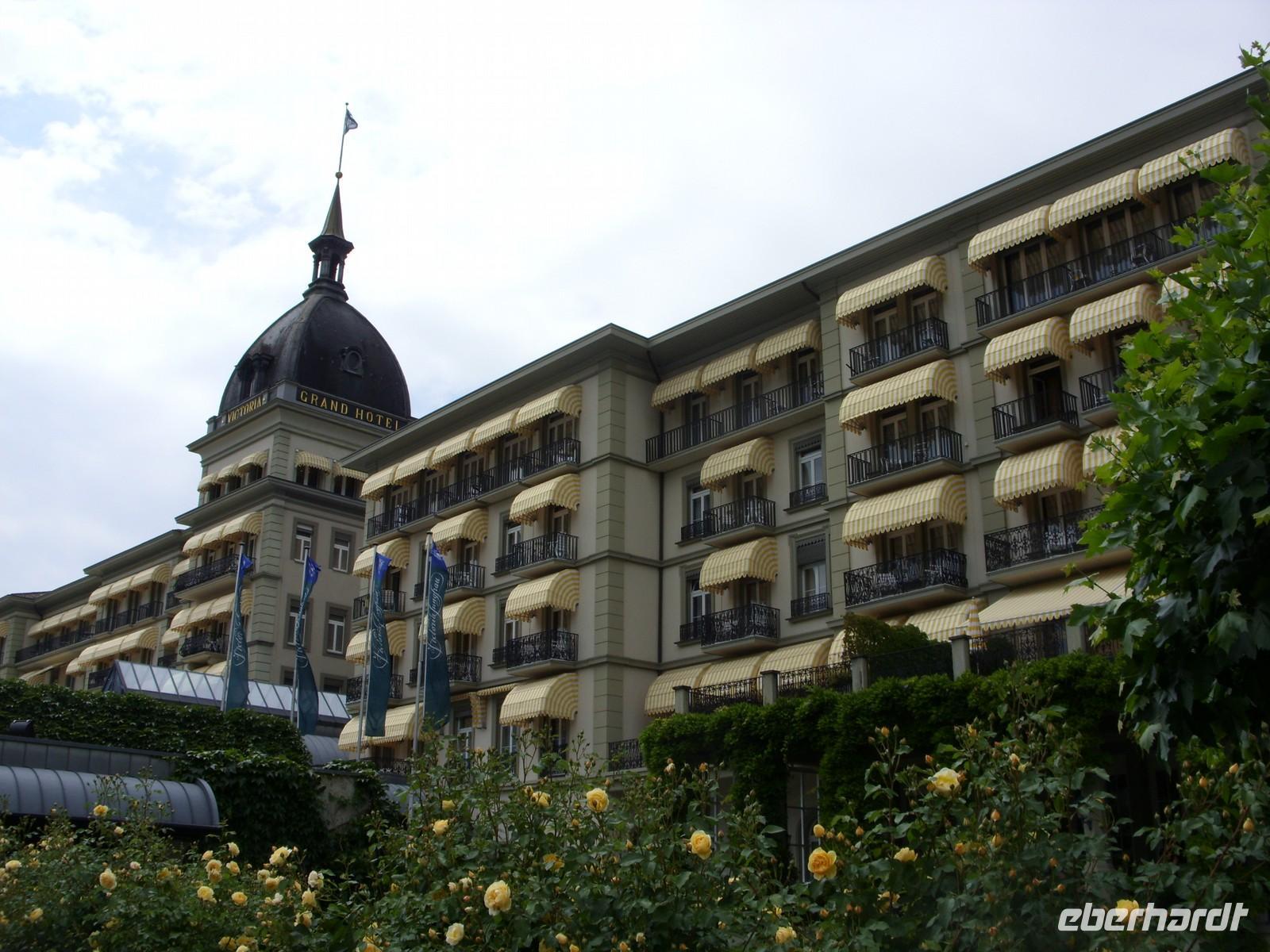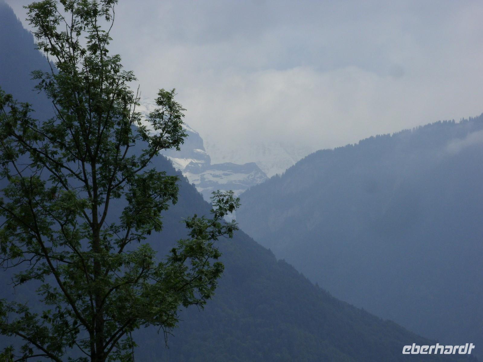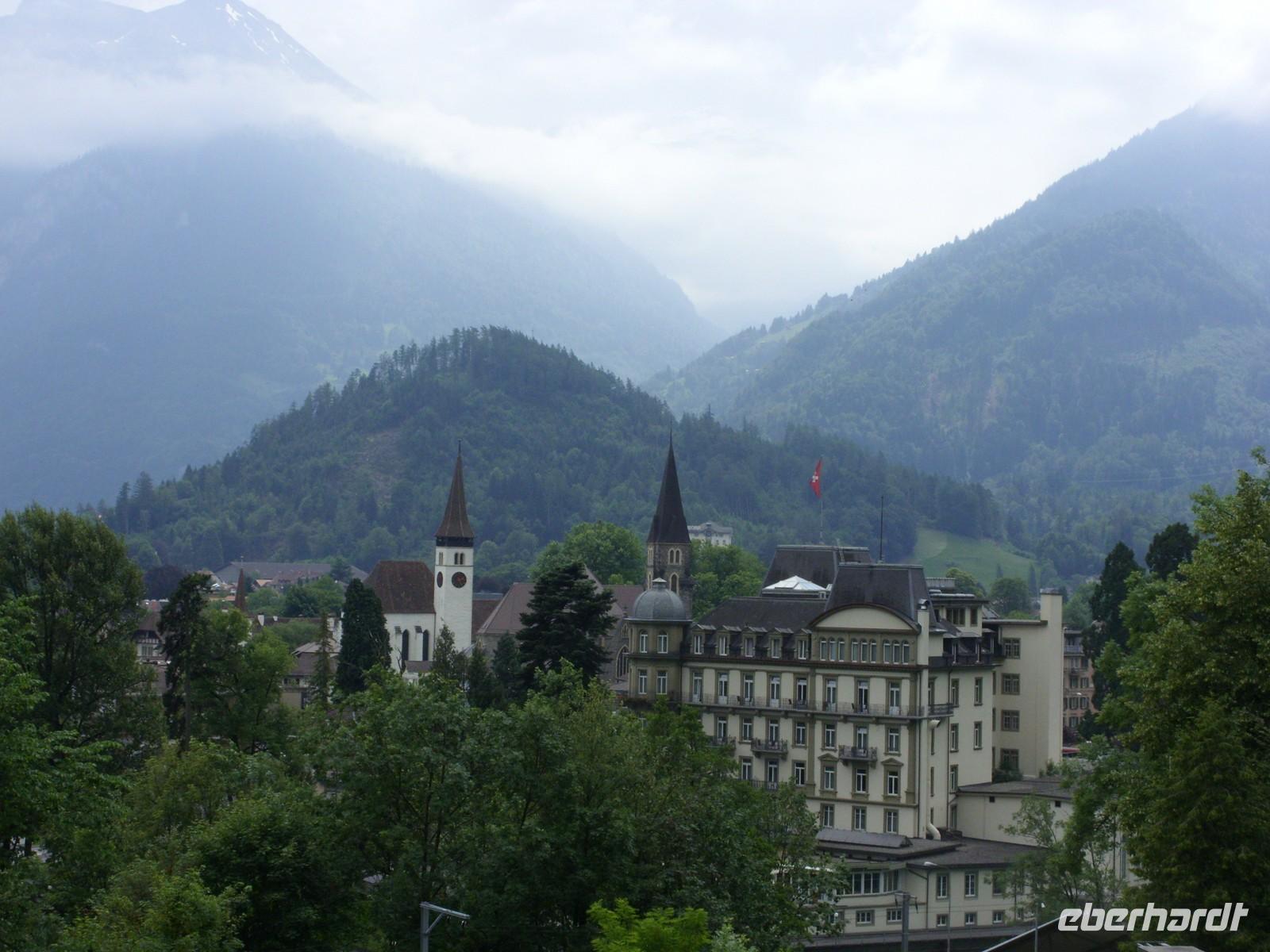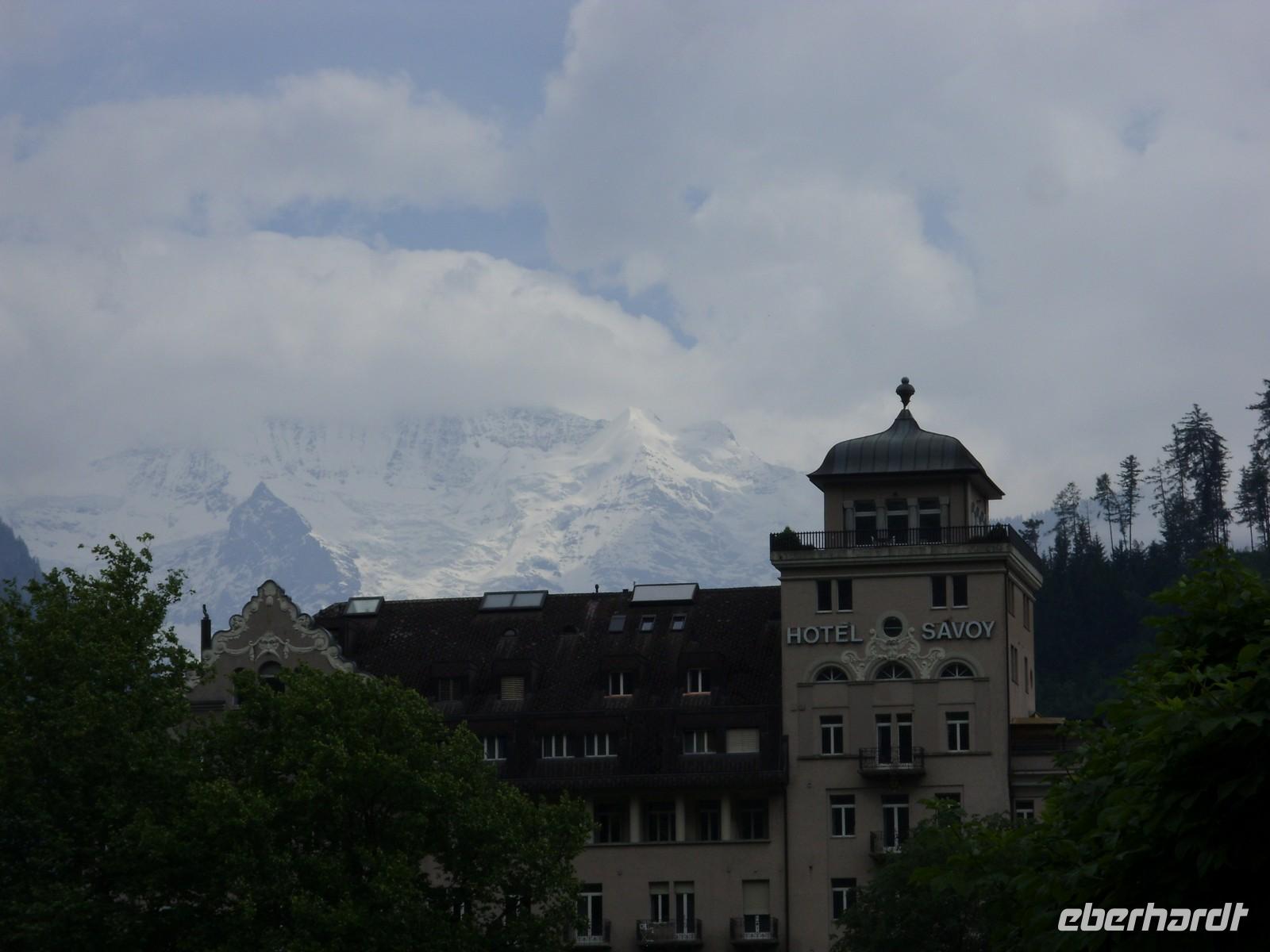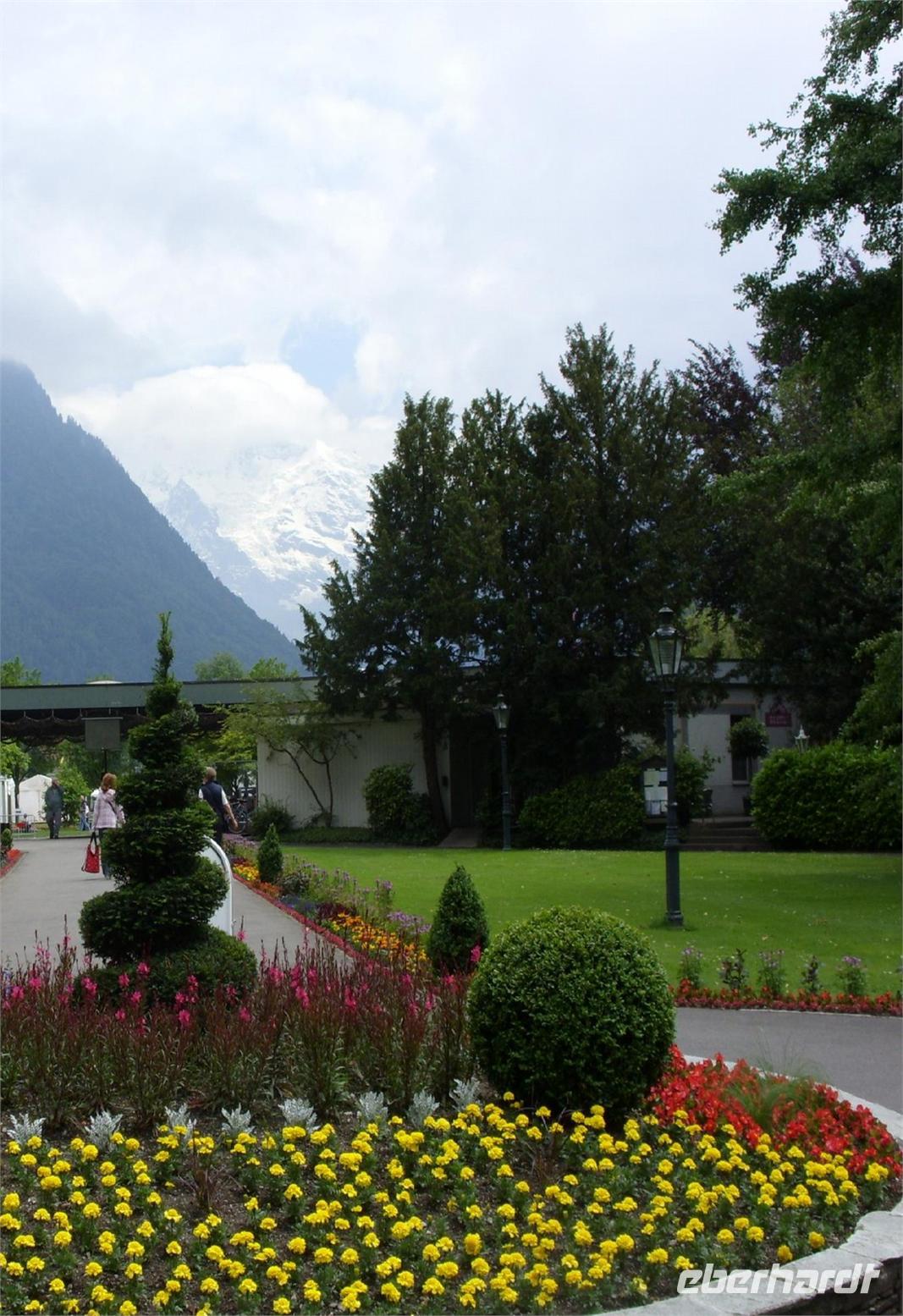 Frohen Mutes fuhren wir also nach Interlaken, doch just in dem Moment als wir unseren Bus parkten, hatte sich eine dicke Wolke um den Berg gelegt. Das lohnte also nicht wirklich ? Wir überzeugten uns noch per Webcam von der nicht vorhandenen Sicht. Danach blieb der Bummel durch das mondäne Interlaken. An der Aare standen schöne Bänke, am Höhenweg gab es nette Cafés, der Park um das Casino war eine grüne Oase ? jeder konnte das Flair auf eigene Art und Weise genießen.Schließlich zeigten sich auch noch die schneebedeckten Berge des Berner Oberlandes!