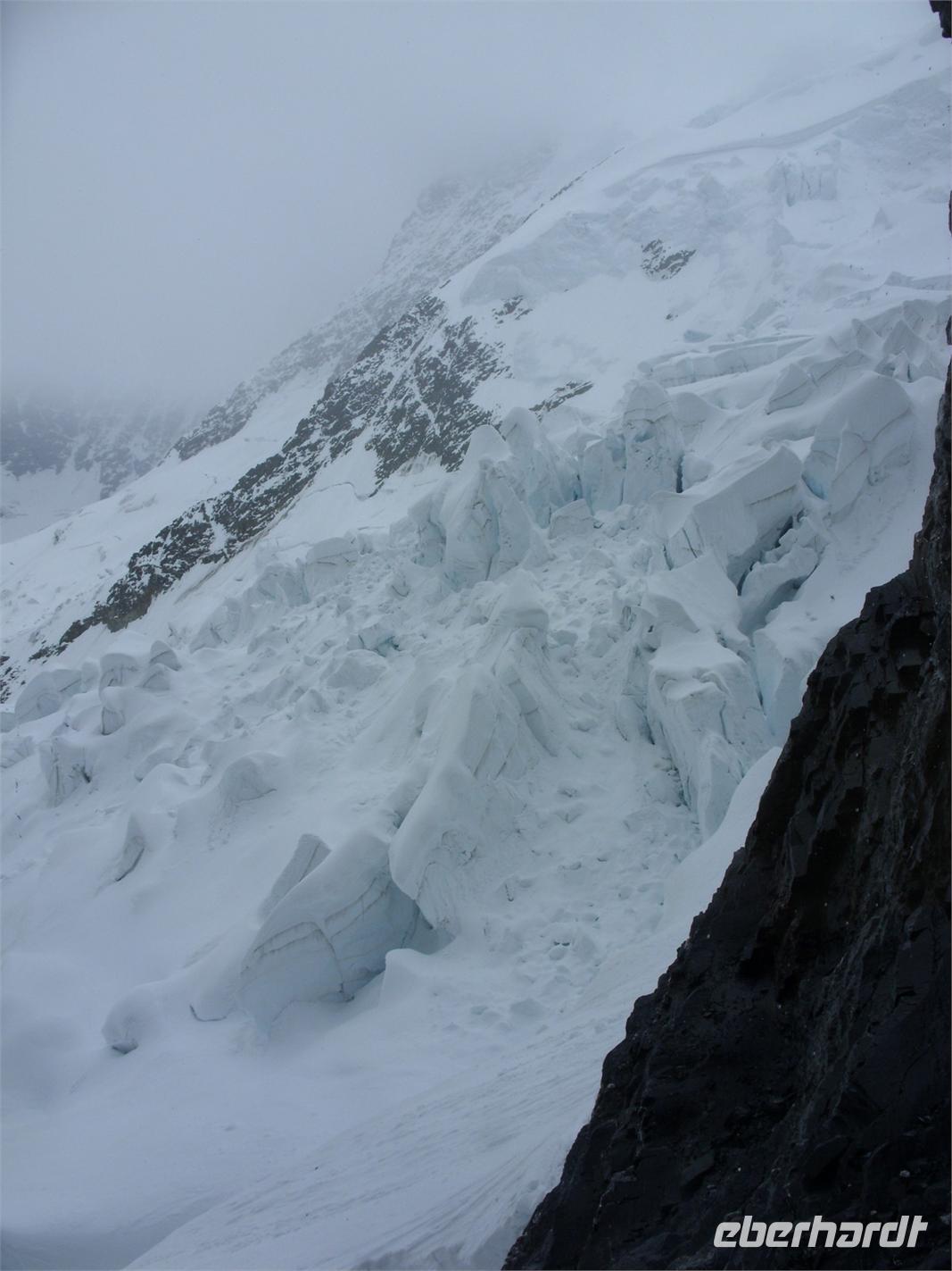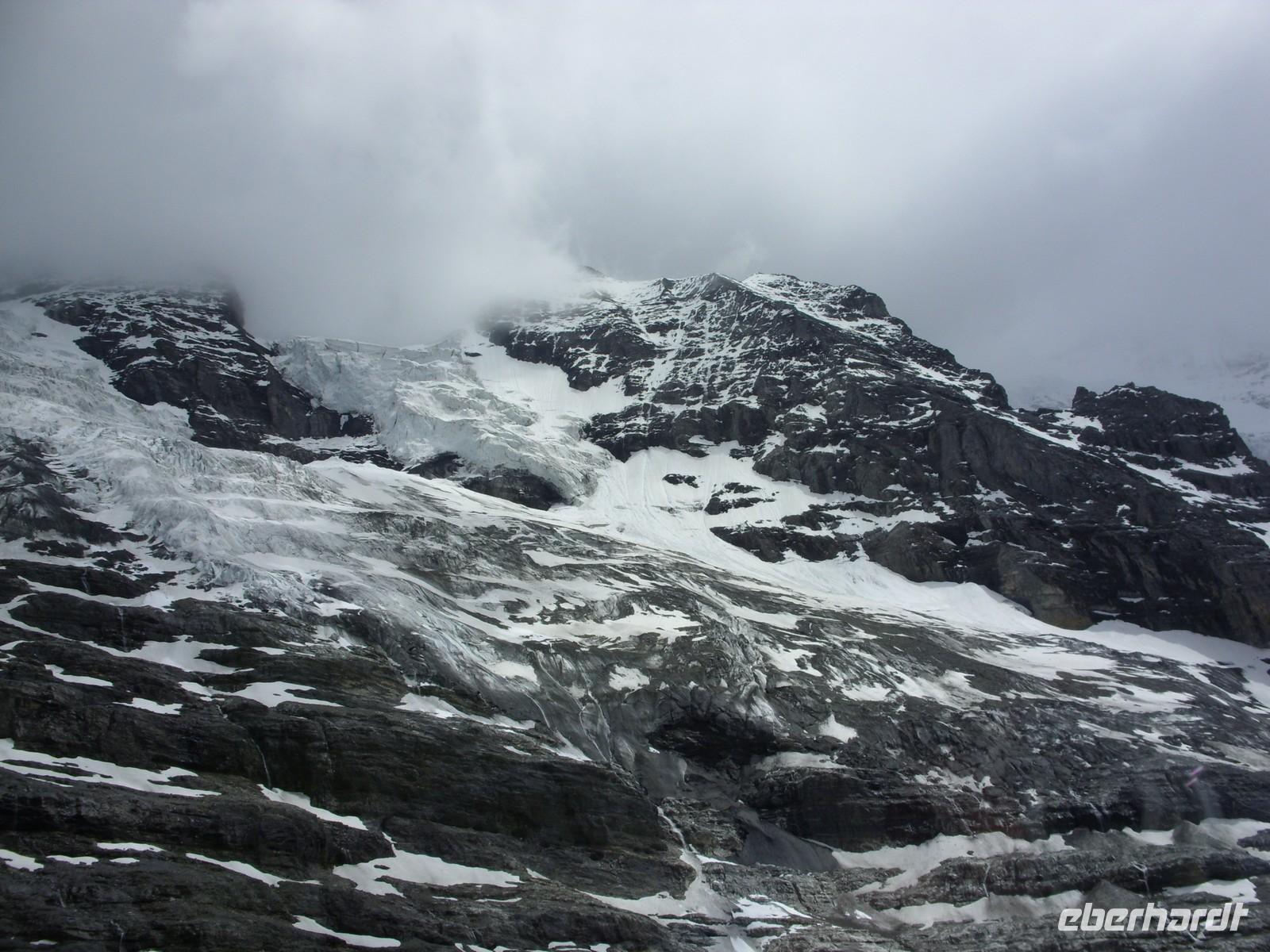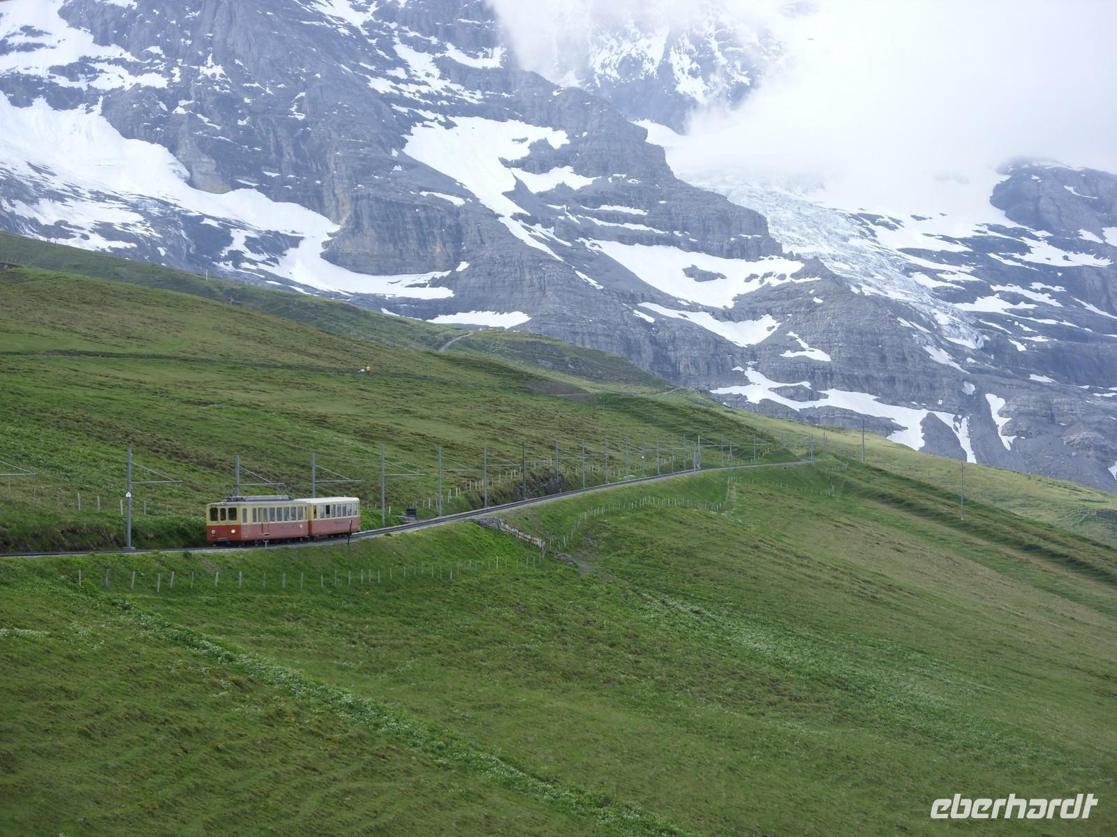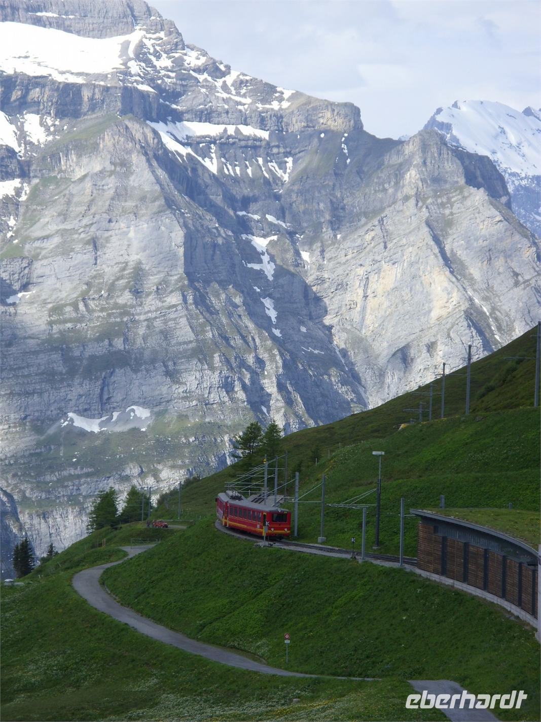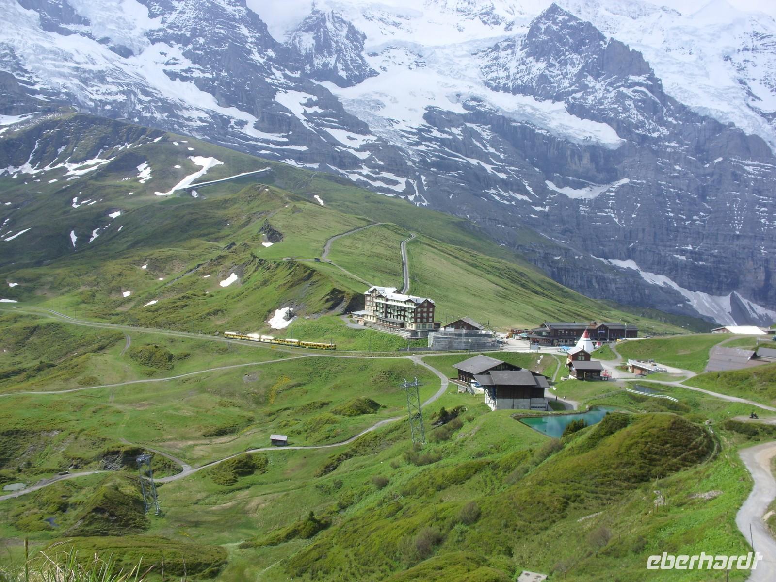 Heute hiess es Daumen drücken, dass die bereits in den Morgenstunden scheinende Sonne ihre Kraft behalten würde ? Wir wollten ja schließlich zum ?Dach Europas? auffahren ? das Jungfraujoch ist mit seinen 3471 Metern der tiefste Verbindungspunkt zwischen den eindrucksvollen Bergen Mönch und Jungfrau. Voller Spannung begaben wir uns also zum Bahnhof der Jungfraubahn und fuhren zunächst einmal in etwa 30 Minuten zur 2061 Meter hoch gelegenen Kleinen Scheidegg. Hier hatten wir eine Stunde Aufenthalt, um uns zu akklimatisieren und damit den weiteren Anstieg auf über 3500 Höhenmeter zu verkraften. Die Sicht war toll! Wir sahen die eindrucksvolle Eiger-Nordwand, konnten ins Tal von Grindelwald hinunter schauen, bekamen einen Eindruck vom rieseígesn Skigebiet des Männlichen und erhaschten immer wieder einen Blick auf Eiger, Mönch und Jungfrau.