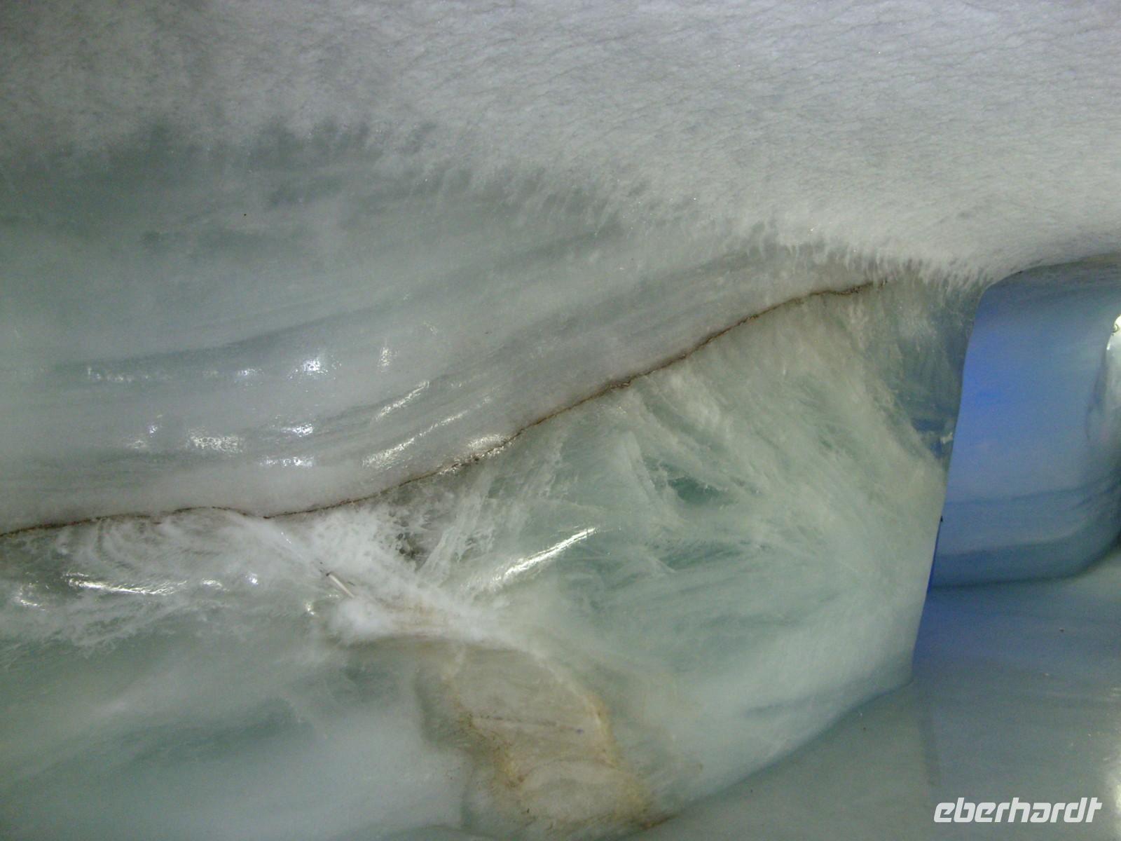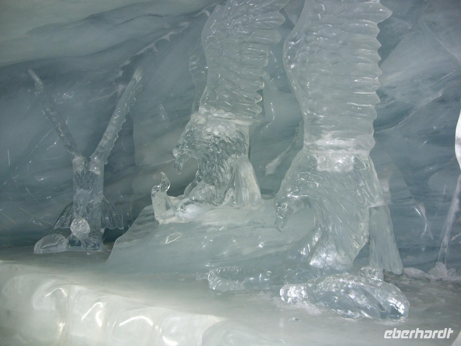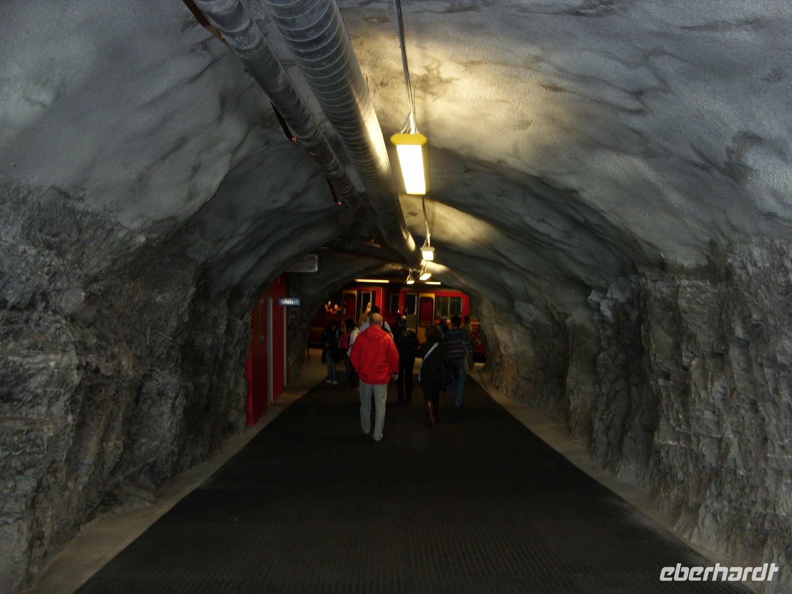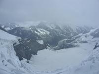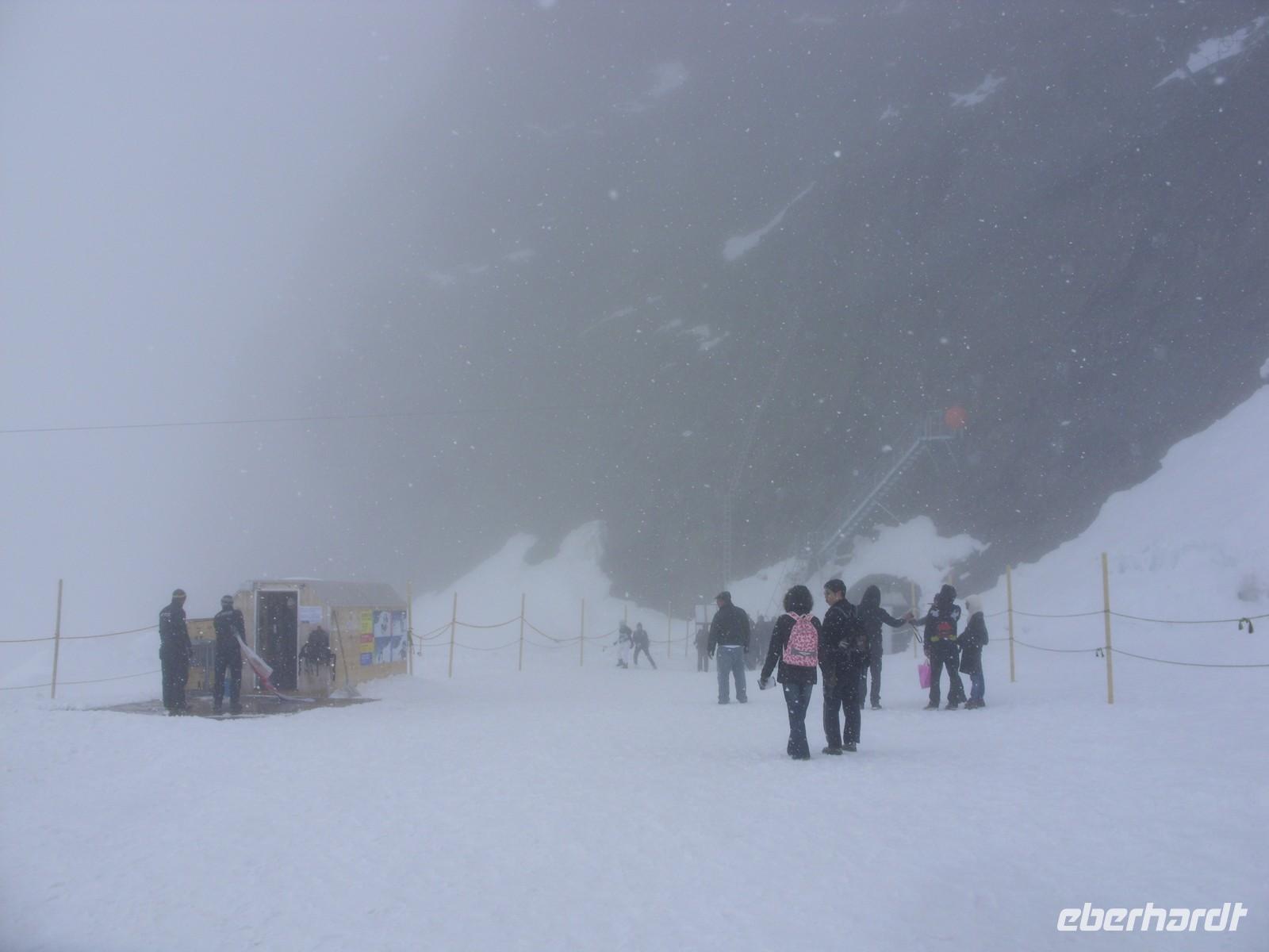 Pünktlich um 10.30 Uhr fuhren wir dann weiter zum Jungfraujoch. Unterwegs hielt die Bahn an der Tunnelstation Eigerwand (2864 m) und an der Tunnelstation Eismeer (3158 m). Jedes Mal nutzten wir die Möglichkeit und schauten entweder in die Felswand, ins Tal oder in Unmengen von Schnee rings um uns herum. Natürlich standen wir hinter Glas und waren beeindruckt vom eigentlichen Bau (7 von 9 Kilometern verlaufen im Tunnel!) der Bahnstrecke, die ja in den Jahren 1896 bis 1912 entstanden war. Endlich waren dann im höchstgelegenen Bahnhof Europas angekommen ? Wir befanden uns auf 3454 m Höhe und merkten auch alsbald die dünne Luft. Leider war nun hier oben keine Sicht. Tiefhängende Wolken aus denen es sogar leicht schneite hüllten uns ein. Nichtsdestotrotz gingen wir neben den tausend anderen Touristens vornehmlich aus Japan und Indien auf Entdeckungstour: Aussichtspunkt Aletschgletscher, Sphinx-Oberservatorium, Eispalast, Souvenirgeschäfte, Cafeteria, Multimediaraum mit Videoshow. Die Zeit verging wie im Flug bis wir um 14.30 Uhr wieder talabwärts fuhren. Dieses Mal stiegen wir auf der Kleinen Scheidegg gleich um und fuhren ins Nachbartal nach Lauterbrunnen. Hier wartete dann schon unserer Bus-Chauffeur Andreas auf uns, beglückte uns mit Wasser oder Kaffee.