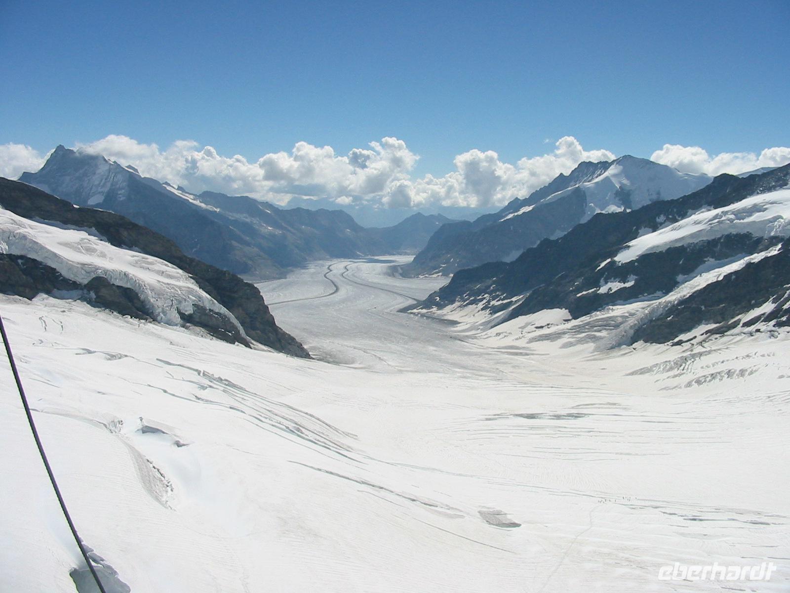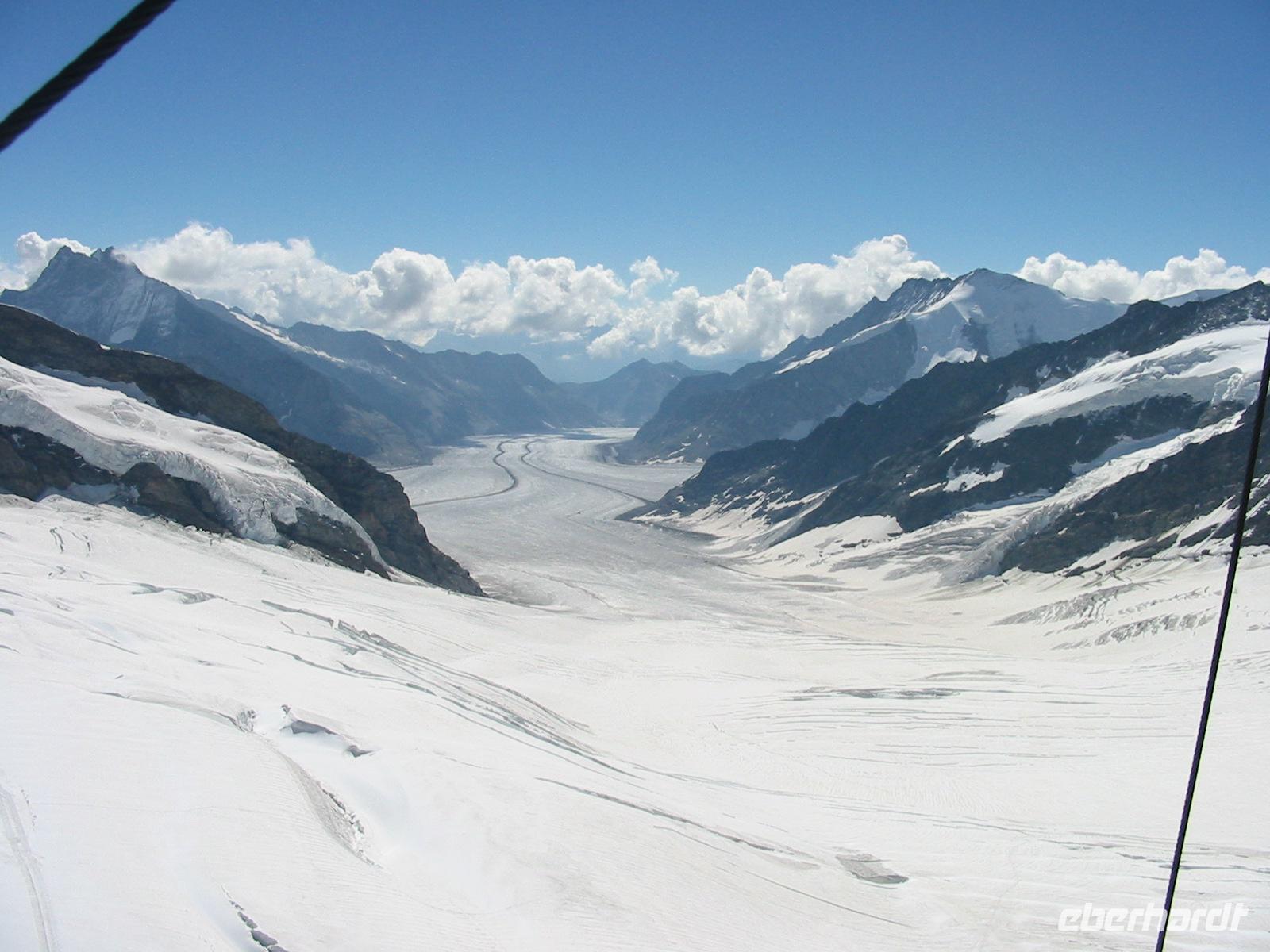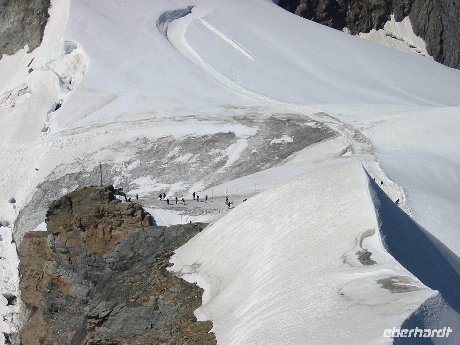 Im Eispalast befanden wir uns 20 Meter unter dem Aussichtsplateau, an der Wasserscheide Europas. Dort türmen sich die Eismassen, die langsam Richtung Norden wandern und deren Wasser einmal in die Nordsee fließen wird. Vor uns öffneten sich lange Gänge höhlenartig, weiten sich zu Räumen und Hallen. In Nischen tauchten die ersten Eisskulpturen auf, bläulich schimmert eine ewige Welt aus Eis.