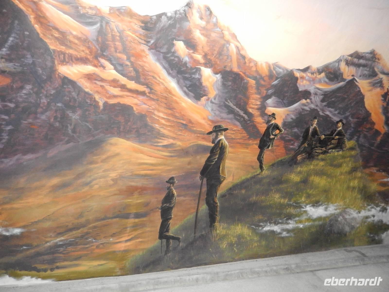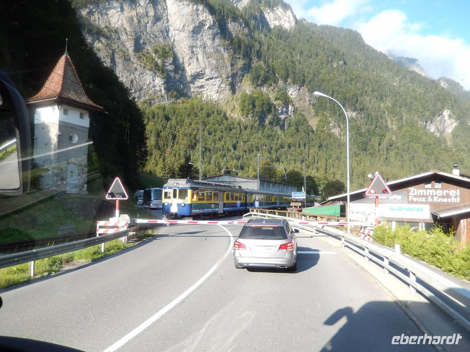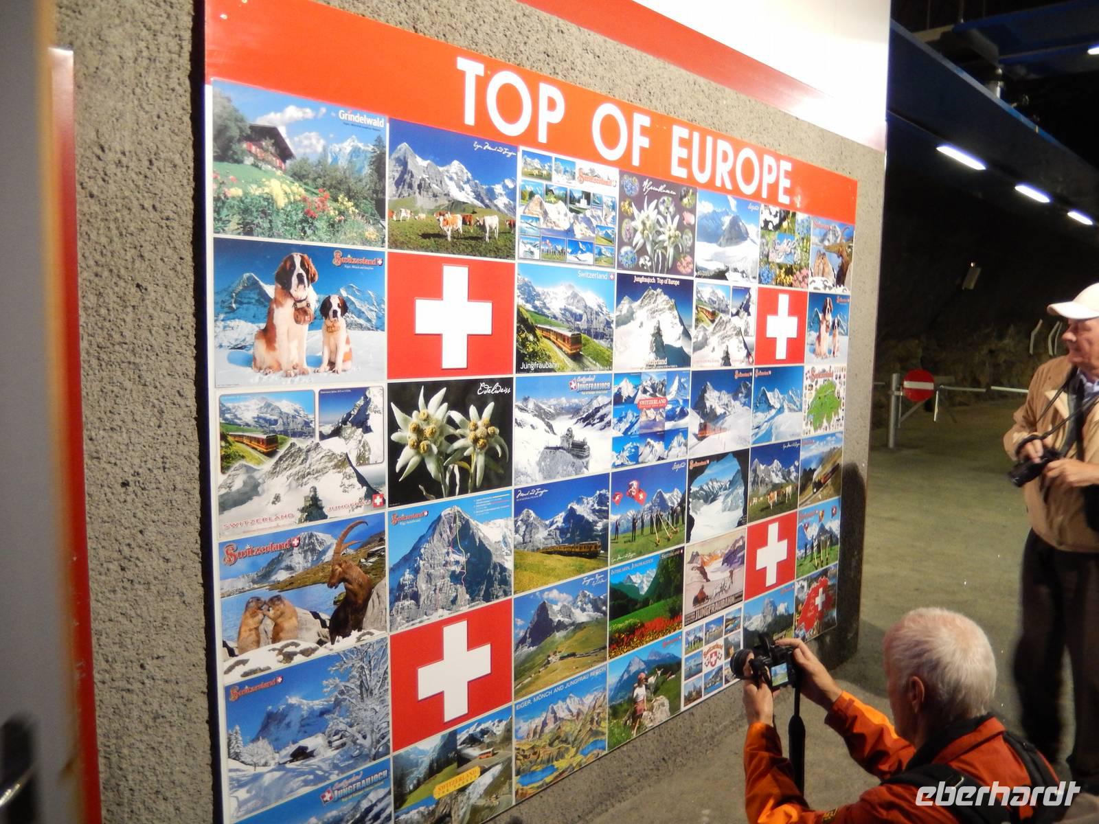 Dem Wetterbericht zu vertrauen, heißt, die Berge nicht zu kennen. Strahlender Sonnenschein kitzelte uns wach und nach dem Frühstück freuten wir uns auf einen herrlichen Bergtag, die Fahrt hinauf aufs Jungfraujoch. Nur fünf Minuten waren wir unterwegs zum Bahnhof und stiegen bald in den für uns reservierten Waggon der Jungfraubahnen, der uns über die Zahnschiene sicher zur Kleinen Scheidegg hinauf bringen sollte. Auch hier erwartete uns beste Sicht. Na, da musste doch unser Gruppenfoto entstehen... Wir... und hinter uns Eiger, Mönch und Jungfrau. Herrlich! Eine kleine Aussicht in der Nähe bot den herrlichen Blick zum Jungfraumassiv mit Eiger, Mönch und Jungfrau und machte Lust auf mehr. Als wir dann in der Jungfraubahn saßen und an den Stationen Eigerwand und Eismeer zum Fotostopp ausstiegen, um Bergwelt und Gletscher zu bestaunen, bemerkten wir schon, wie die Luft langsam dünner wurde. Schließlich hielt der Zug das letzte Mal nach 7.122 Metern durch den Felsen und wir kamen auf über 3.000 Metern Höhe an. Doch oh Schreck... draußen zogen sich die Wolken zusammen, sahen wir nur eine graue Suppe. Na, wenn man schon einmal hier oben ist, besucht man eben die Eisgrotte, dann den Fabrikverkauf von Lindt, schaut sich die alten Werkzeuge und Maschinen an, mit denen einst solch eine gewaltige Ingenieurleistung, wie diese Bahn herauf geschaffen werden konnte, und ruht sich in einem der vielen Restaurants bei gutem Essen und Getränk aus. Das Warten brachte leider nichts. Die Wolken verzogen sich nur einmal ganz kurz, gaben nur für Sekunden den Blick auf Skifahrer, umliegende Gipfel und Tal frei. Pech. So kann es eben sein in den Bergen. Dafür genossen wir später die Fahrt hinab, die uns auf der Kleinen Scheidegg wieder gute Sicht und Sonne präsentierte und schließlich in Lauterbrunnen endete. Dieter, unser Busfahrer, hatte den Bus inzwischen dahin gefahren und so sahen wir nun noch das Tal von Lauterbrunnen bis an die Felsgrenze heran, bestaunten die Wasserfälle, wunderten uns über die Waghalsigkeit einiger Fallschirmspringer und fuhren trotz des Nebels ganz oben glücklich und zufrieden zurück nach Grindelwald zum Abendessen. Später trafen wir uns fast alle im Ort beim Spaziergang oder beim Bewundern der alten Autos wieder, die am Nachmittag ebenfalls hier ankamen.