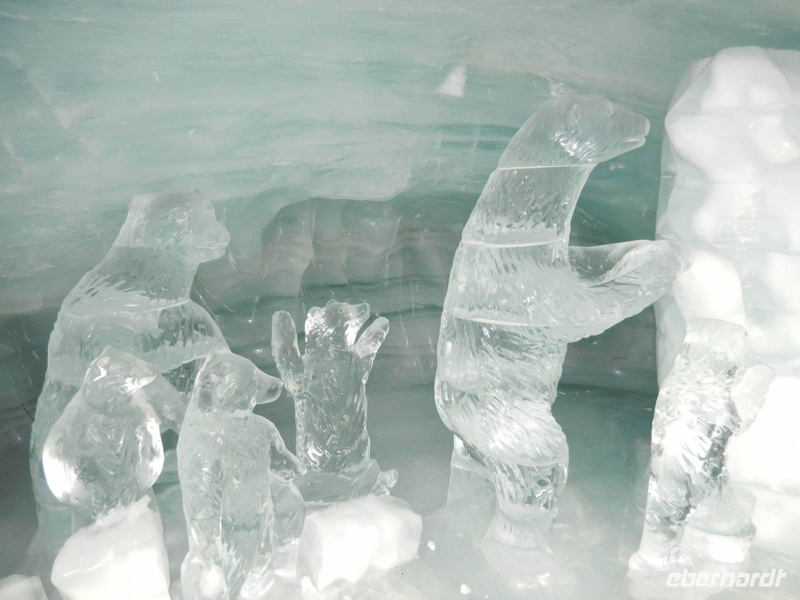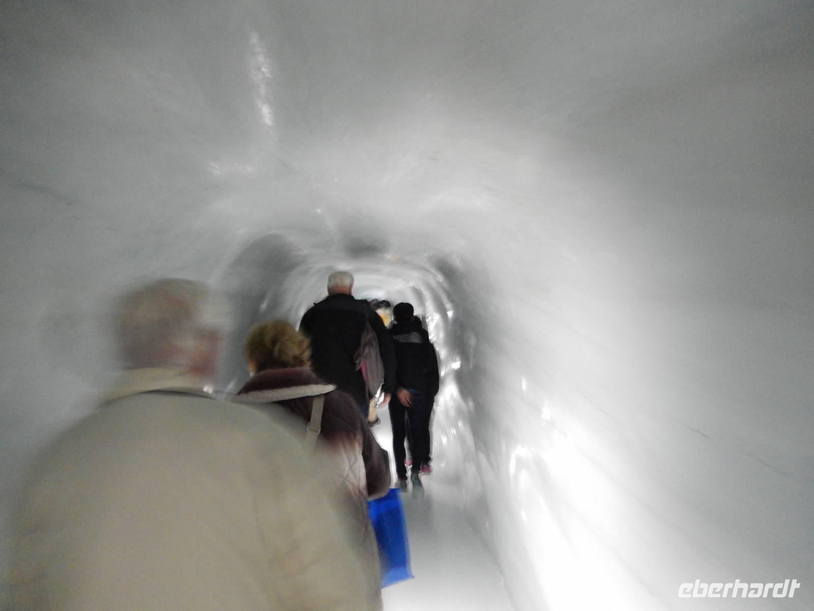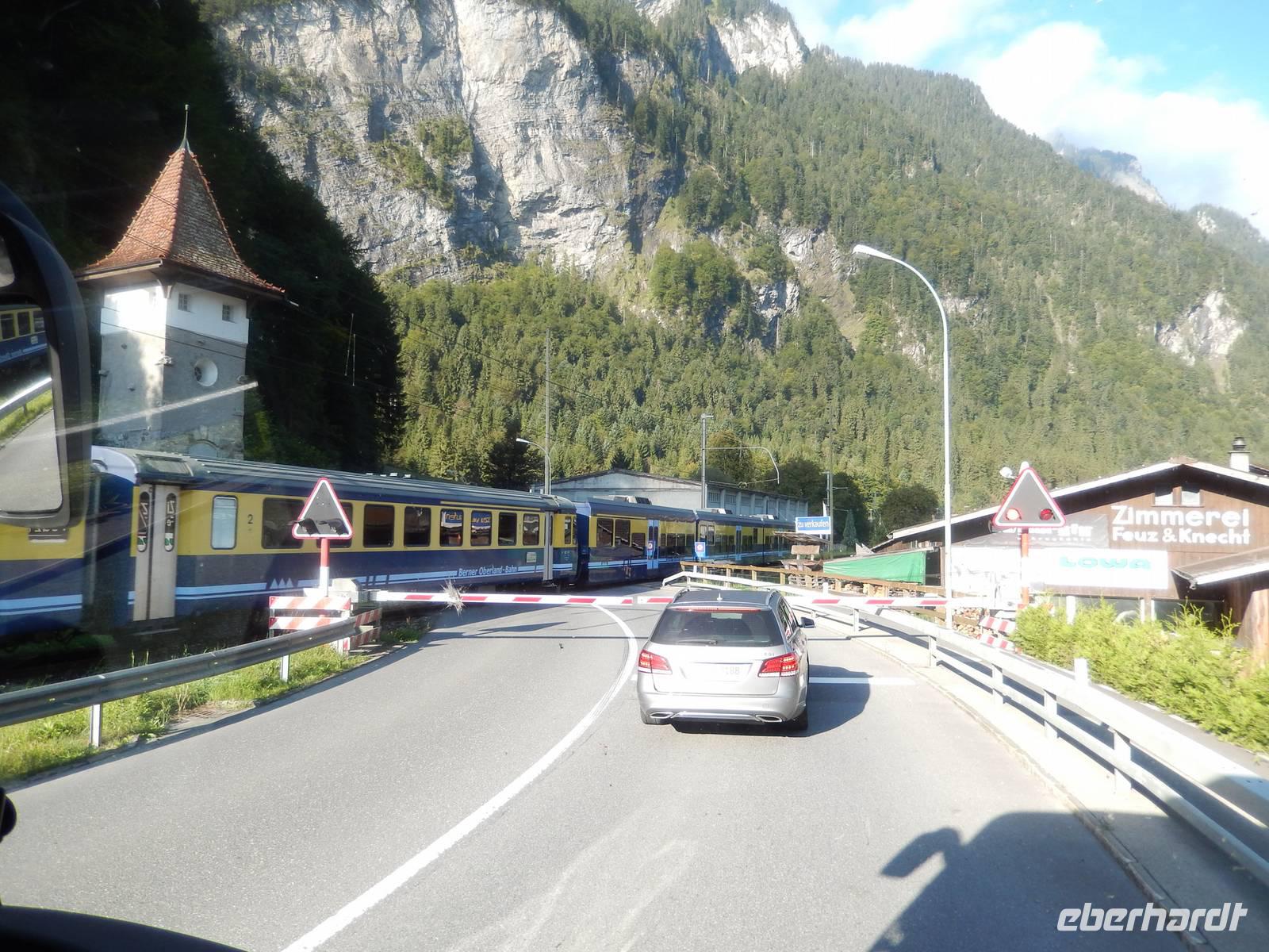Dem Wetterbericht zu vertrauen, heißt, die Berge nicht zu kennen. Strahlender Sonnenschein kitzelte uns wach und nach dem Frühstück freuten wir uns auf einen herrlichen Bergtag, die Fahrt hinauf aufs Jungfraujoch. Nur fünf Minuten waren wir unterwegs zum Bahnhof und stiegen bald in den für uns reservierten Waggon der Jungfraubahnen, der uns über die Zahnschiene sicher zur Kleinen Scheidegg hinauf bringen sollte. Auch hier erwartete uns beste Sicht. Na, da musste doch unser Gruppenfoto entstehen... Wir... und hinter uns Eiger, Mönch und Jungfrau. Herrlich! Eine kleine Aussicht in der Nähe bot den herrlichen Blick zum Jungfraumassiv mit Eiger, Mönch und Jungfrau und machte Lust auf mehr. Als wir dann in der Jungfraubahn saßen und an den Stationen Eigerwand und Eismeer zum Fotostopp ausstiegen, um Bergwelt und Gletscher zu bestaunen, bemerkten wir schon, wie die Luft langsam dünner wurde. Schließlich hielt der Zug das letzte Mal nach 7.122 Metern durch den Felsen und wir kamen auf über 3.000 Metern Höhe an. Doch oh Schreck... draußen zogen sich die Wolken zusammen, sahen wir nur eine graue Suppe. Na, wenn man schon einmal hier oben ist, besucht man eben die Eisgrotte, dann den Fabrikverkauf von Lindt, schaut sich die alten Werkzeuge und Maschinen an, mit denen einst solch eine gewaltige Ingenieurleistung, wie diese Bahn herauf geschaffen werden konnte, und ruht sich in einem der vielen Restaurants bei gutem Essen und Getränk aus. Das Warten brachte leider nichts. Die Wolken verzogen sich nur einmal ganz kurz, gaben nur für Sekunden den Blick auf Skifahrer, umliegende Gipfel und Tal frei. Pech. So kann es eben sein in den Bergen. Dafür genossen wir später die Fahrt hinab, die uns auf der Kleinen Scheidegg wieder gute Sicht und Sonne präsentierte und schließlich in Lauterbrunnen endete. Dieter, unser Busfahrer, hatte den Bus inzwischen dahin gefahren und so sahen wir nun noch das Tal von Lauterbrunnen bis an die Felsgrenze heran, bestaunten die Wasserfälle, wunderten uns über die Waghalsigkeit einiger Fallschirmspringer und fuhren trotz des Nebels ganz oben glücklich und zufrieden zurück nach Grindelwald zum Abendessen. Später trafen wir uns fast alle im Ort beim Spaziergang oder beim Bewundern der alten Autos wieder, die am Nachmittag ebenfalls hier ankamen.
