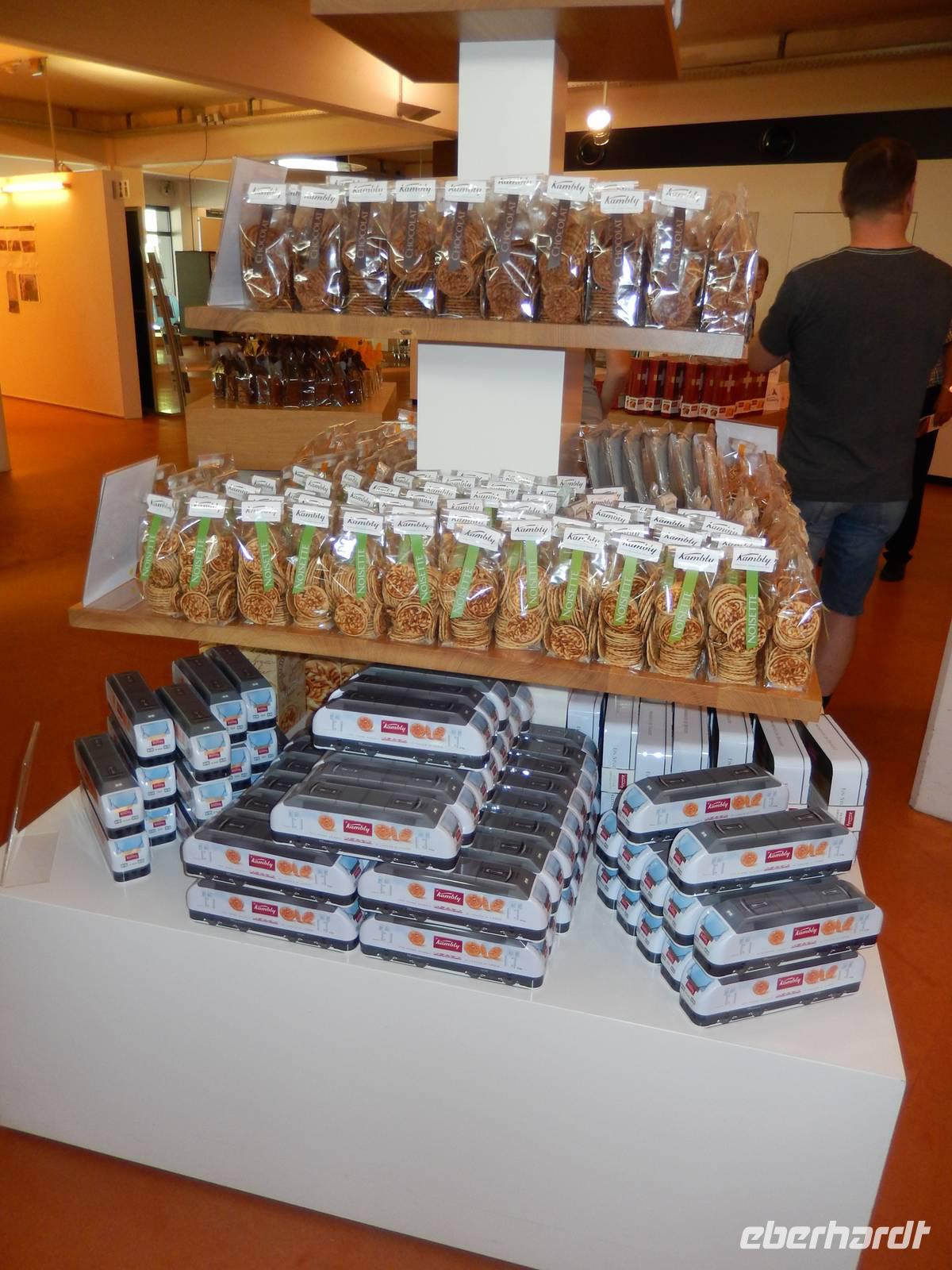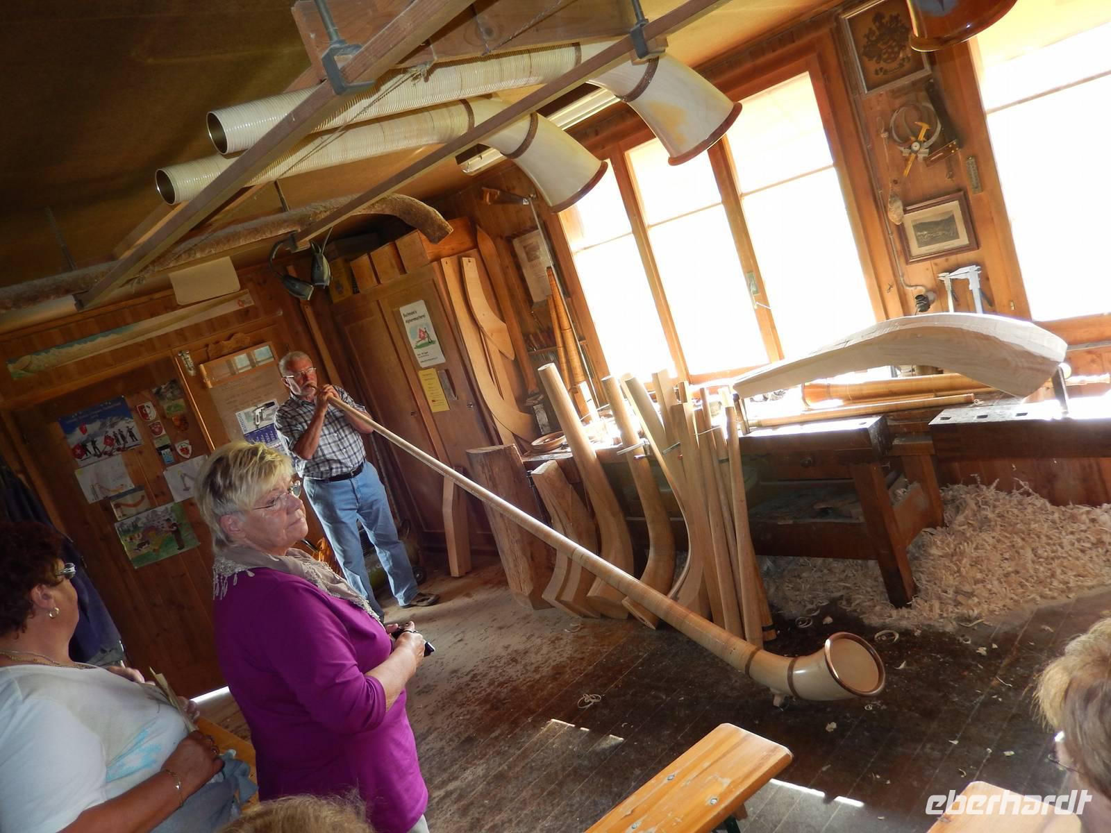 Stefan machte gleich am Morgen einen Scherz. Käse mit Keksen vermengt im Mund und ein Alphorn blasen... Nun, das wollten wir alle nicht ausprobieren. Eher jedoch sehen, wie Schweizer Käse im Emmental entsteht, wo die Kambly-Kekse herkommen und woraus, vor allem aber wie ein Alphorn entsteht. Ein spannendes Programm, zu dem wir etwas eher als sonst am Morgen aufbrachen. In Affoltern im Emmental empfingen uns bald unsere beiden Käsereiführer, die uns von der alten Käserei bis hin zur heutigen Herstellung des berühmten Emmentalers alles zeigten und auch noch eine leckere Kostprobe verschieden lang gereifter Käse des Hauses kredenzte. Toll! Na, da musste doch manches Stück Käse für zuhause eingepackt werden! Käse schließt angeblich den Magen. Davon jedoch konnten wir nichts spüren, als wir bei Kambly in Trubschachen eintrafen. Wie viele unterschiedliche Sorten an Gebäck heute dort, wo einst die Bretzeli entstanden, erfunden und hergestellt werden, kann wohl keiner von uns ganz genau sagen. Jede Sorte durften wir in Mengen verkosten, jeder fand sicher das Gebäck, welches ihm am Besten mundete und eigentlich wollten wir schon die bereits bestellten Würstchen im Bus abbestellen. Doch etwas Herzhaftes war nach dieser süßen Schlacht sicher nicht schlecht. Erst einmal ein paar Kekse einpacken und weiterfahren. Dann hielten wir nach der ausgiebigen Besichtigung und Verkostung wenig später mitten im Wald an einem herrlich gelegenen Parkplatz mit Grillplatz und Toilette, schauten beim essen den Heuwendern gegenüber zu und freuten uns auf die Alphornmacherei in Eggiwil. Eine sehr schmale Straße brachte uns in den Ort und ein mit Herz und Seele der Alphornmacherei verbundener Meister seines Fachs zeigte uns, wie ein Alphorn entsteht. Zum Schluss durften wir es sogar einmal mit dem Blasen versuchen, wenn wir uns trauten. Na ja, dazu gehört freilich Übung. Da man jedoch auf ein Alphorn der Familie Bachmann inzwischen über zwei Jahre warten muss, nahmen wir erst einmal keines mit nach Hause. Heute, so waren wir uns einig, sahen wir Vieles aus der Tradition der Schweiz. Und als Dieter und Stefan dann noch beschlossen, die schmale Straße auf der anderen Seite des Thuner Sees zurück zu fahren, ging später mit dem Abendessen unser letzter herrlicher Tag in der Schweiz zu Ende. Natürlich erst nach einem letzten Bummel durch das abendliche Grindelwald.
