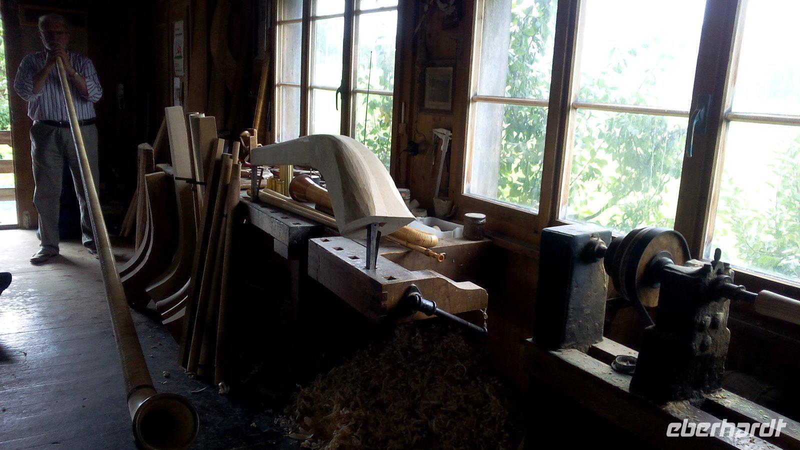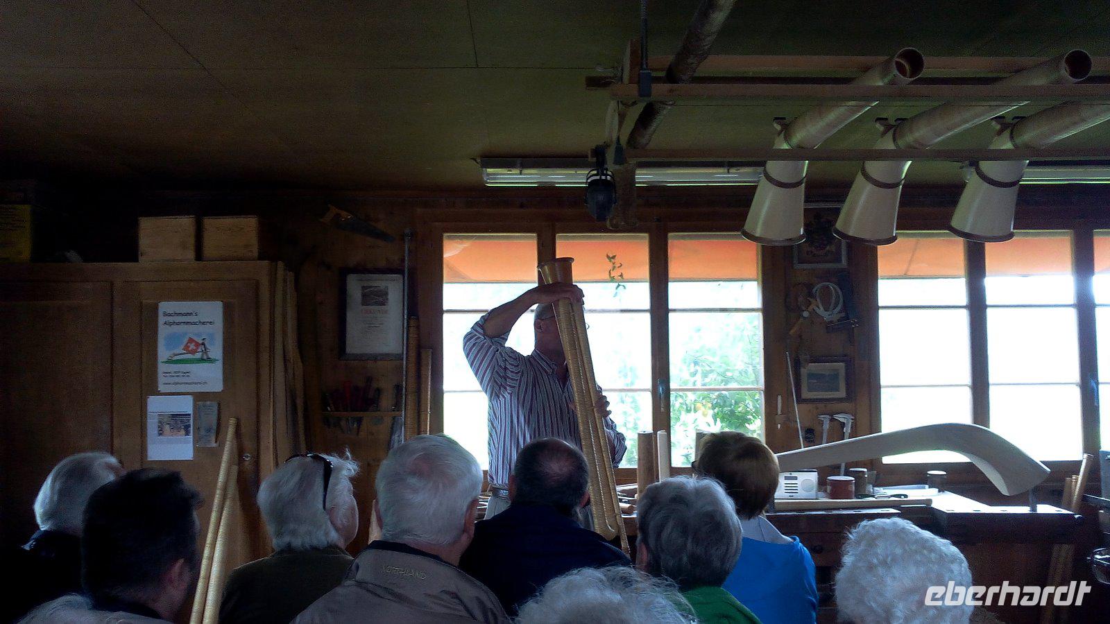 Unsere Erkundungsfahrt beginnen wir schon 08.30 Uhr unsere Fahrt führt uns entlang der Autobahn bis Kiesen, danach durchs Emmental nach Eggiswil (Knubel). Unsere Anfahrt ist nicht ganz einfach, aber Dieter schafft das schon. Wir werden in der Alpmacherei Bachmann schon erwartet. Es ist interessant, wie viele Holzarten notwendig sind, um dieses Instrument herzustellen. Die Stunde geht schnell vorbei. Weiter führt uns unsere Fahrt nach Trubschachen. Eine Mitarbeiterin der Firma Kambly erwartet uns schon und wir haben die Möglichkeit Brezel zu backen." Seit drei Generationen steht Kambly