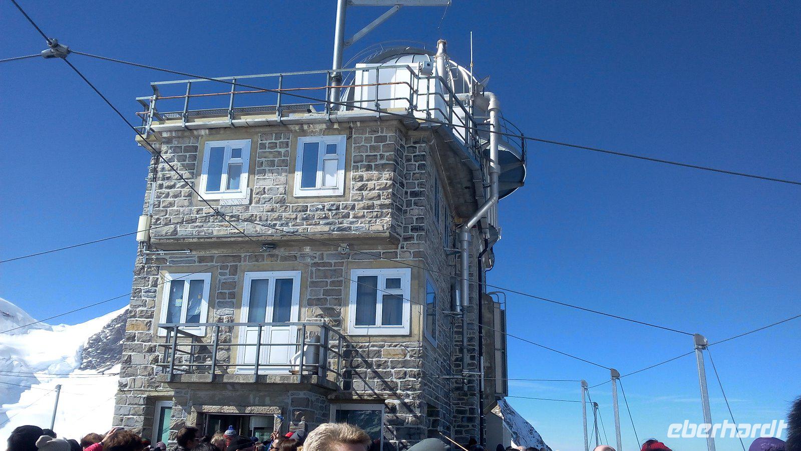 Laut Wetterbericht soll heute der schönste Tag der Woche werden. Wir haben kurzfristig das Programm geändert und nutzen die gute Sicht, um zum Jungfraujoch zu fahren. Wir treffen uns gegen 08.30 vor dem Hotel und haben eine schöne Sicht auf den Eiger. Wir sind in 5 min am Bahnhof. Die Zahnradbahn, zur Kleinen Scheidegg steht für uns bereit. Alles ist gut organisiert und die Waggons für uns reserviert. Vorbei geht es an der grandiosen Eiger-Nordwand zur Kleinen Scheidegg. Die Bergwelt von Eiger, Mönch und Jungfrau liegt bei schönstem Wetter vor uns. Nach kurzem Aufenthalt geht es weiter zum Jungfraujoch. Mit 2 Fotostopps im Berg kommen wir dann auf den höchsten Bahnhof Europas (3454) an. An die Höhe muss man sich erst gewöhnen und jeder schlägt sein Tempo an. Gegen 14.15 Uhr treffen wir uns zur Abfahrt. Bis dahin haben wir aber den Eispalast, den Aletschgletscher und natürlich die Sphinx gesehen. Unseren Rückweg von der Kleinen Scheidegg führt über Lauterbrunnen nach Grindelwald.
