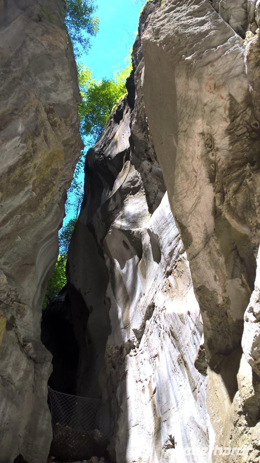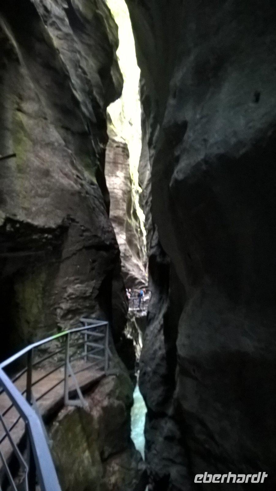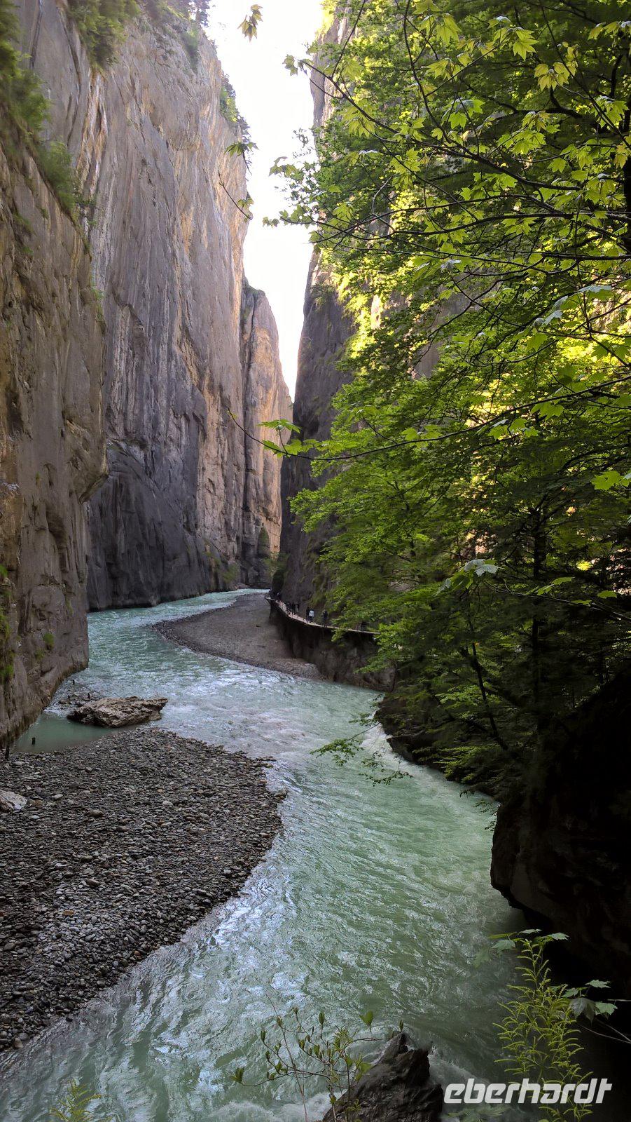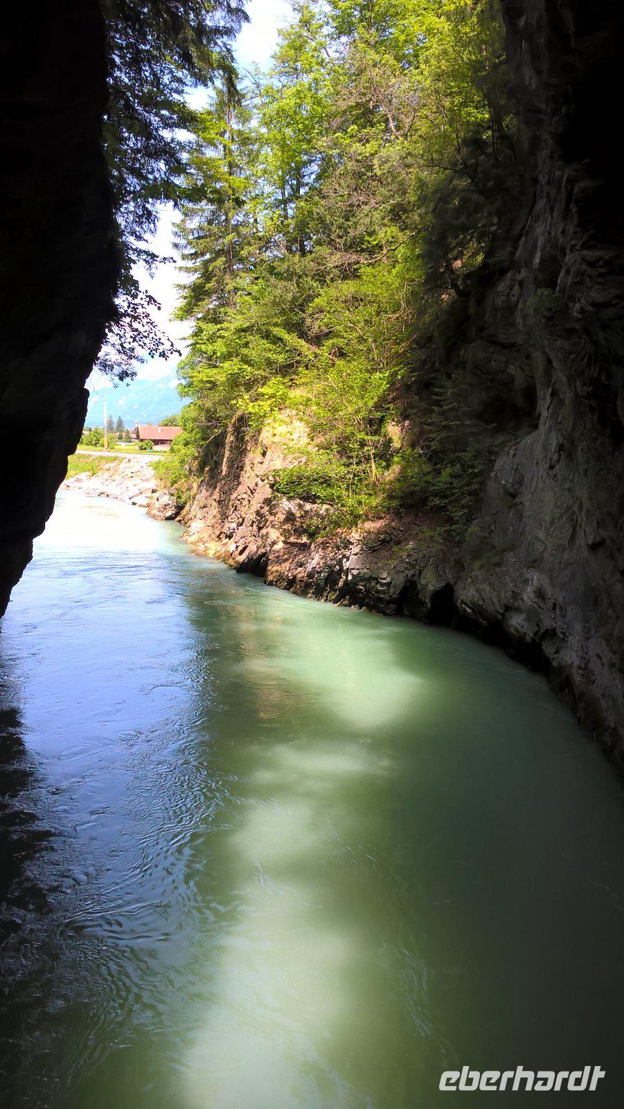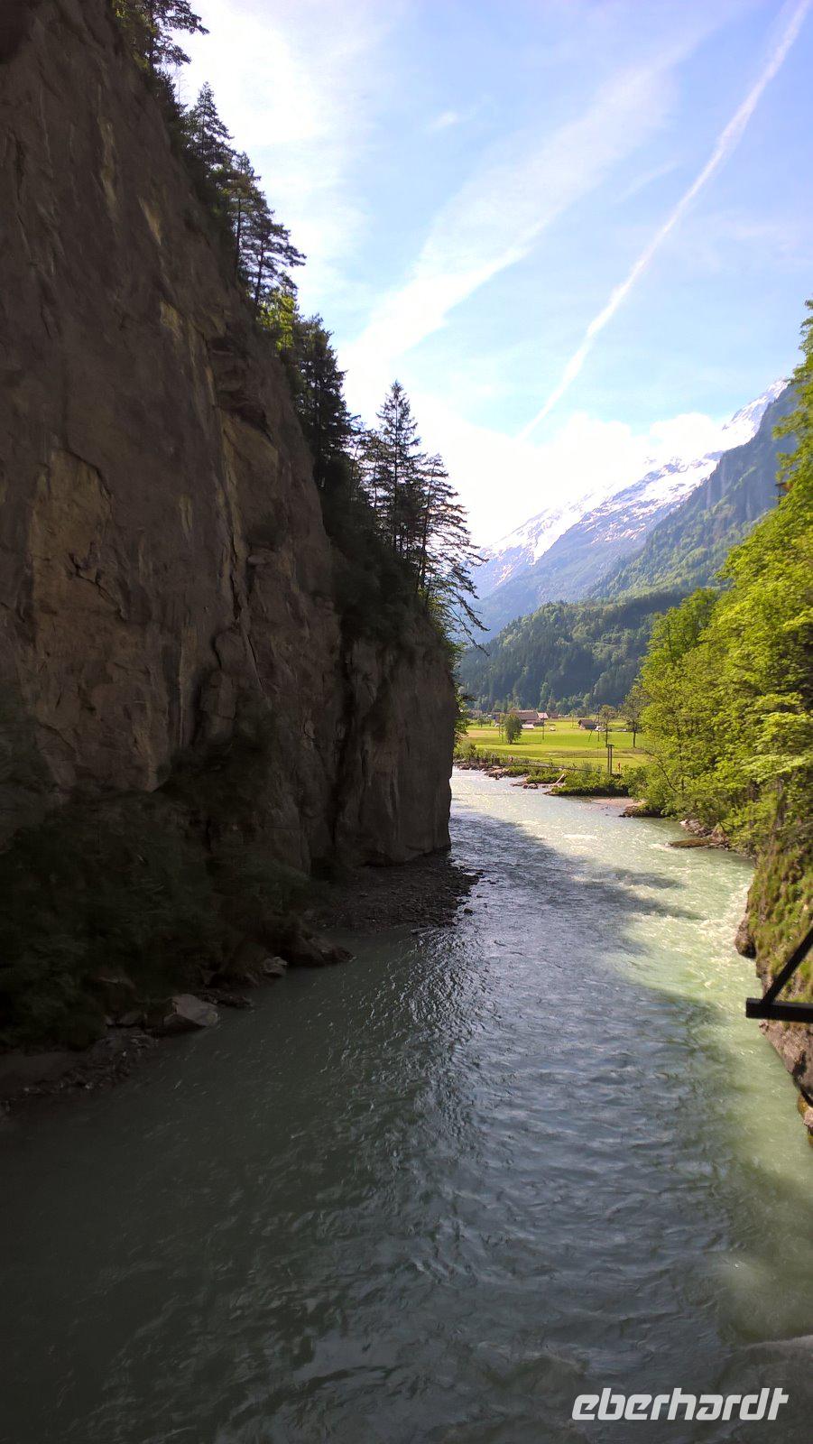 Aber heute geht es zur nächst in die Aareschlucht. Die Aare, deren Gesamtlänge 288 km beträgt, das Gefälle 1.565 m, hat ein Einzugsgebiet von 17.709 km². Sie ist der wasserreichste Nebenfluss des Rheins, noch vor der Maas, und sie führt mehr Wasser als Mosel und Main zusammen.
