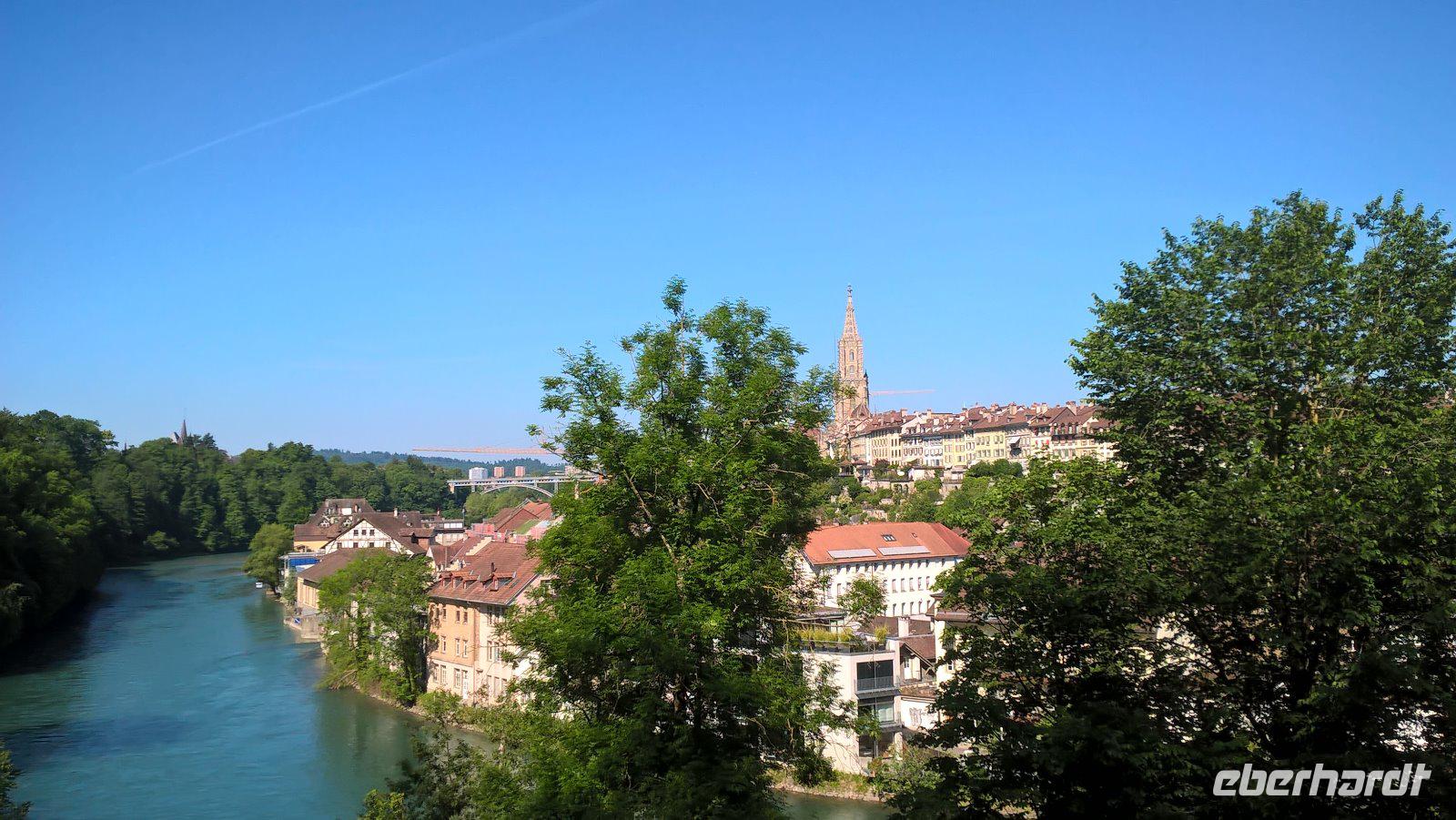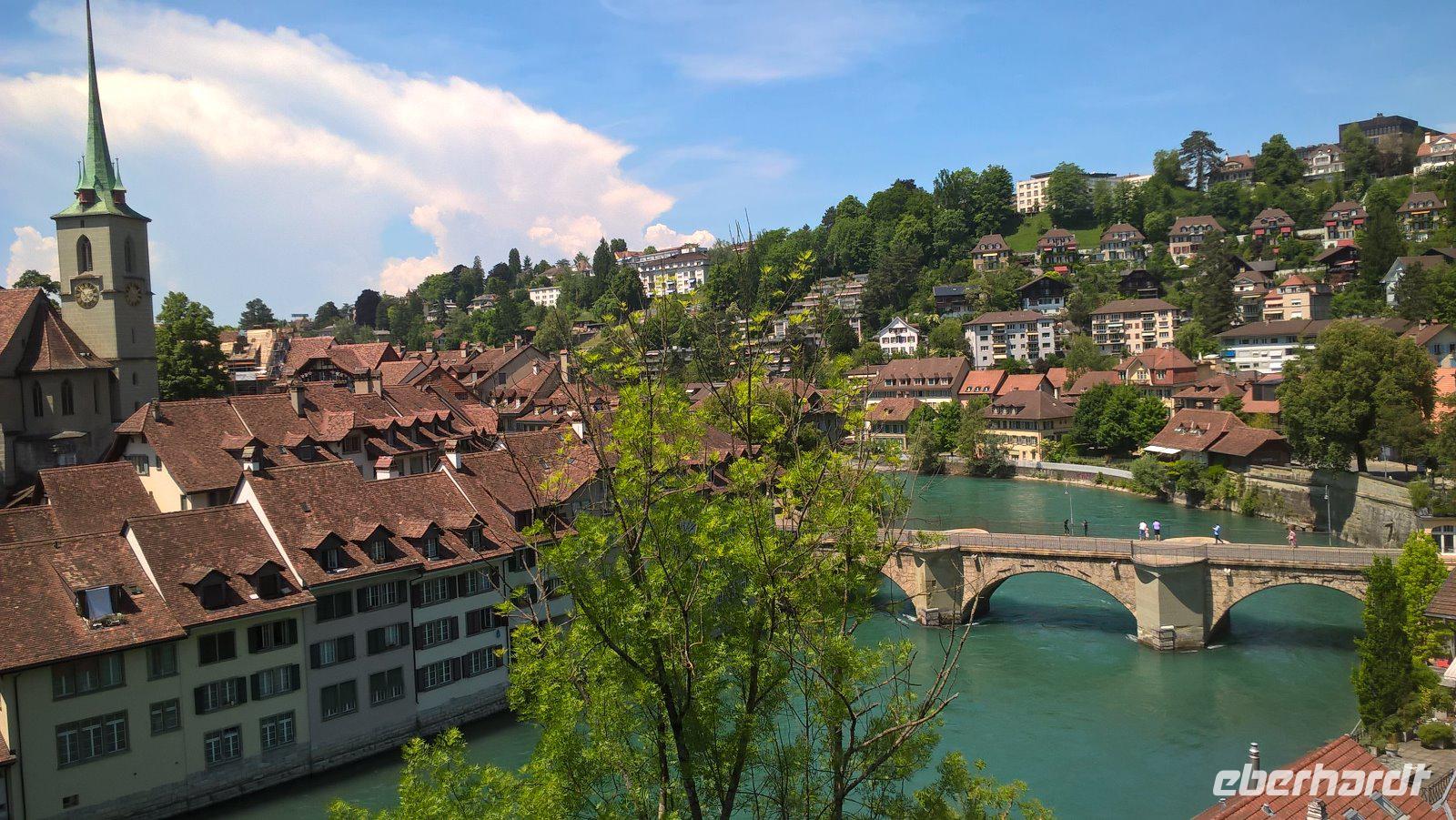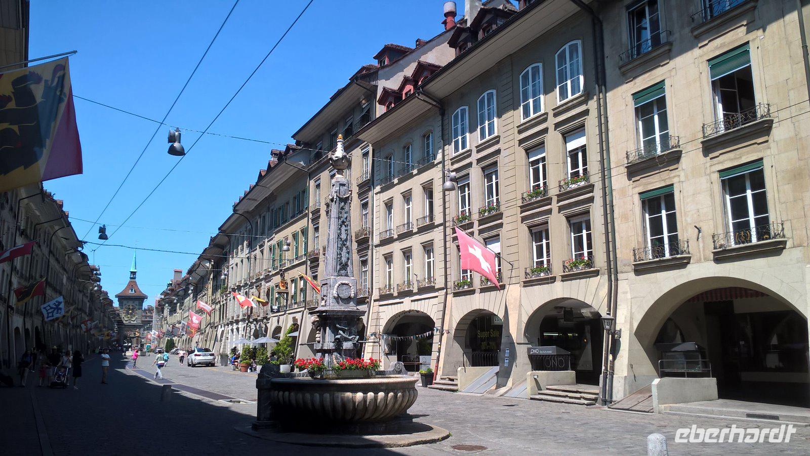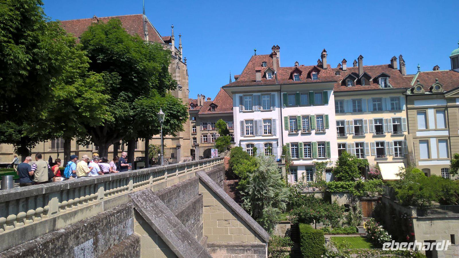 Bern gehört mit 141'920 Einwohnern (Februar 2017) - neben Zürich, Genf, Basel und Lausanne - zu den grössten Gemeinden der Schweiz; rund 390'000 Personen wohnen in der Agglomeration Bern. Die Stadt Bern ist das Zentrum der Wirtschaftsregion Bern-Mittelland. Wir erfahren: Bei der Gründung des schweizerischen Bundesstaates entstand eine Kontroverse darüber, ob die Schweiz eine Hauptstadt haben solle und welche. Sie endete in einem Kompromiss: Am 28. November 1848 wählten der National- und Ständerat die Stadt Bern als Bundessitz der Schweiz, sie wird jedoch nicht Haupt-, sondern Bundesstadt genannt und ist nur de facto, aber nicht de jure Hauptstadt der Schweiz. Nach einer etwa 2,5 stündigen Stadtbesichtigung mit einer örtlichen Reiseführerin haben wir noch etwas Zeit, Bern auf eigene Faust kennen zu lernen. Einige wollen hiesige Spezialitäten probieren und suchen eines der urigen Lokale von Bern auf. Andere wiederum wollen einmal eine Abkühlung an diesem heißen Tag und lassen sich in die Aare fallen, an deren Ufer sich ein Freibad befindet.