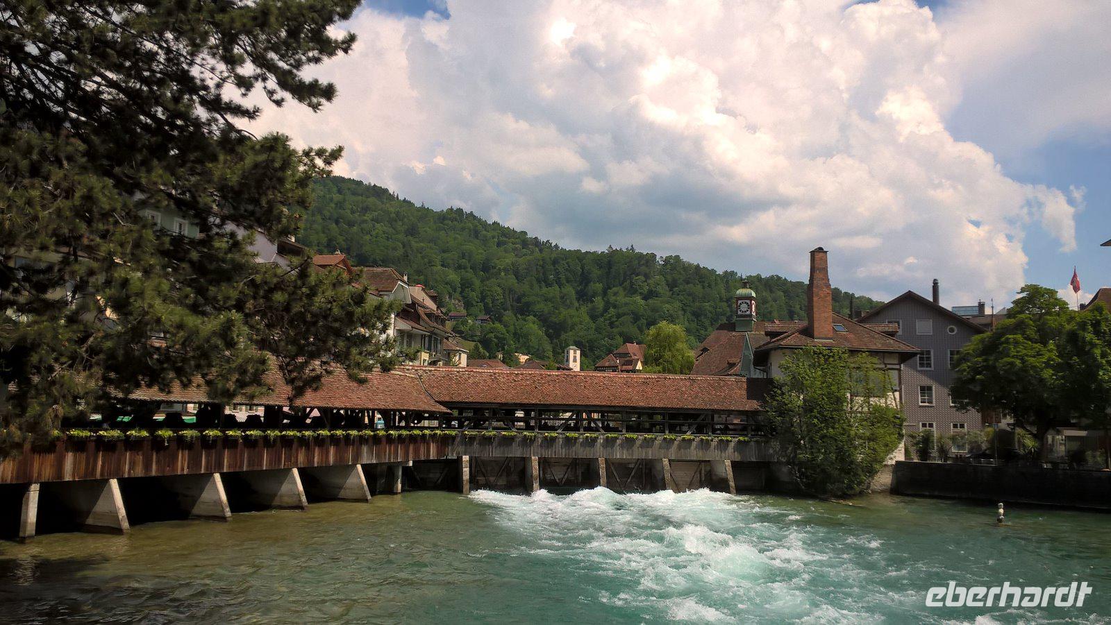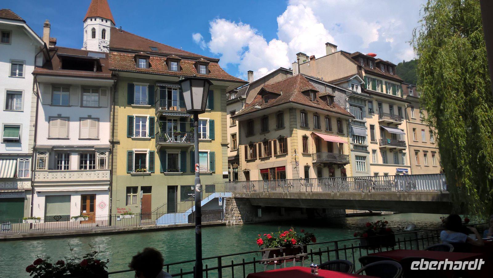 Nur ein kurzer Bustransfer ist es dann von Brienz nach Interlaken wo uns unser Fahrer Roman an der sogenannten Höhematte aussteigen lässt. Schon viel mehr Betriebsamkeit herrscht hier. Interlaken liegt im Berner Oberland zwischen Thunersee und Brienzersee, auf einer Schwemmebene. Die beiden Seen werden durch die Aare verbunden, welche durch Interlaken fliesst.