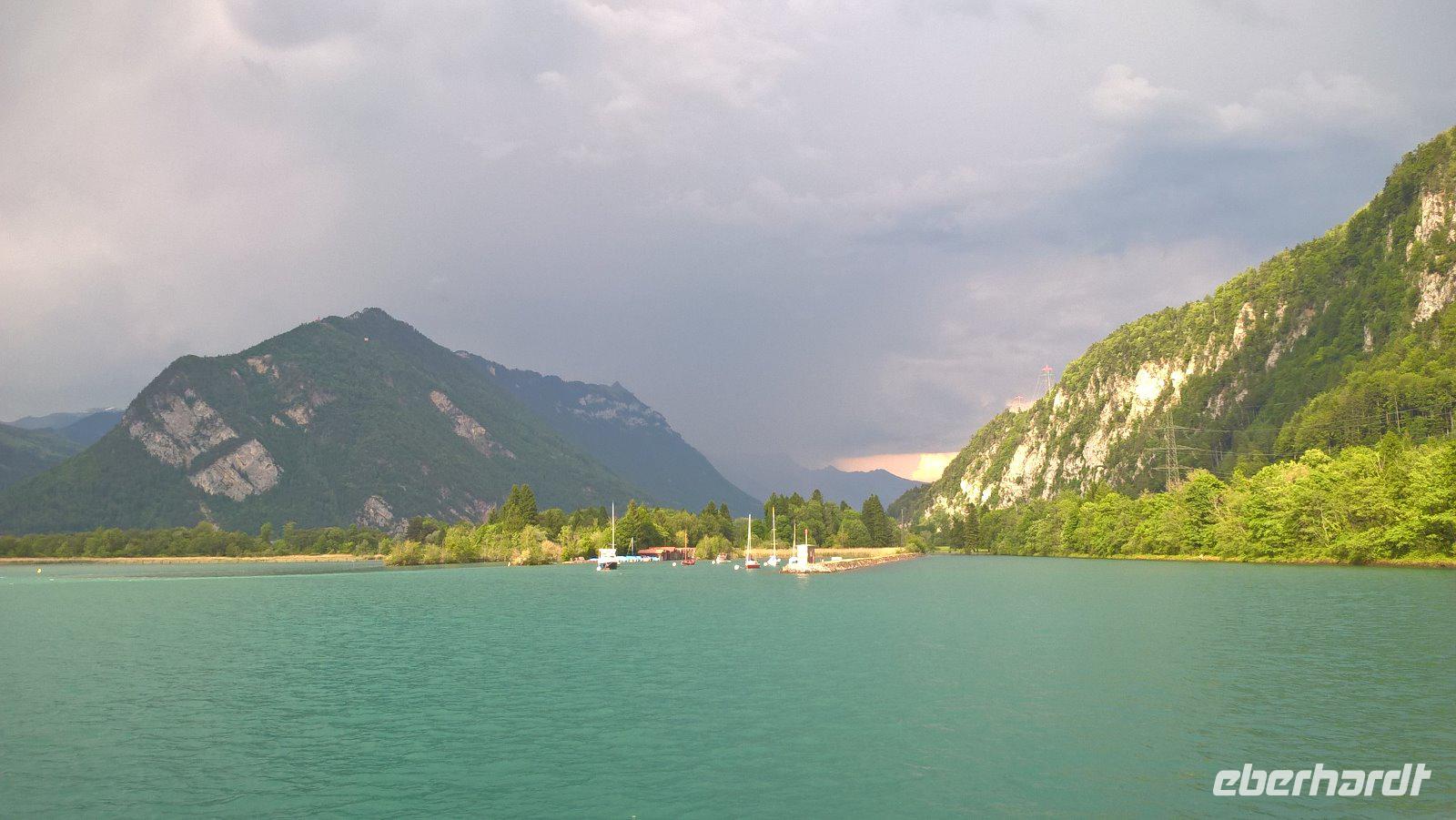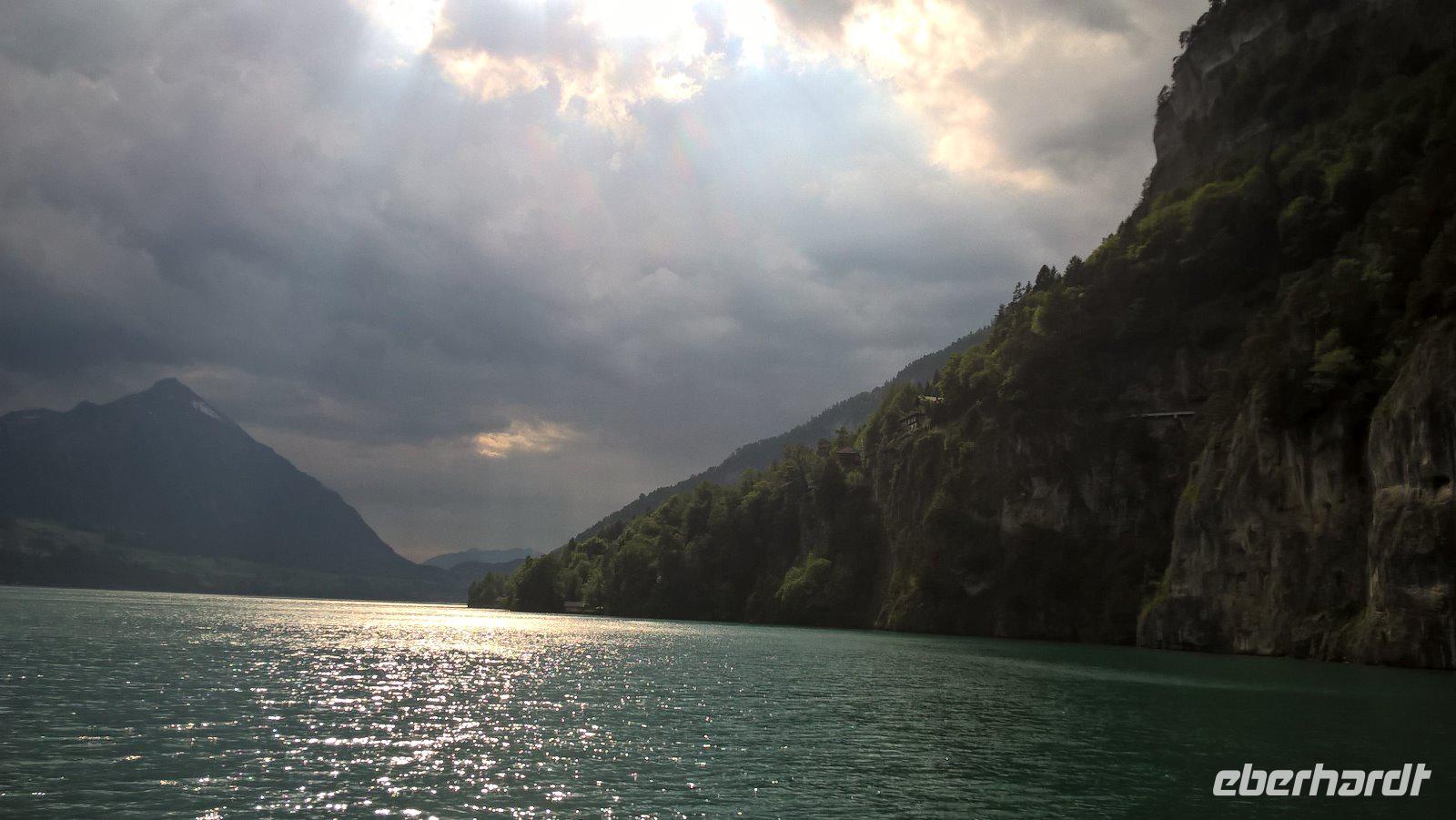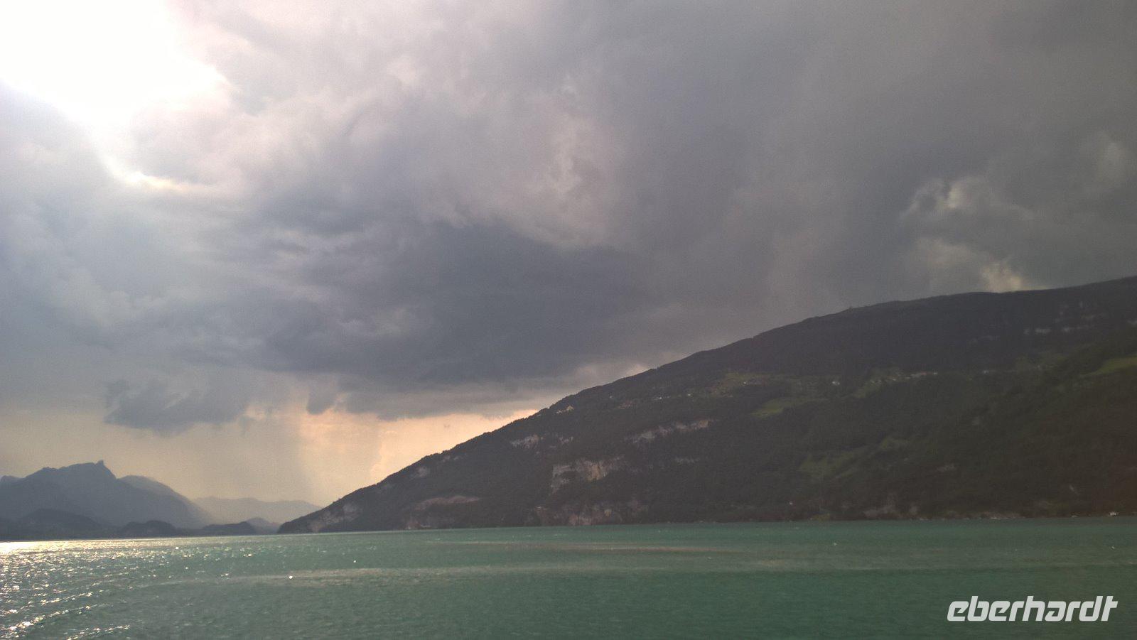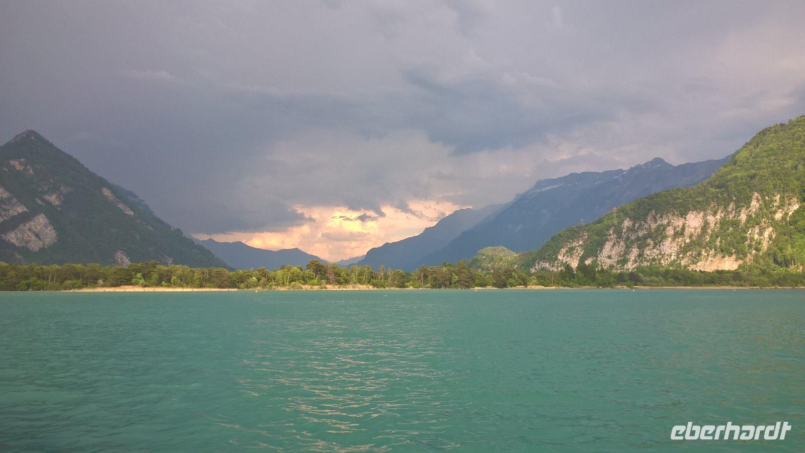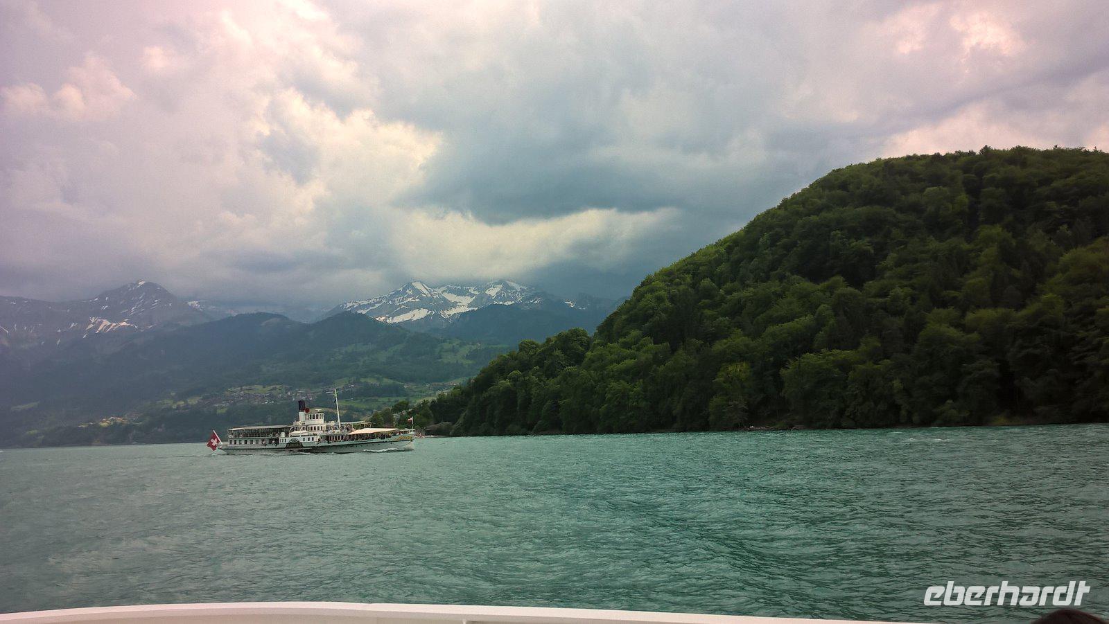 Dann fahren wir gemeinsam weiter nach Thun, wo wir die Schiffspassage nach Interlaken über den Thunersee gebucht haben. Vorbei an romantischen Badeplätzen und prächtigen Seevillen im Hintergrund immer die majestätischen Berge genießen wir zunächst Kaffee und Kuchen an Bord unseres des Schiffes. Das Aufziehen einiger Gewitterwolken am Himmel beschert uns eine besonders schöne Kulisse für unsere Fotos. Dennoch endet auch dieser Tag, ohne dass wir nass werden. Erst bei Ankunft im Hotel beginnt es am Abend zu regnen. Wir genießen also unser letztes Abendessen heute wieder im Restaurant und nicht auf der Terrasse, jedoch bei angeregten Gesprächen und vielen schönen Erinnerungen aus den letzten 4 Tagen.