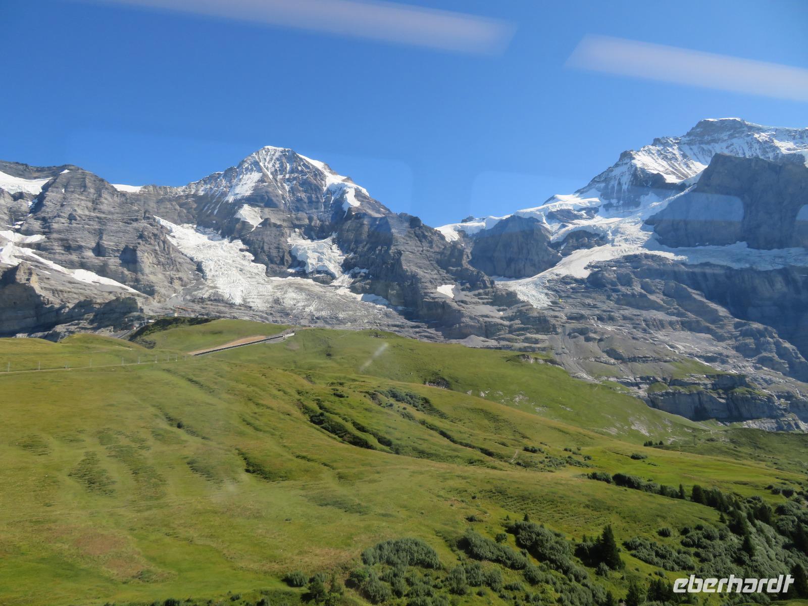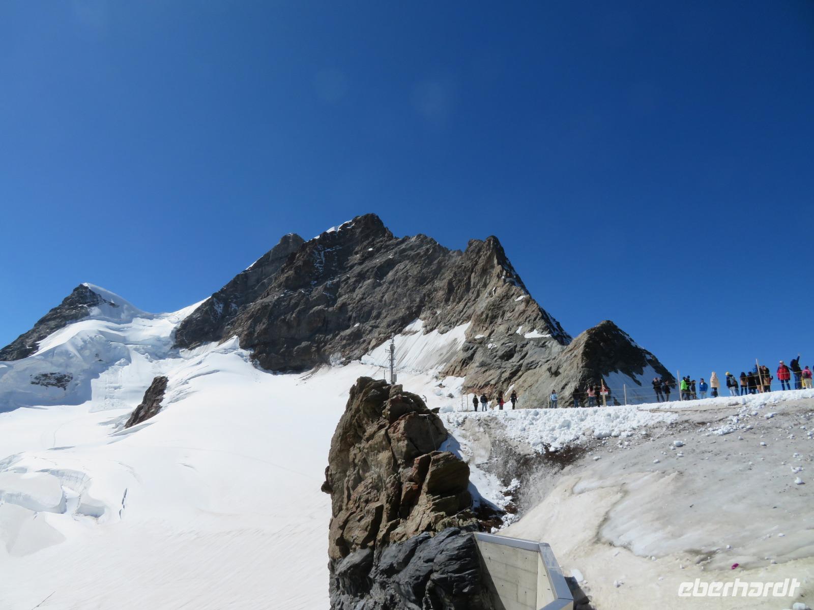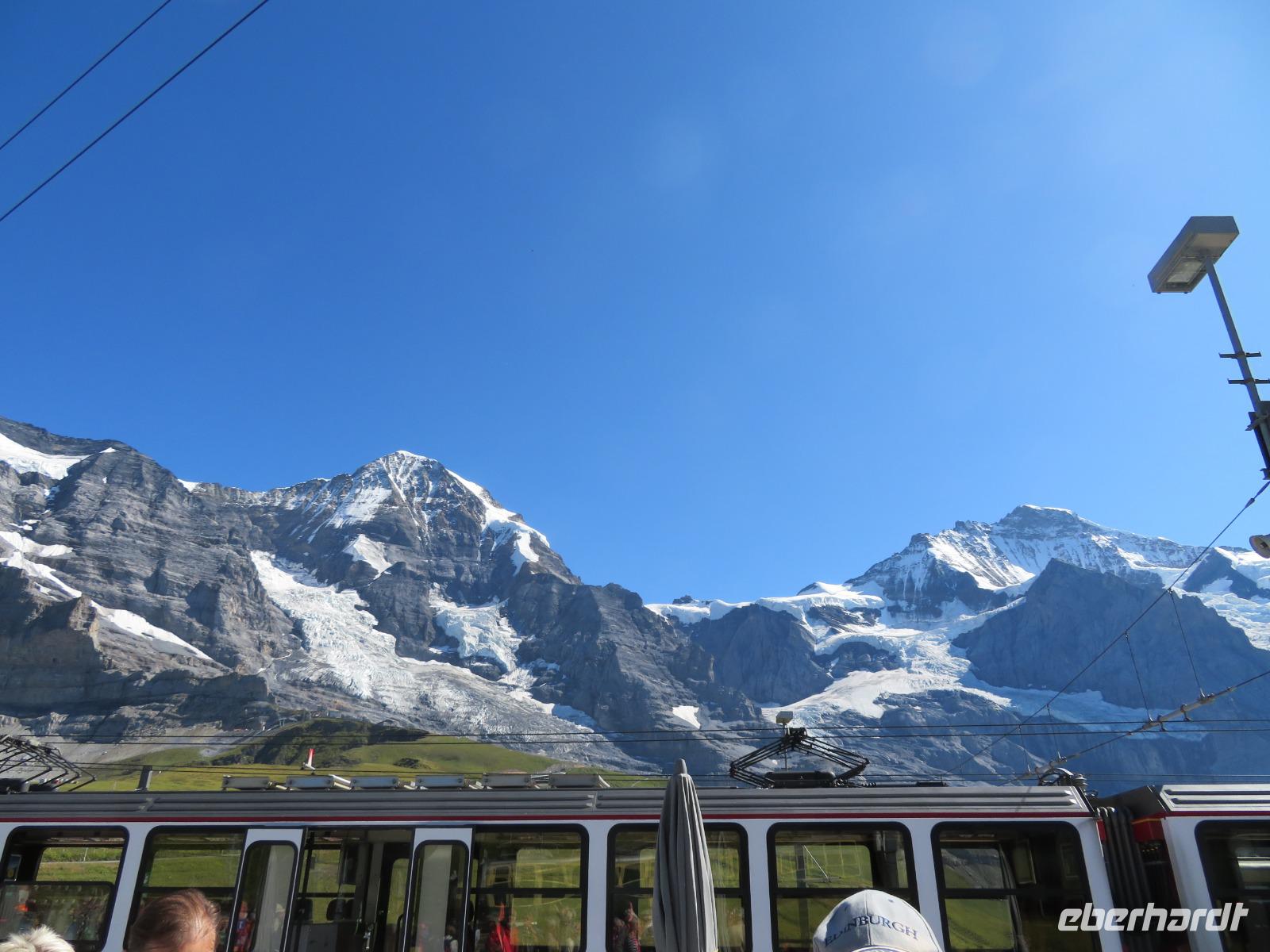 Eigentlich steht heute der Ausflug zur Aareschlucht auf unserem Programm. Da die Wettervorhersage allerdings so aussieht, dass der heutige Tag der Beste ist, haben wir das Programm getauscht. Schon am Morgen weckt uns strahlender Sonnenschein und wir sehen die Berge. Wir freuen uns auf einen erlebnisreichen Tag auf dem Jungfraujoch bei tollem Wetter. Unsere Chauffeur Micha bringt uns mit dem Bus nach Grindelwald-Grund. Hier besteigen wir die Wengeralp-Bahn fahren zur Kleinen Scheidegg. Schon während der Fahrt eröffnen sich uns einmalige Aussichten in die Bergwelt des Berner Oberlandes. Wir sehen den Männlichen und das Launberhorn. Auf der Kleinen Scheidegg erwarten uns der Eiger mit seiner berühmten Nordwand, der Mönch und die Jungfrau im gleißenden Sonnenlicht. Wir sehen bereits das Jungfraujoch, unser Ziel im herrlichen Sonnenschein. Es bleibt Zeit für viele schöne Fotos oder um einfach nur das Panorama zu genießen. Die Jungfraubahn bringt uns durch den Eiger und den Mönch auf auf das Jungfraujoch. Die Bahn legt einen kurzen Stopp ein und wir können durch Fenster zum Eismeer, einem riesigen Gletscherabbruch, schauen. Unser Aufenthalt auf dem Jungfraujoch bietet uns ausreichend Zeit, um bei dem Rundgang die einmaligen Erlebnisse zu genießen. Mit dem Lift erreichen wir den höchsten Aussichtspunkt, der Sphinx auf 3.571 Metern. Atemberaubend ist die Aussicht auf den Aletschgletscher eingerahmt von den Berner und Walliser Alpen im Sonnenschein. Unsere Blick e gehen zurück zur kleinen Scheidegg und zur Jungfrau und dem Mönch. Einfach nur fantastisch! Im Eispalast erleben wir das Gletschereis ca. 40 Meter unter der Oberfläche des Gletschers und bewundern tolle Eisplastiken. Sehr interessant ist eine Schicht Sägespäne im Eis. Die Späne brachte man 1946 in einem extrem heißen Sommer als Schutz auf den Gletscher auf. Nun entdecken wir diese Schicht im Eispalast und sie wandert ständig nach unten. Selbstverständlich versäumen es nicht, auf das Plateau und zum Aletschgletscher zu gehen. Hier stehen wir im ewigen Schnee. Uns begeistert die herrliche Bergwelt. Wir sehen aber auch, wie stark der Schnee und das Eis im heißen Sommer auf dem Jungfraujoch geschmolzen ist. In der Alpinen Sensation im Berg spazieren wir durch die Galerie, die sich mit der Geschichte des Baus der Jungfraubahn und dem Erbauer Adolf Geyer-Zeller befasst. Nach dem tollen Aufenthalt fahren wir vom Jungfraujoch mit der Bahn wieder Richtung Kleine Scheidegg. Wir wechseln nochmals die Bahn und fahren nach Lauterbrunnen. Dabei sehen wir Wengen, Mürren und das Schilthorn. Am Bahnhof in Lauterbrunnen erwartet uns unser Chauffeur Micha und wir kehren mit dem Bus nach Interlaken zum Hotel zurück. Wir sind uns alle einig: wir durften einen absoluten Traumtag erleben!