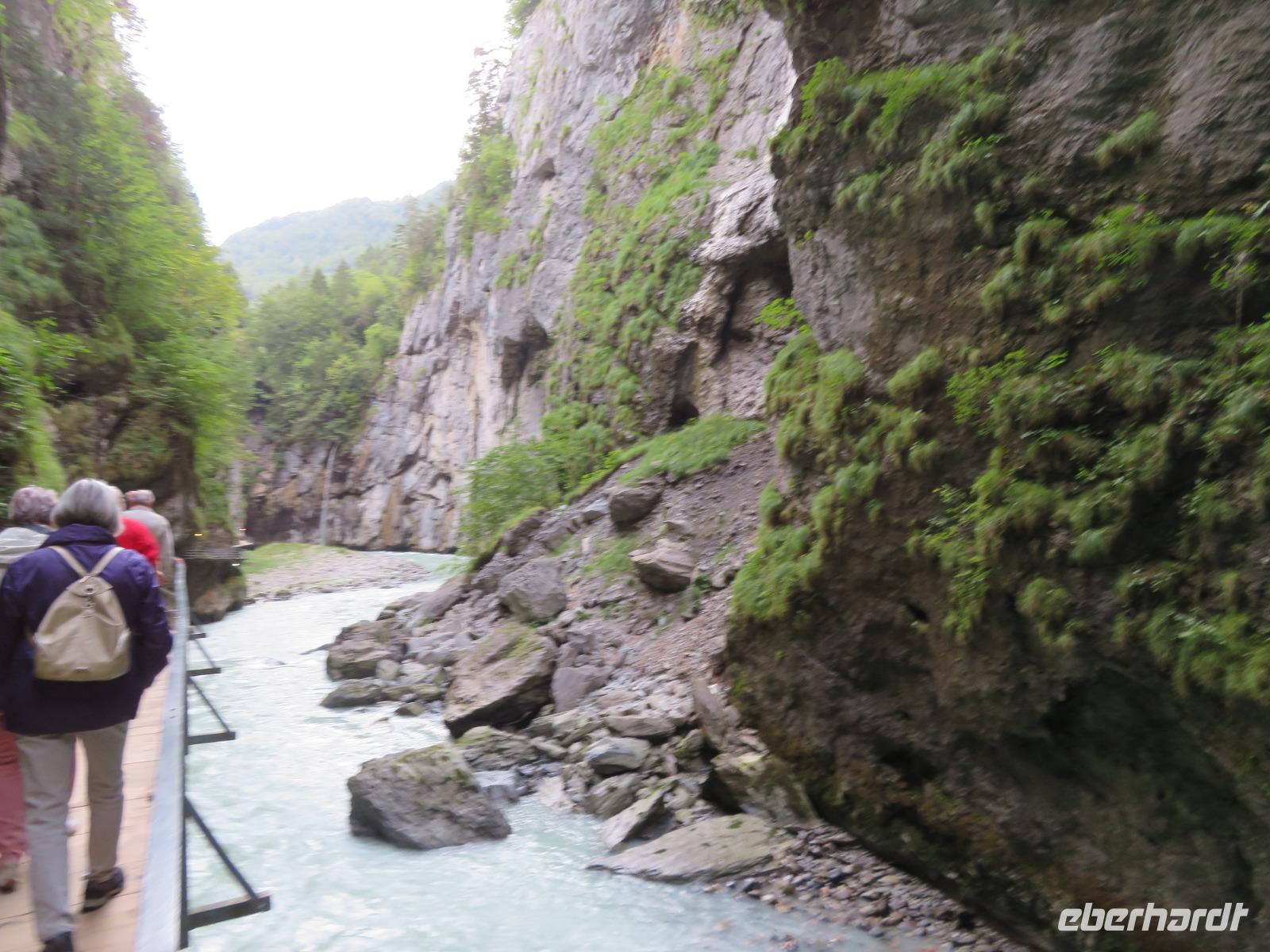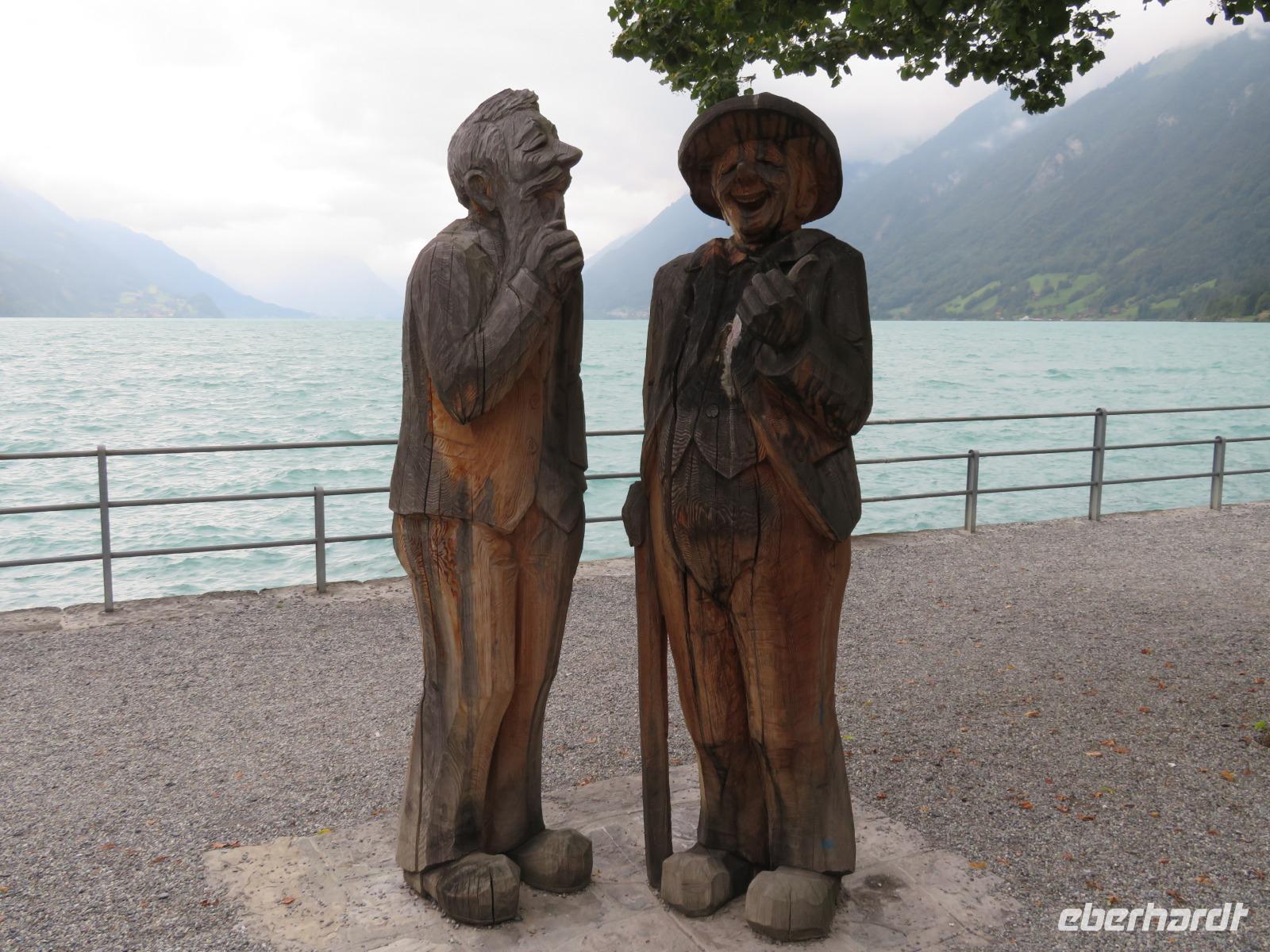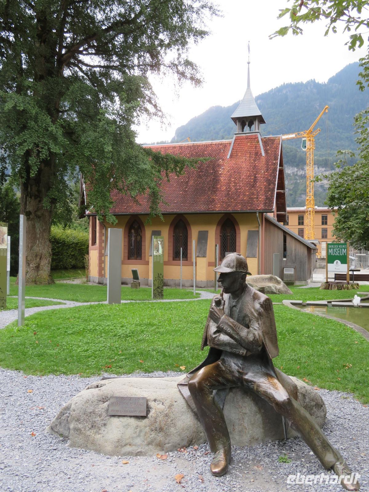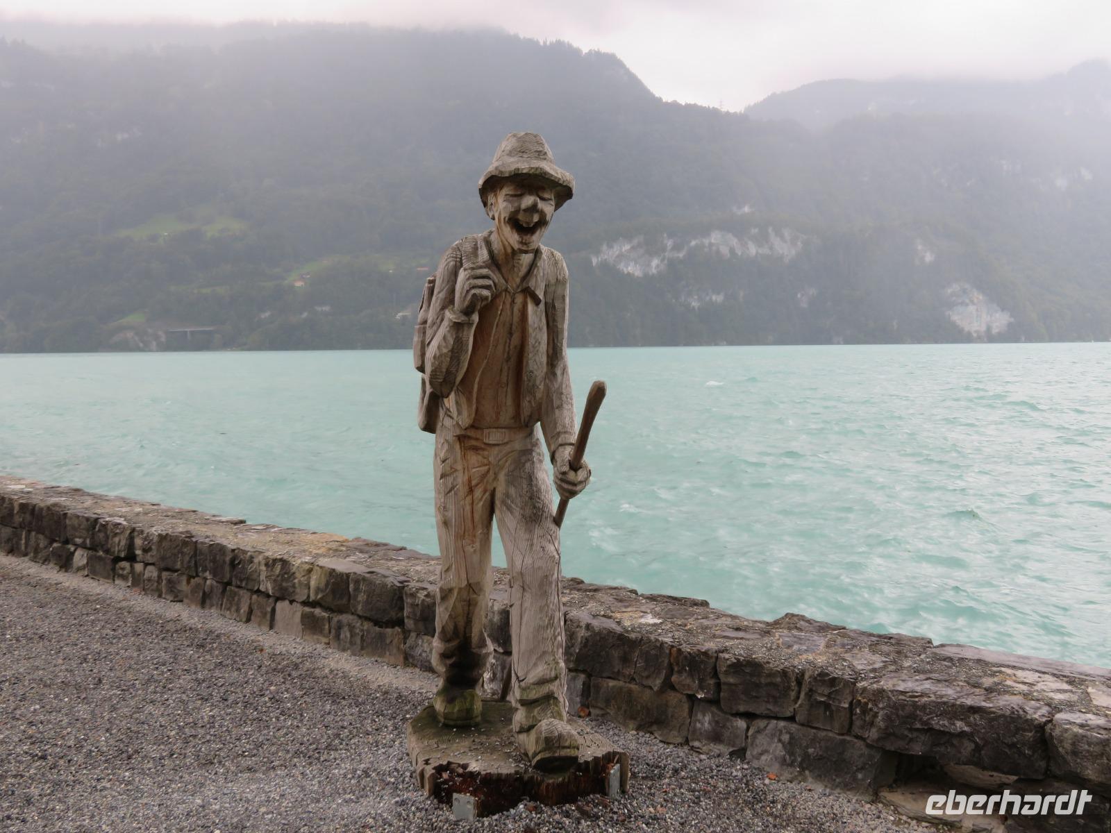 Am Morgen geht es mit unserem Bus zur Aareschlucht. Ein gewaltiger Felsriegel aus hartem Gestein versperrt seit der letzten Eiszeit den Weg der Aare durch das Haslital. Seither arbeitet sich die Aare seit vielen Millionen Jahren unaufhörlich durch den Felsriegel. Wir spazieren an imposanten bis zu 180 Meter hohen Felswänden vorbei. Dabei bestaunen wir die eindrücklichen Gletschermühlen und sehen einen Wasserfall. An der engsten Stelle zwängt sich das Wasser in nur einem Meter Breite durch das harte Gestein. Nach dem interessanten Spaziergang reisen wir weiter nach Meiringen. Arthur Canon Doule weilte einige Zeit in Meiringen und schrieb einige seiner bekannten Romane. Daran erinnern das Denkmal für Sherlok Holmes und einige Informationstafeln zur Geschichte um den vermeintlichen Tod von Sherlok Holmes am Reichenbachfall. Anschließend führt uns unsere Tour nach Brienz. Im Dorf am gleichnamigen See arbeiten und leben viele Schnitzer und Holzbildhauer. Leider fängt es nun an zu regnen, dennoch spazieren wir etwas am Seeufer entlang und entdecken einige der schönen Holzplastiken. Am frühen Nachmittag kehren wir nach Interlaken zurück und alle verbringen den Nachmittag nach ihren Wünschen.