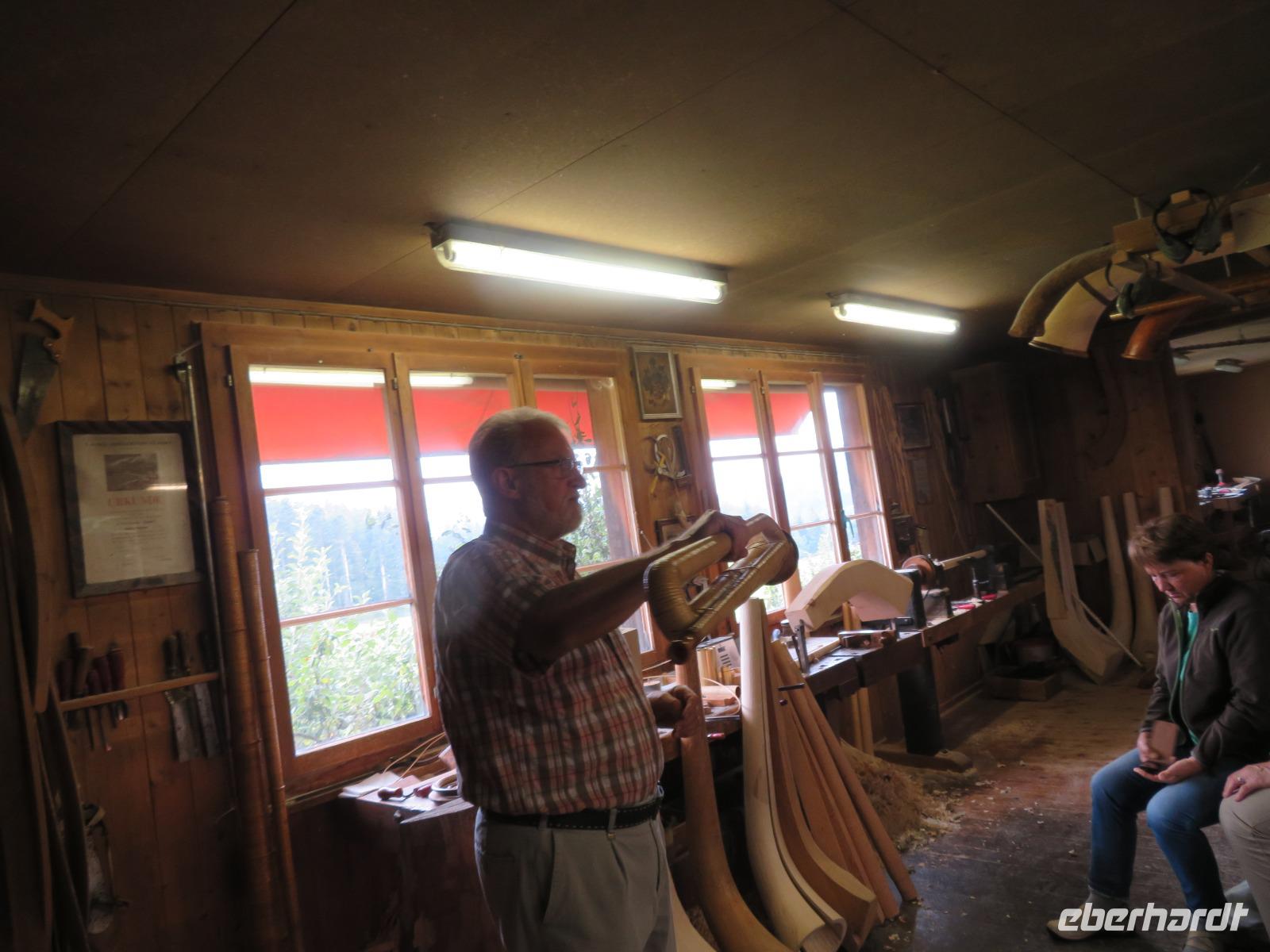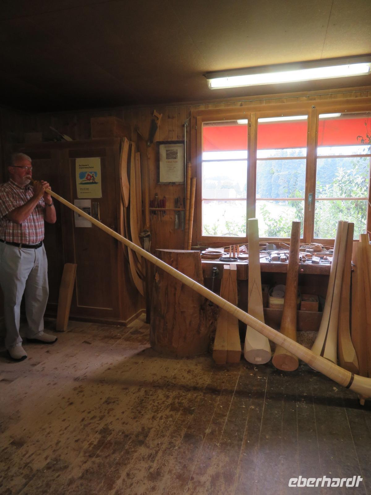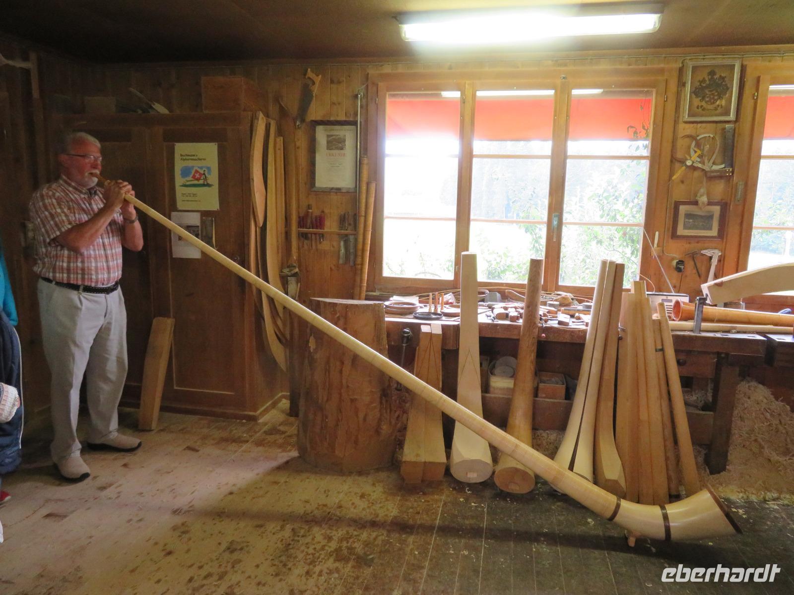 Heute erwartet uns ein spannender Ausflug in das Emmental. Das Emmental besticht durch seine liebliche Landschaft, hübsche Dörfer und viele traditionelle Handwerksbetriebe. Zunächst fahren wir nach Eggiwil. Auf dem Knubel erwartet uns Familie Bachmann in ihrer Alphornwerkstatt. Herr Bachmann erklärt uns in seiner Werkstatt sehr anschaulich die Geschichte seiner Familie, des Alphorns und dessen Herstellung. Er erzählt und demonstriert uns sehr anschaulich, wie die Alphörner aus Tannenholz in mühevoller Handarbeit gebaut werden. Nur sehr wenige Arbeitsgänge führen Herr Bachmann und sein Sohn mit Hilfe von Maschinen aus. Hobeln, Schleifen und Kleben - alles wird immer noch mit selbstgebauten Spezialwerkzeugen des Schwiegervaters von Herrn Bachmann per Hand ausgeführt. Für die Herstellung eines Alphorns benötigt Herr Bachmann etwa 80 Arbeitsstunden. Wir sind begeistert so nah und anschaulich diese Handwerkskunst kennen lernen zu dürfen. Anschließend führt uns unsere Reise weiter durch das wunderschöne Emmental mit seinen typischen Bauernhöfen nach Trubschachen. In der Erlebniswelt Kambly tauchen wir ein in die Welt der Kekse. Im Jahr 1910 kam ein junger Bäckergeselle aus dem Waadtland der Liebe wegen in das Emmental. Er lernte in einer Bäckerei und begann Brezeli - feine Biscuite-Kekse - zu backen. Seit damals schon werden hier die leckeren Kambly-Kekse gebacken. In einer kleinen Multi-Media-Show erleben wir wieder sehr anschaulich die Geschichte der Familienfirma. Wohl nur hier erleben wir eine Küche, in der sich wie von Geisterhand die Schubladen alleine öffnen und schließen, der Quirl in der Schüssel den Teig rührt und das Nudelholz diesen alleine ausrollt. So eine Küche wünscht sich wahrscheinlich jede Hausfrau. Zwei Konditorinnen beobachten wir bei der Arbeit. Natürlich können wir die vielen leckeren Kekse und Gebäcke nach Herzenslust probieren. Keiner kann diesen Köstlichkeiten widerstehen. Zu verführerisch sind die Leckereien und so wandert manch Kekstüte mit in den Bus. Wieder haben wir eine lange Handwerkstradition im Emmental kennengelernt.