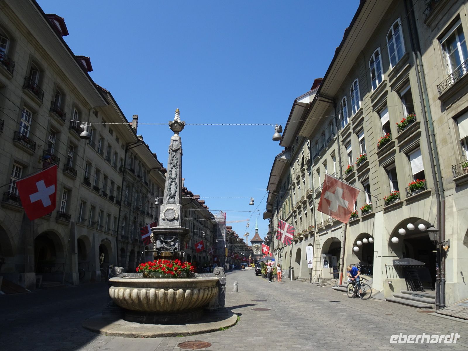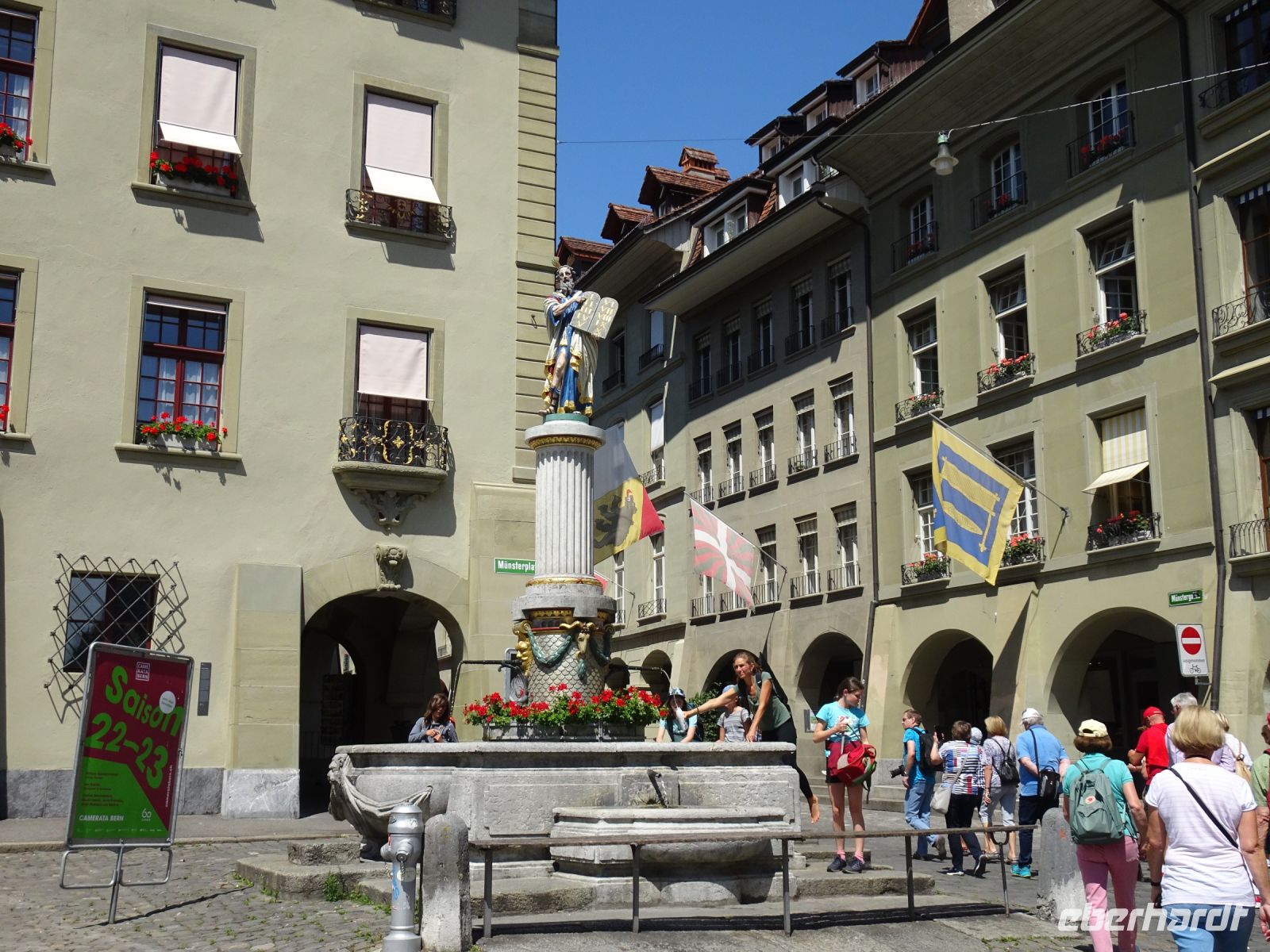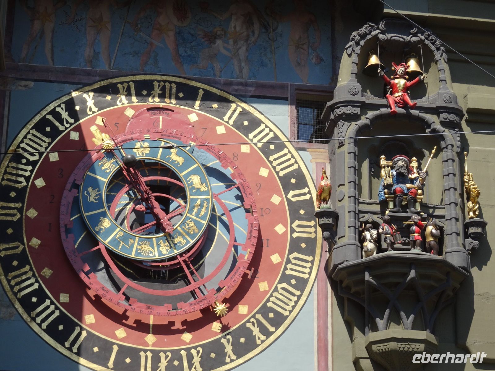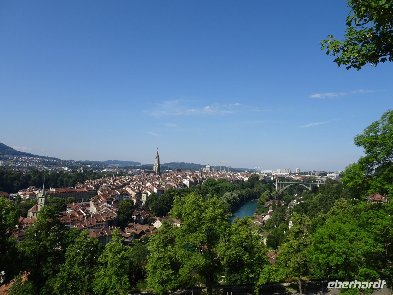 Den Vormittag verbringen wir in Bern. Unseren Stadtführer Daniel treffen wir am Bärengraben. Hier aalen sich drei Braunbären in der Sonne. Die Lebensbedingungen erscheinen uns kritisch, aber Daniel klärt uns auf, dass die Bären sich hier nur vorübergehend aufhalten, da sie ansonsten im Bärengarten wohnen und dort viel Platz zum Bärenwohlfühlen ist. Na prima. Mit dem Bus fahren wir zum Rosengarten, wo wir nicht nur die schönen Blumen bewundern können, sondern auch eine fantastische Aussicht auf Bern haben. Noch ein Stück fahren wir mit dem Bus, dann steigen wir aus und gehen zu Fuß weiter. Daniel zeigt uns die schönsten Straßen und wichtigsten Gebäude und gibt uns Tipps, wo wir uns um 12 Uhr am besten postieren, um das mechanische Wunder der Zeituhr zu beobachten. Zwei Stunden stehen nun für eigene Erkundungen zur Verfügung.