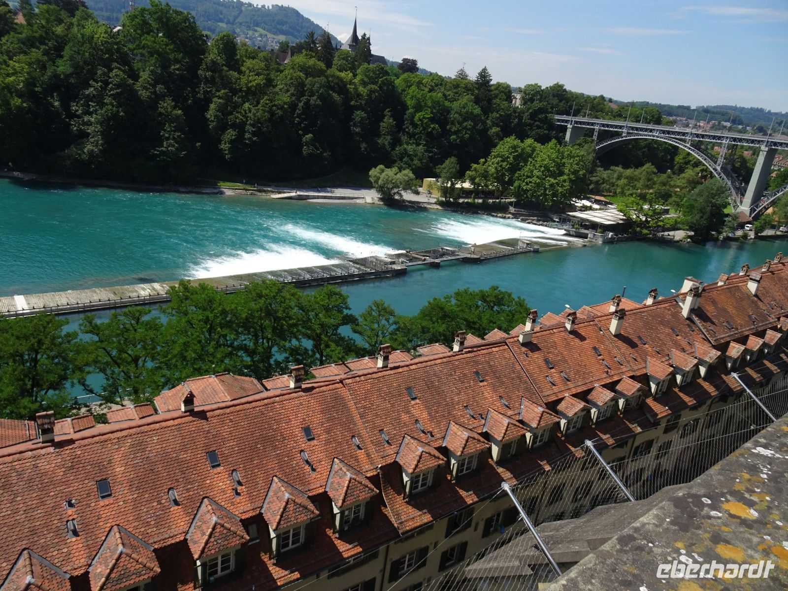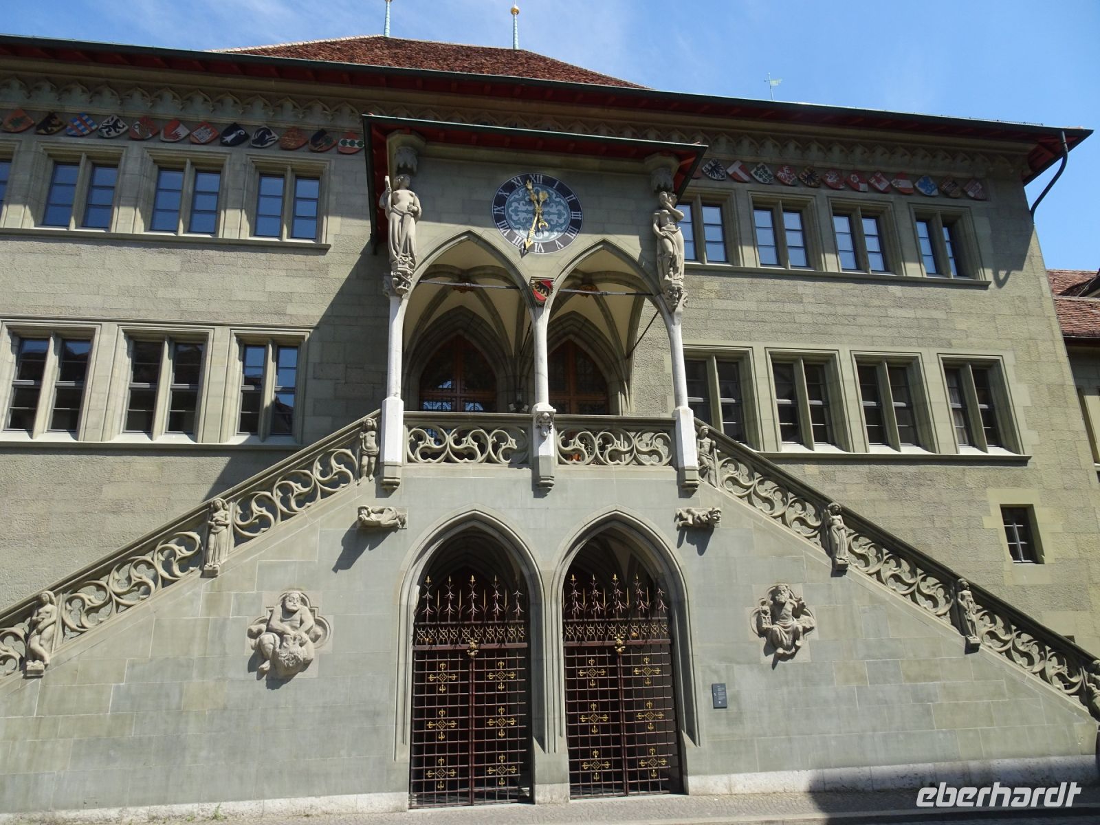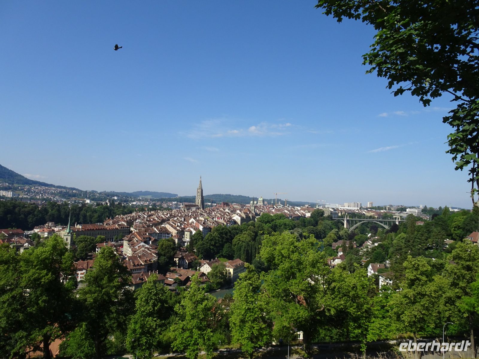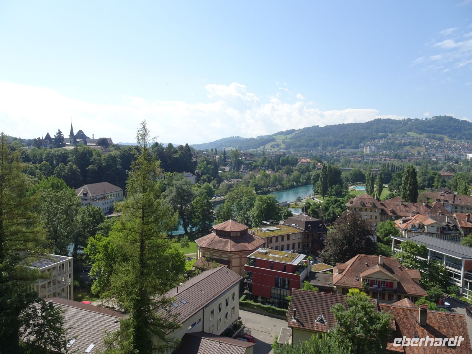 Den Vormittag verbringen wir in Bern. Unseren Stadtführer Daniel treffen wir am Bärengraben. Hier aalen sich drei Braunbären in der Sonne. Die Lebensbedingungen erscheinen uns kritisch, aber Daniel klärt uns auf, dass die Bären sich hier nur vorübergehend aufhalten, da sie ansonsten im Bärengarten wohnen und dort viel Platz zum Bärenwohlfühlen ist. Na prima. Mit dem Bus fahren wir zum Rosengarten, wo wir nicht nur die schönen Blumen bewundern können, sondern auch eine fantastische Aussicht auf Bern haben. Noch ein Stück fahren wir mit dem Bus, dann steigen wir aus und gehen zu Fuß weiter. Daniel zeigt uns die schönsten Straßen und wichtigsten Gebäude und gibt uns Tipps, wo wir uns um 12 Uhr am besten postieren, um das mechanische Wunder der Zeituhr zu beobachten. Zwei Stunden stehen nun für eigene Erkundungen zur Verfügung.