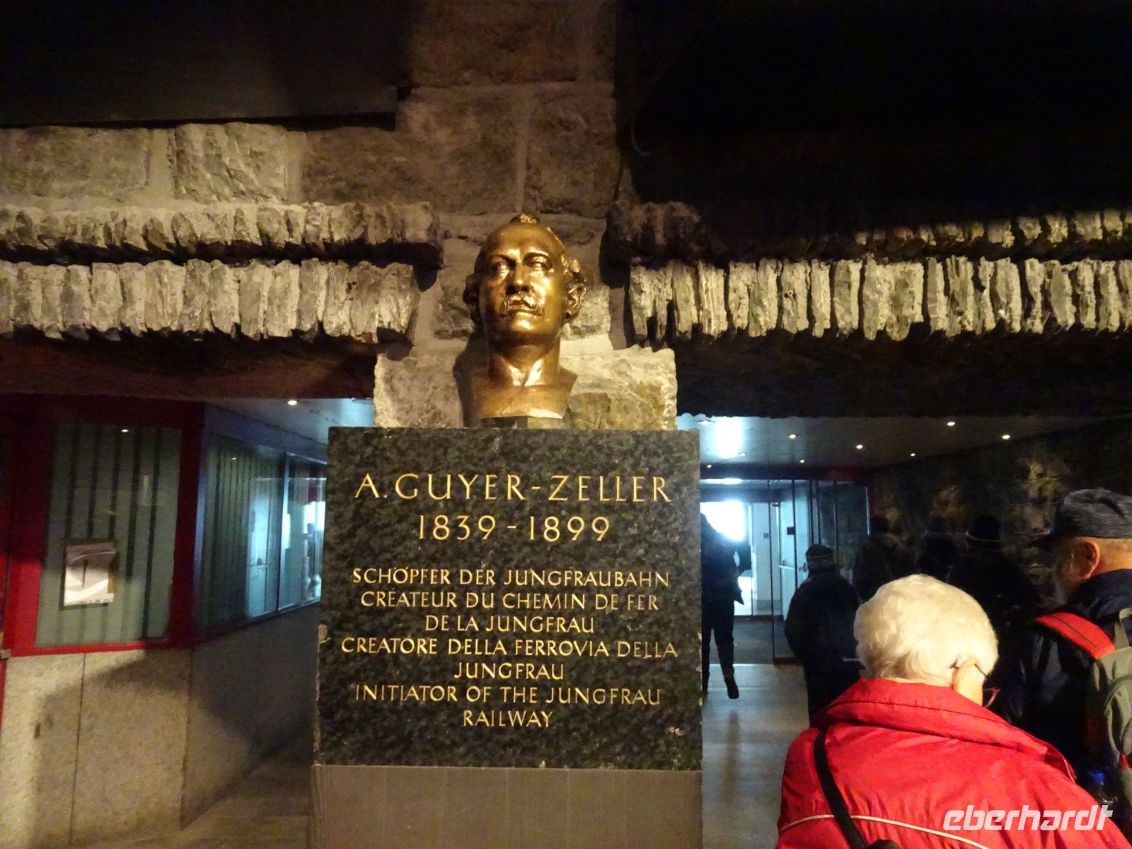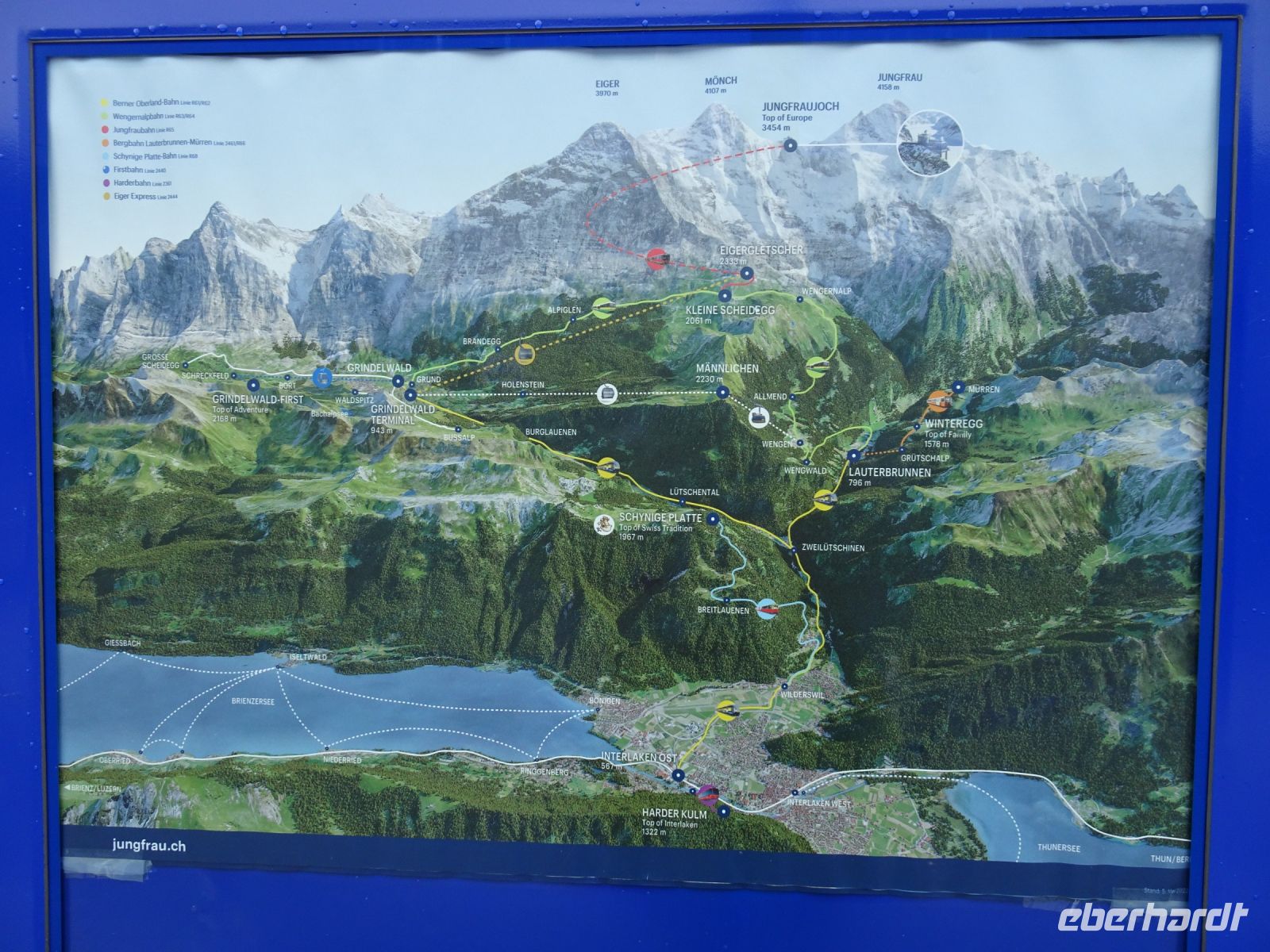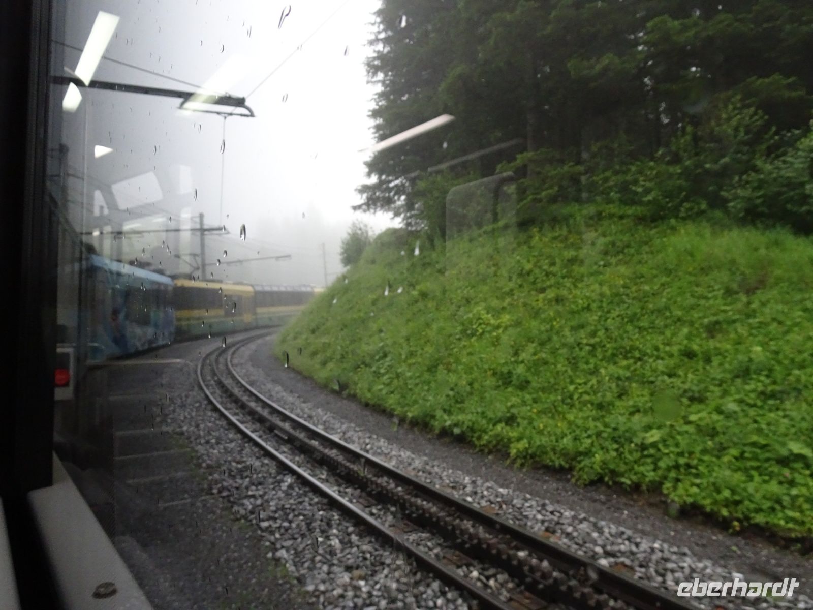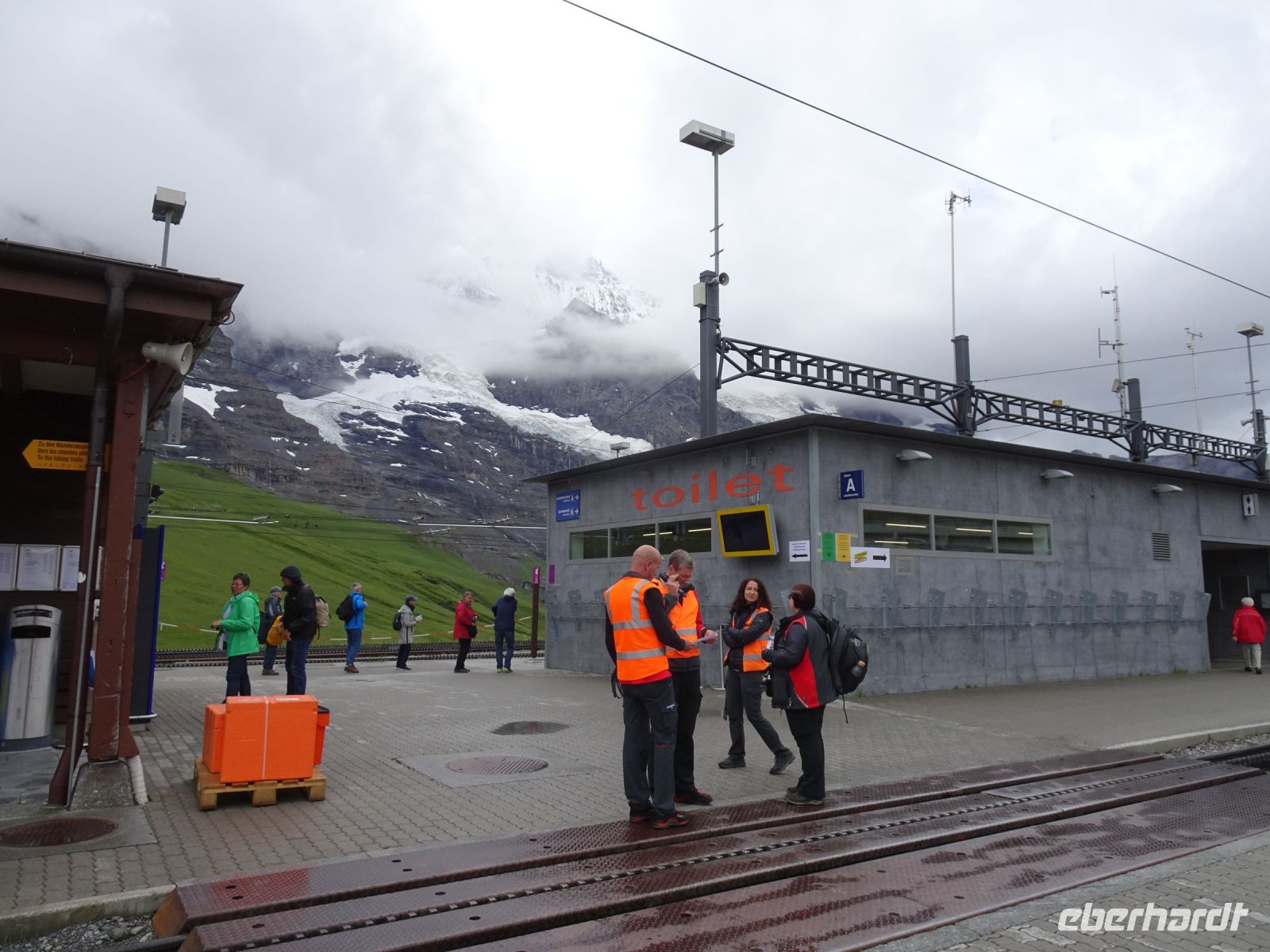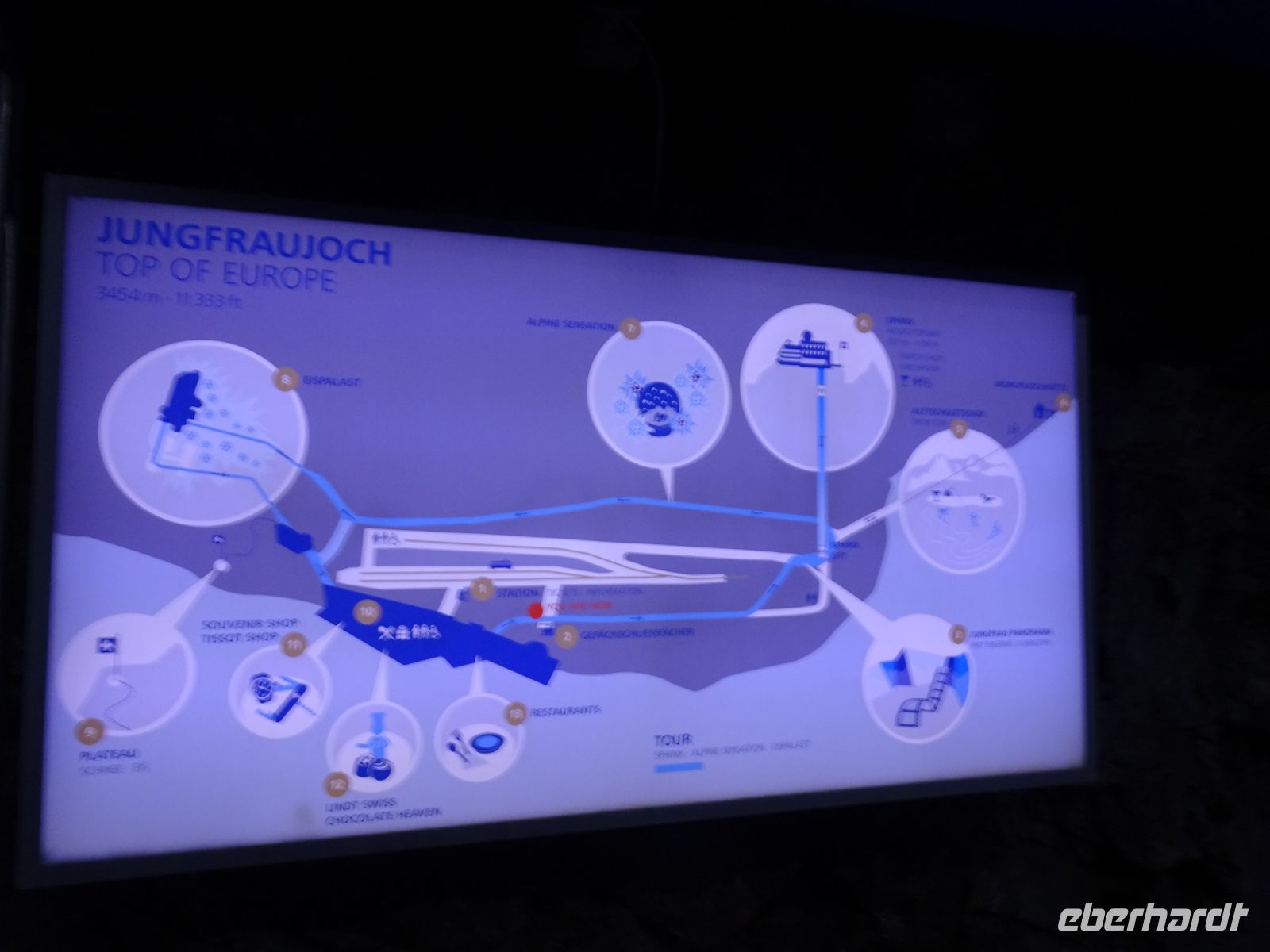 Alle Befürchtungen scheinen wahr zu werden. Der Himmel ist grau und es regnet. Ausgerechnet heute. Mit unserem Eberhardt Bus fahren wir nach Lauterbrunnen. Von hier aus geht es mit der Zahnradbahn weiter auf die Kleine Scheidegg. Weder Eiger, noch Mönch, noch Jungfrau lassen sich blicken. Ab und zu ist eine Bergspitze zu sehen, es gibt hier also welche. Rührige Bahnarbeiter begrüßen uns und zeigen uns, in welchem Wagen der Jungfraubahn Plätze für uns reserviert sind. Und es gibt eine Überraschung: wir müssen nicht am Eigergletscher umsteigen, sondern fahren bis zum Jungfraujoch durch. Unterwegs legt der Zug einen Stopp ein. Mitten im Tunnel gibt es große Fenster, von denen man einen einmaligen Blick auf den Gletscher hat. Heute leider nicht. Wir dürfen trotzdem aussteigen und uns das milchige Weiß anschauen. Am Jungfraujoch angekommen, gehen wir gemeinsam zur Haupthalle, von der aus ein Rundweg beginnt, den jeder individuell und in eigenem Tempo ablaufen kann. Etwa eine Stunde ist dafür kalkuliert, je nachdem wie lange man sich an den einzelnen Stationen aufhält, können es auch eineinhalb oder zwei Stunden werden, bleibt immer noch eine Stunde für die kulinarische Versorgung. Restaurants gibt es hier genug. Vielleicht liegt es an der katastrophalen Wettervorhersage, dass außer uns nur noch ein paar indische Gruppen und eine Gruppe Mönche heute hier sind. Im Vergleich zu anderen Zeiten ist es relativ leer. Den Rundgang beginnen wir am besten mit der Auffahrt zur Sphinx. Außer, es ist gerade eine Gruppe Inder angekommen. Mit dem Fahrstuhl erreichen wir eine Aussichtsplattform und mit ein bisschen Geduld und Glück, so wie bei uns, verzieht sich der Nebel und es eröffnet sich eine kaum zu beschreibende Bergwelt. Zurück von der Plattform folgen wir den Ausschilderungen Alpine Sensation. Hier erwartet den Besucher eine überdimensionale Schneekugel, für die wir uns etwas Zeit nehmen. Melodisch untermalt wird hier der Tagesablauf in einem Bergdorf dargestellt. Begleitet von fröhlichen Jodelgesängen bewegen sich Figuren und Eisenbahnen, öffnen sich Fenster und gehen wieder zu, ein unterhaltsames Spektakel. Wir folgen dem Weg weiter und treffen auf den Erfinder der Jungfraubahn. Anschließend gelangen wir in den Eispalast. Hier sind diverse aus Eis geschnitzte Figuren zu sehen und sogar eine spezielle Weinsorte, die in eingefrorenen Fässern reift. Hat man diese Attraktionen absolviert, bleibt noch der Weg zum Aletschgletscher. Mit passendem Schuhwerk kann man auf dem Aletschgletscher herumspazieren. Vollgesaugt mit Erlebnissen, begeben wir uns zum Bahnhof. Innerhalb einer halben Stunde erreichen wir das Terminal vom Eigergletscher und steigen hier in den Eiger-Express um. Dieser ist eine neu eröffnete Gondelbahn, die uns nach Grindelwald bringt. Etwas außerplanmäßig erwartet uns hier nicht Wolfram mit dem Eberhardt Bus, da er zu einem Notfall gerufen wurde und so fahren wir eben mit der Bahn nach Interlaken zurück.