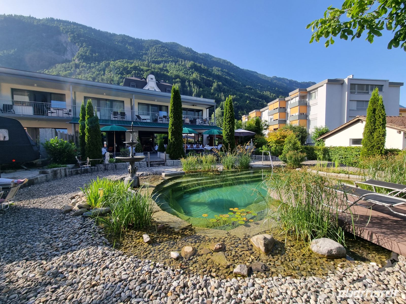 „Discovery Tour“ mit der futuristischen Sphinx-Aussichtsplattform, die atemberaubende Blicke auf die Gletscherwelt und das ewige Eis bot. Ebenso beeindruckend war der Besuch des Eispalasts mit seinen kunstvoll gestalteten Eisskulpturen. Auf dem Rückweg stiegen wir an der Station Eigergletscher aus und wechselten in den modernen Eiger Express. Die spektakuläre Seilbahnfahrt führte uns mit Blick auf Eiger-Nordwand und Gletschervorfeld hinunter zum Grindelwald Terminal, wo wir von unserem zuverlässigen Buschauffeur Daniel erwartet wurden. Mit dem Reisebus traten wir die entspannte Rückfahrt nach Interlaken an. Den erlebnisreichen Tag ließen wir stilvoll ausklingen: beim Abendessen auf der Terrasse des Hotels „Carlton-Europe“, mit Blick auf den idyllischen Naturbadeteich im Garten – und in der Ferne glänzte die Jungfrau im Abendlicht. Ein wahrhaft würdiger Abschluss eines unvergesslichen Ausfluges in die Hochalpen!