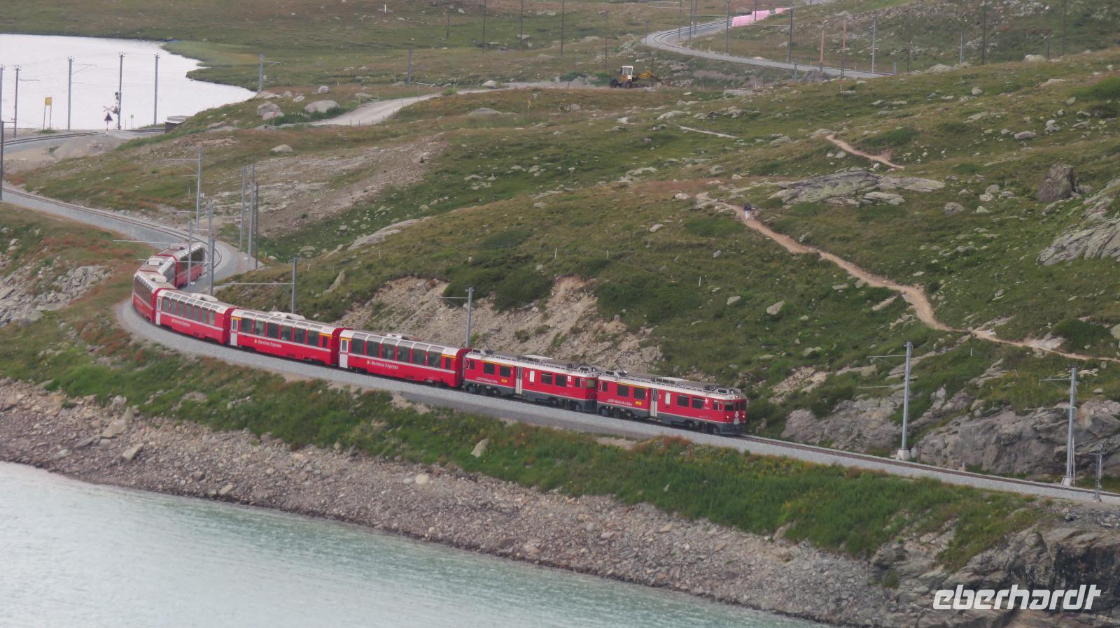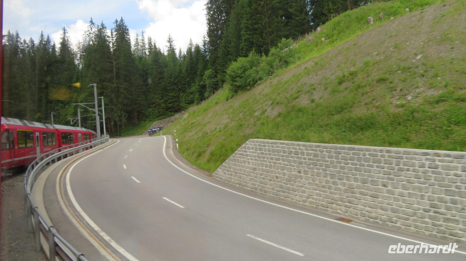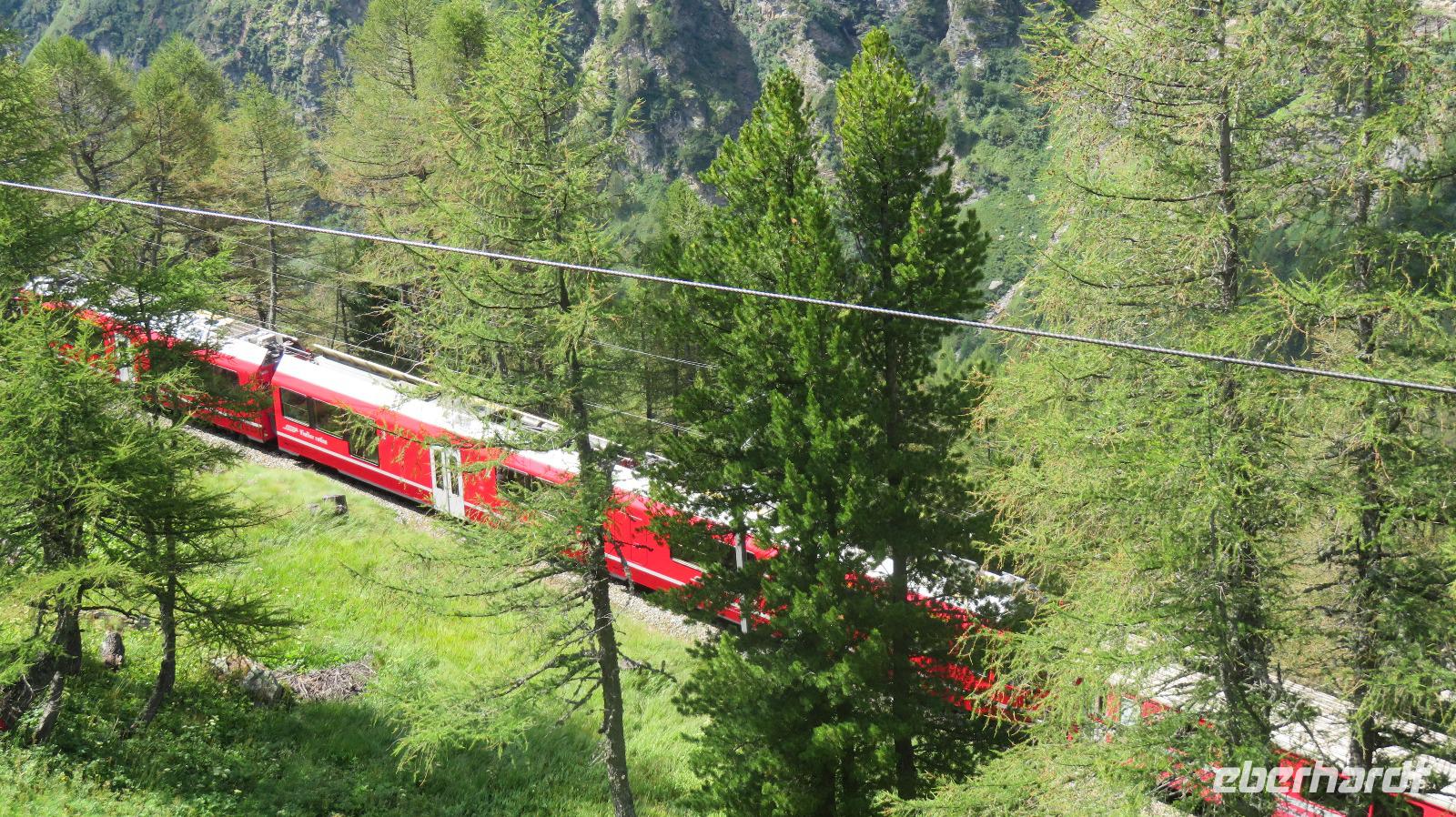 Wir freuten uns auf die schöne Fahrt mit dem Bernina Express. Wir starteten wieder in Tiefencastel und fuhren bis nach Tirano. Eine Fahrt von den Alpen in das mediterane Tirano auf der schönsten Bahnstrecke der Alpen erwartete uns. Den ersten Höhepunkt gab es In Filisur, dort konnten wir das Landwasserviadukt bestaunen. Immer wieder folgten spektakuläre Aussichten. Der Zug erreichte seinen höchsten Punkt in 2253m Höhe den Bahnhof Ospizio Bernina. Nun ging es stätig abwärts. Durch das Valposchiavo Tal vorbei am gleichnamigen See erreichten wir das Kreisviadukt in Brusio. Das beeindruckendste Bauwerk des Bernina Express verlängert die Strecke um damit den Höhenunterschied auszugleichen. Von dort fuhr der Bernina Express als Straßenbahn nach Tirano. Dort angekommen spürten wir das besondere Klima. Es war sehr heiß. In einem typischen Restaurant kehrten wir zum Mittagessen ein. Anschließend fuhren wir auf den Bernina Pass auf 2330m Höhe. Vor uns lag der Morteratschgletscher, mit einer Länge von 6,4 km ist er der drittgrößte Gletscher der Ostalpen. Vorbei an St. Moritz erreichten wir wieder den Julierpass und unser Hotel. Das Wetter änderte sich und es fing an zu regnen.