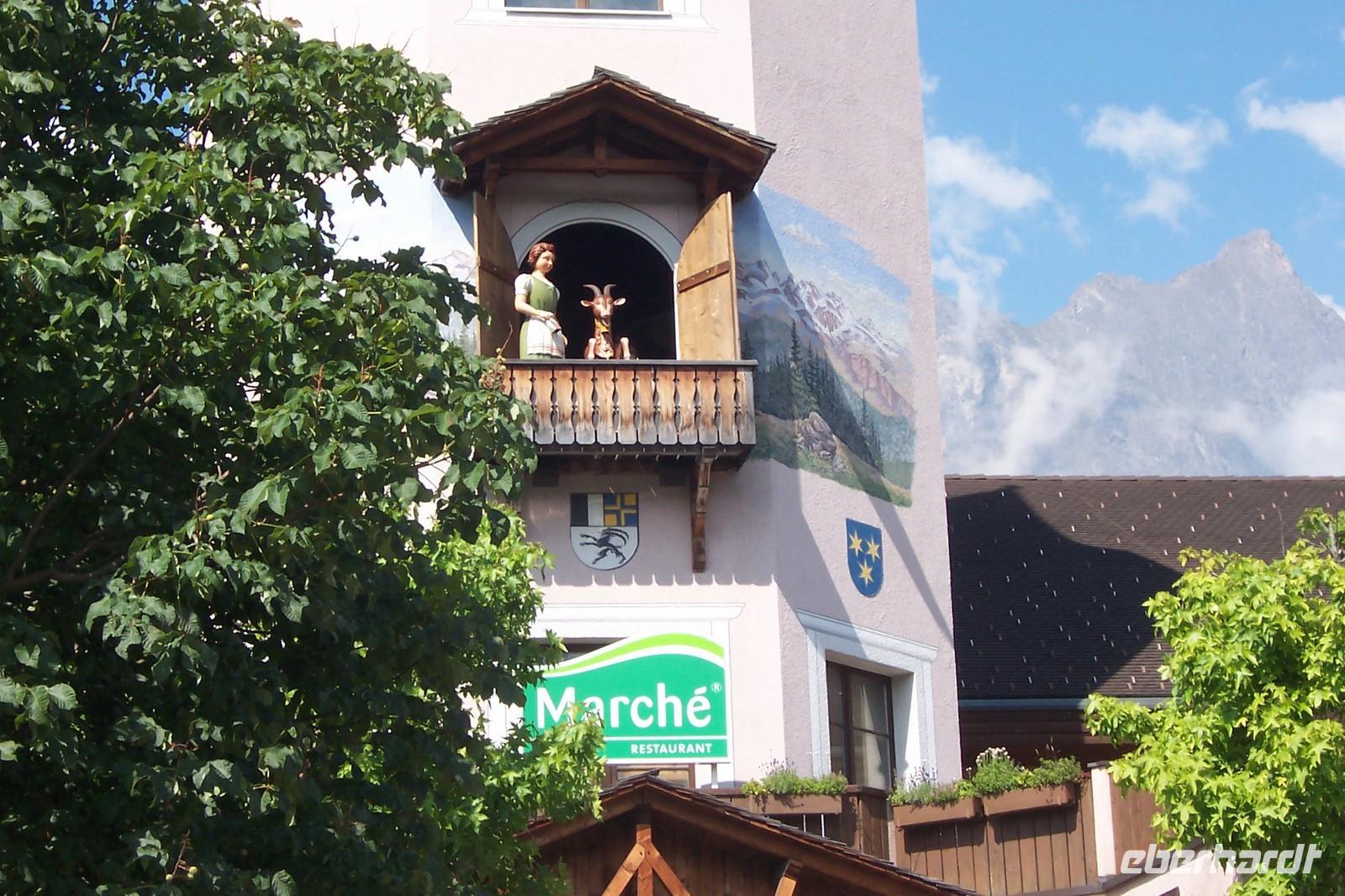 Weiter geht es zum Markt mit dem reizvollen Murmeltierbrunnen, dem Museum und der Kirche St. Mauritius und Bergsteigerfriedhof. Die Straßen sind noch leer und wir können den schönen Ort genießen.