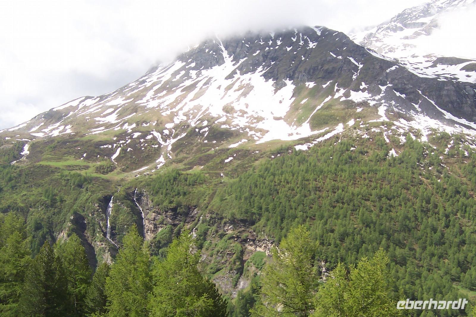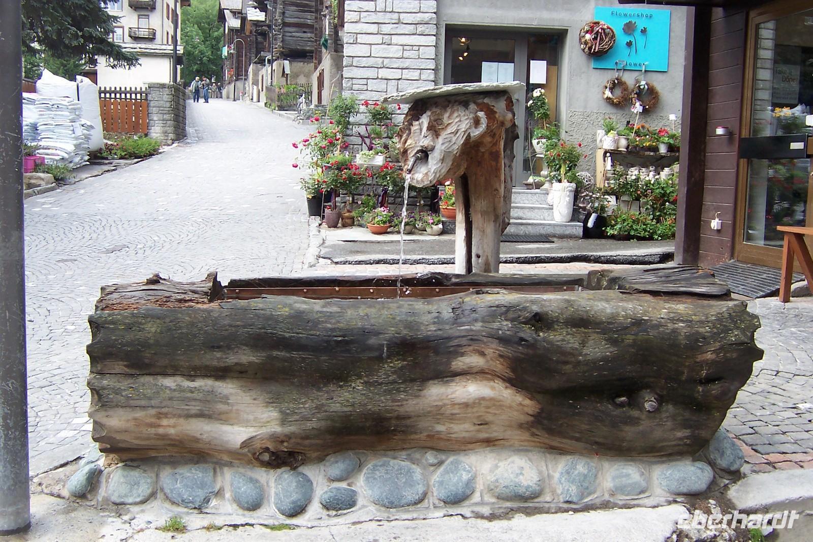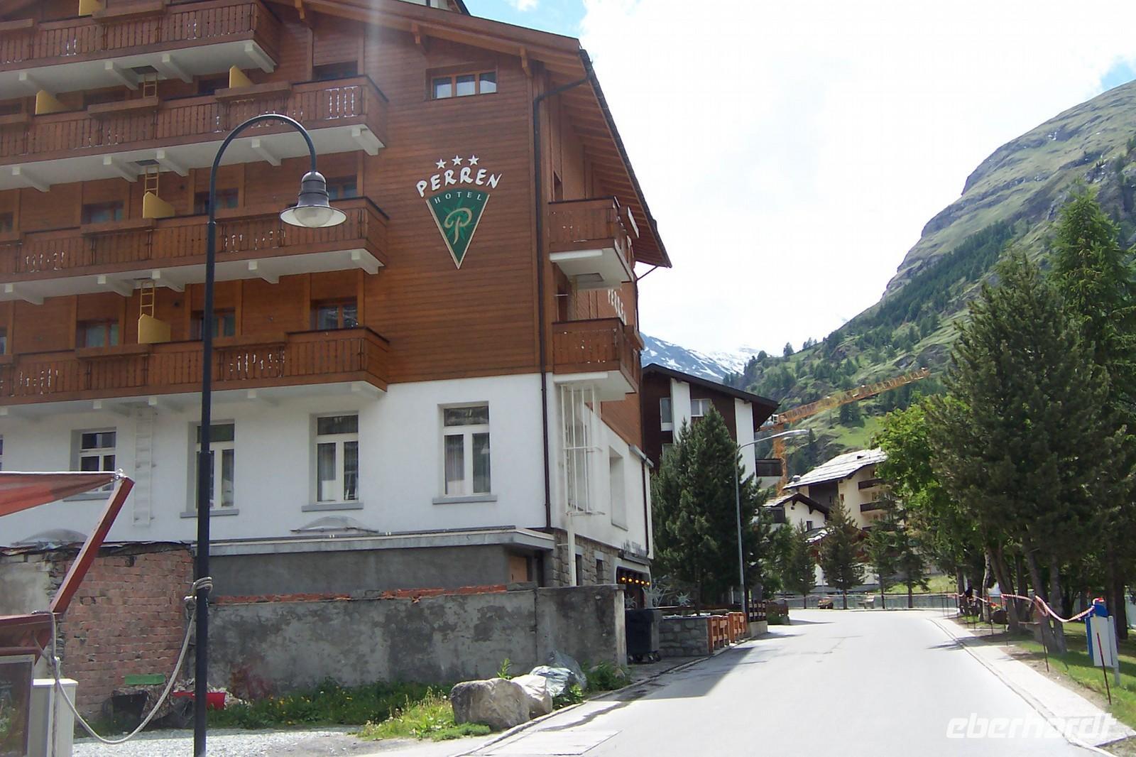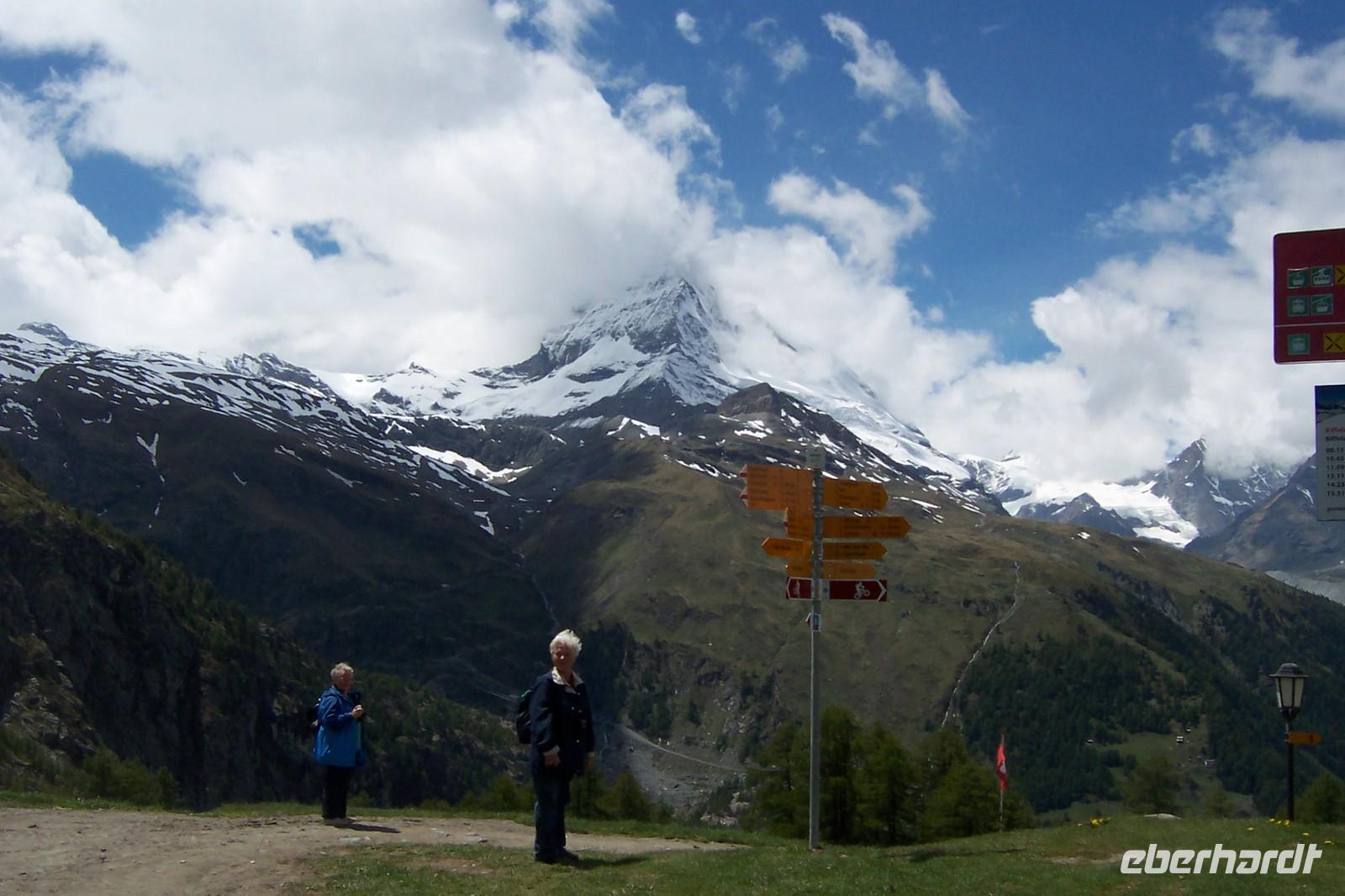 Unser Ziel sollte heute der Gornergrat sein. Das Wetter spielt nicht mit. Die Berge sind nicht zu sehen. Wir ändern das Programm und bummeln durch Zermatt. Entlang der 600 m langen Bahnhofstraße, zur Englichen Kirche mit Bergsteigergräbern, durch das alte Zermatt mit den schönen Häusern und einigen Speichern aus Lärchenholz im Walliser Baustil, mit den Mäuseplatten.