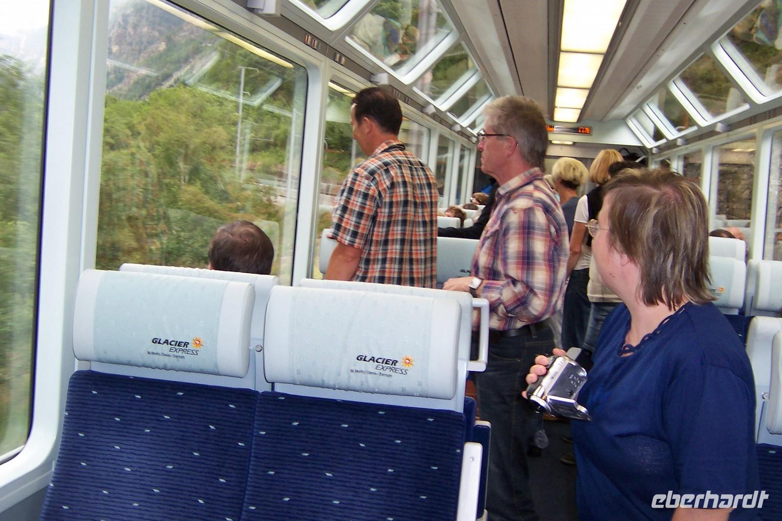 10.00 Uhr laufen wir zum Bahnhof in Davos. Der ?langsamste Schnellzug der Welt? steht bereit. Eine Reservierung für Eberhardt Gäste zeigt uns unseren Waggon. Die Fotografen wollen natürlich ans Fenster. Aber die Panoramawagen des Glacier Expresses bieten allen Gästen eine allerbeste Aussicht auf die Umgebung. Unsere Panoramafahrt kann beginnen.